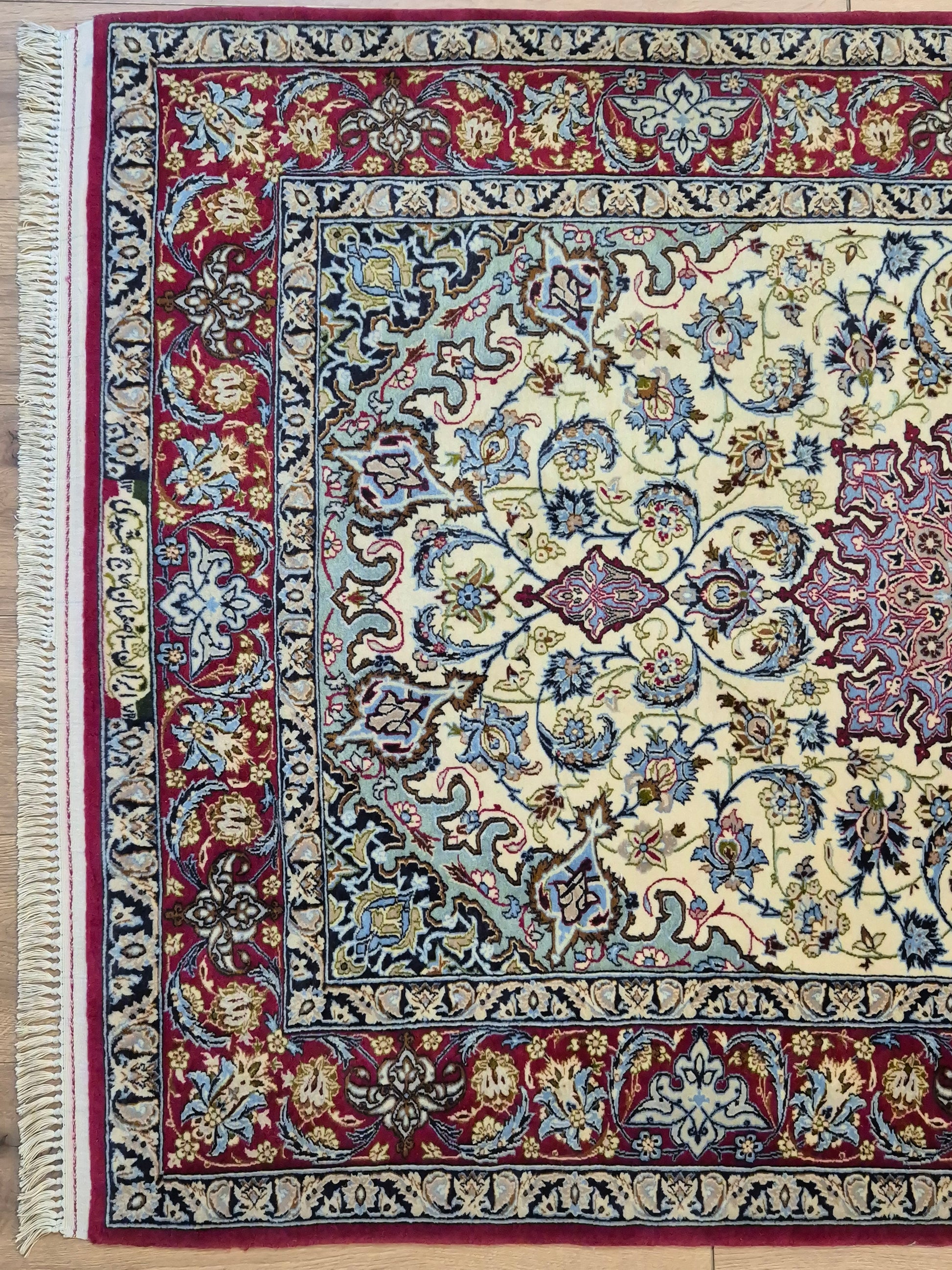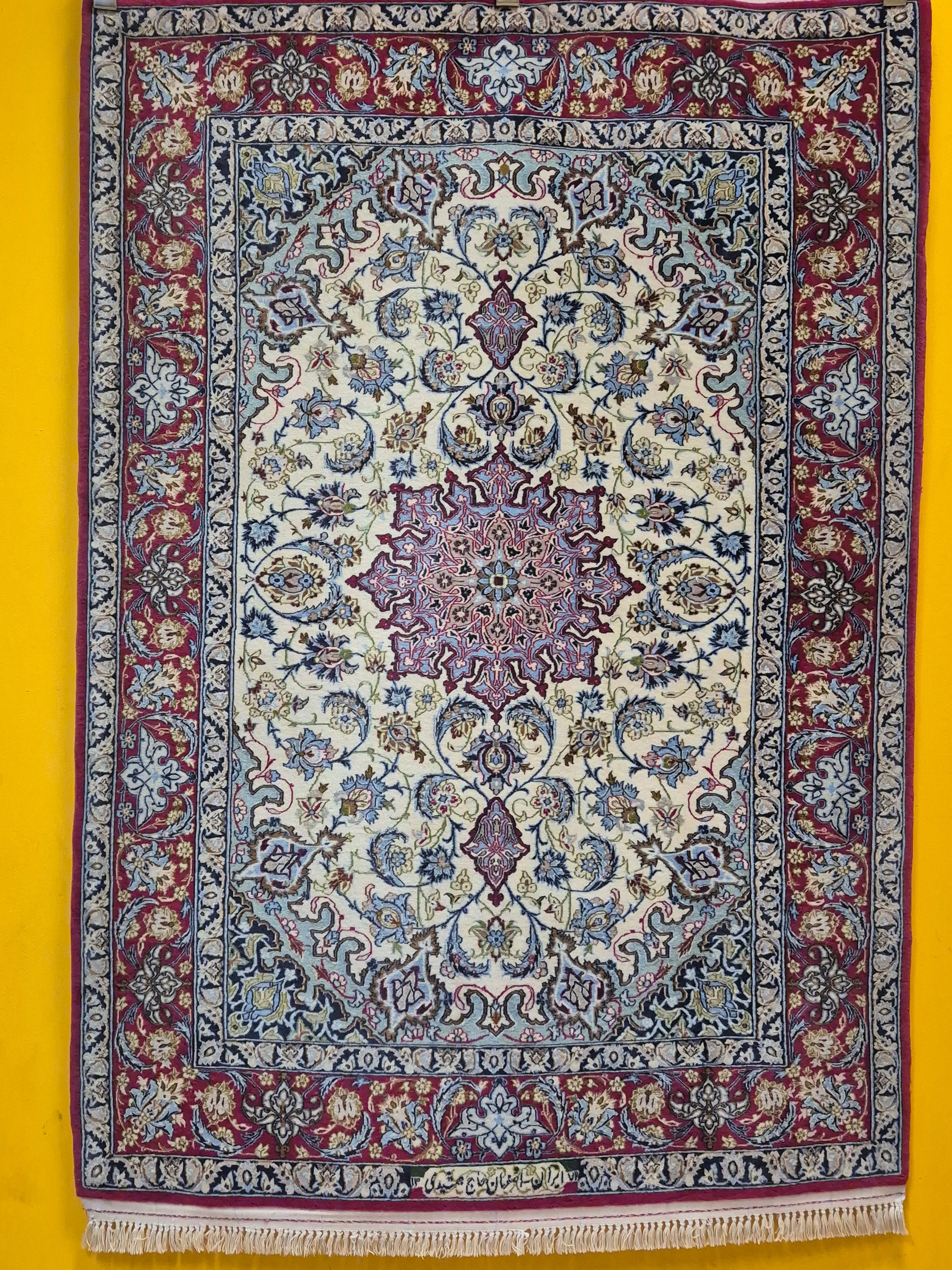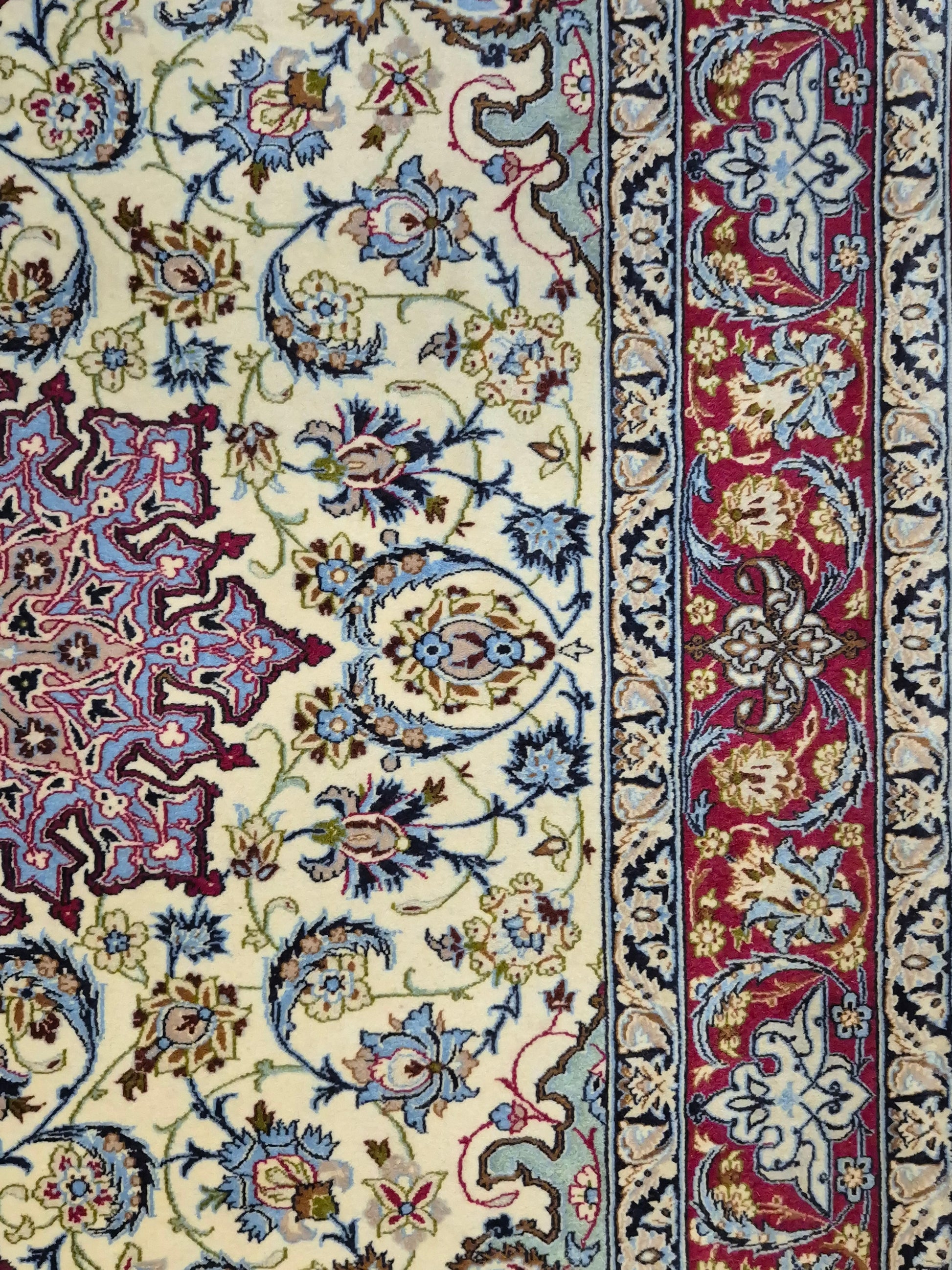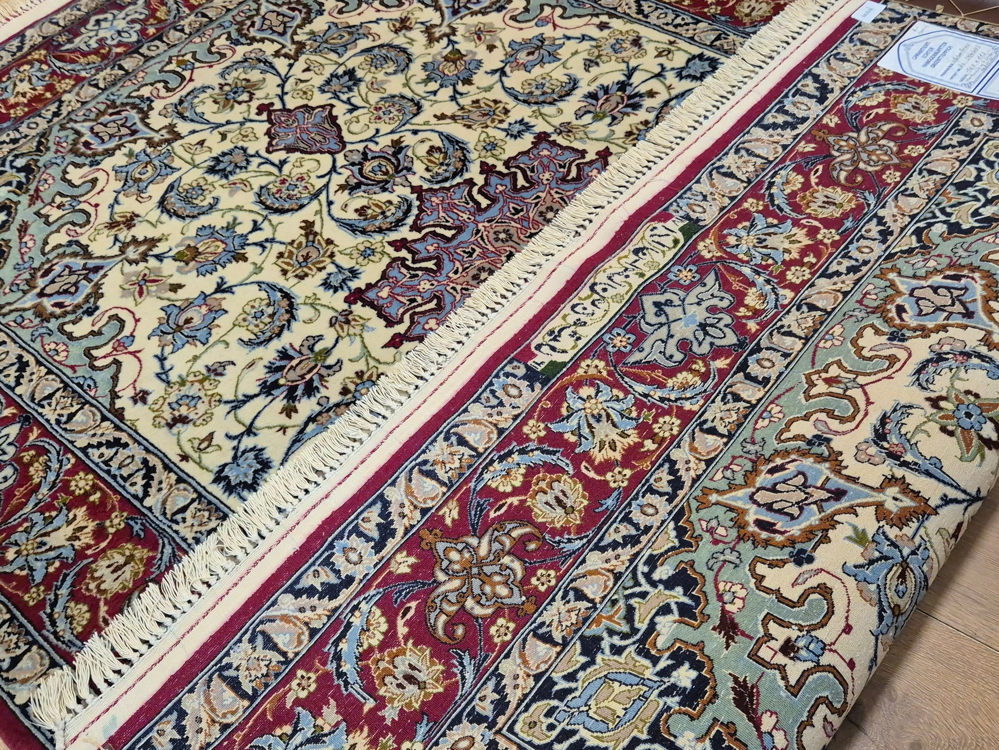 angeboten wird ein edler Isfahan Teppich aus feiner Korkwolle mit Seidenanteilen, handgeknüpft auf Seide. Das kunstvolle Design wird von einem zentralen Medaillon dominiert, das von fein ausgearbeiteten Blüten- und Rankenmustern umgeben ist. Die kräftige Bordüre in Rot mit floralen Ornamenten bildet einen harmonischen Rahmen. Durch die Signatur des Knüpfmeisters erhält dieser Teppich eine besondere Authentizität.