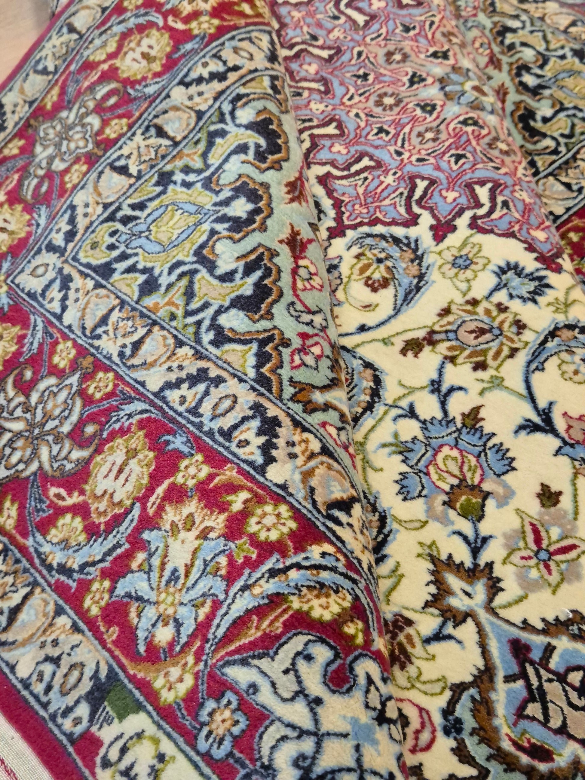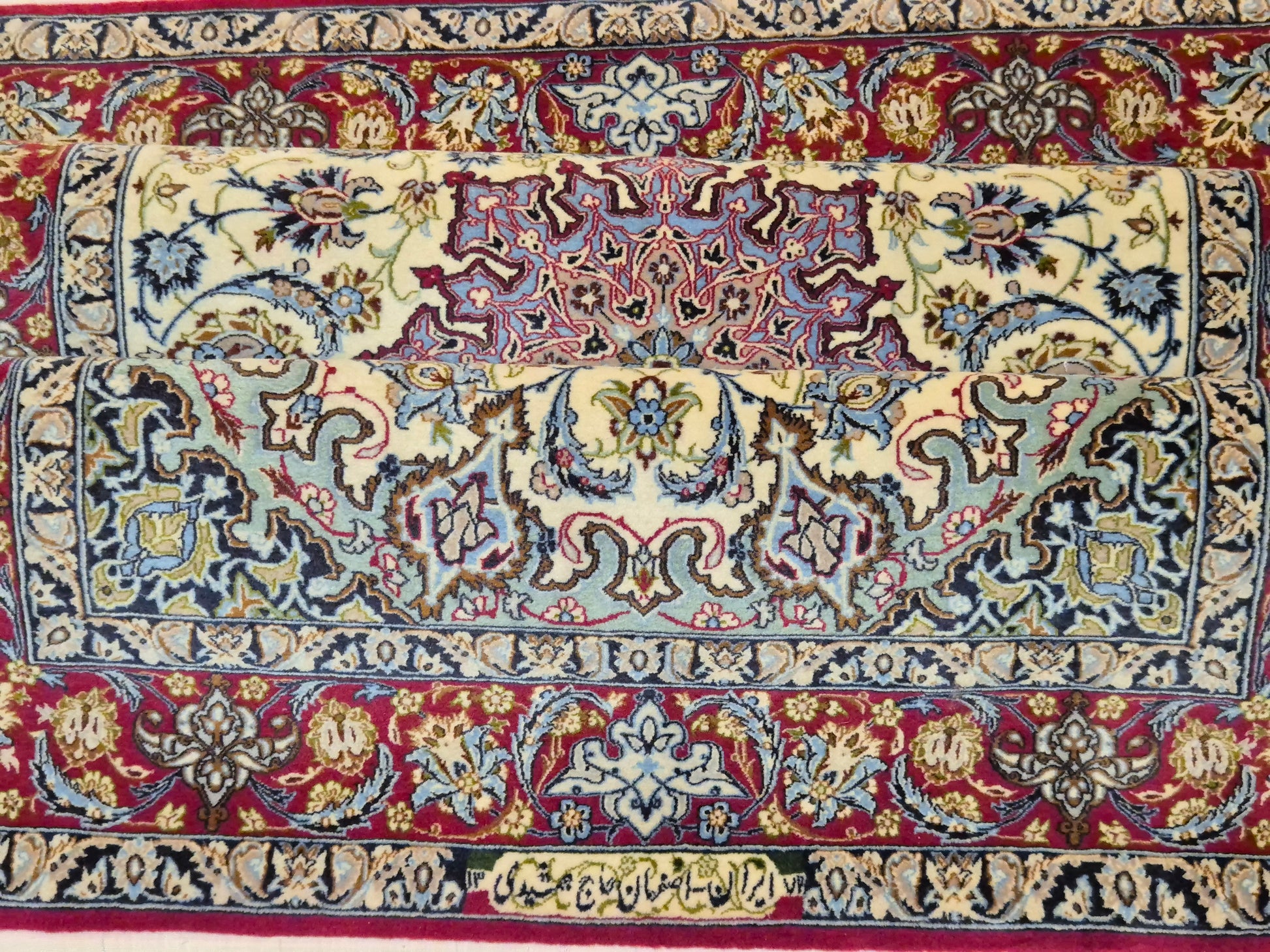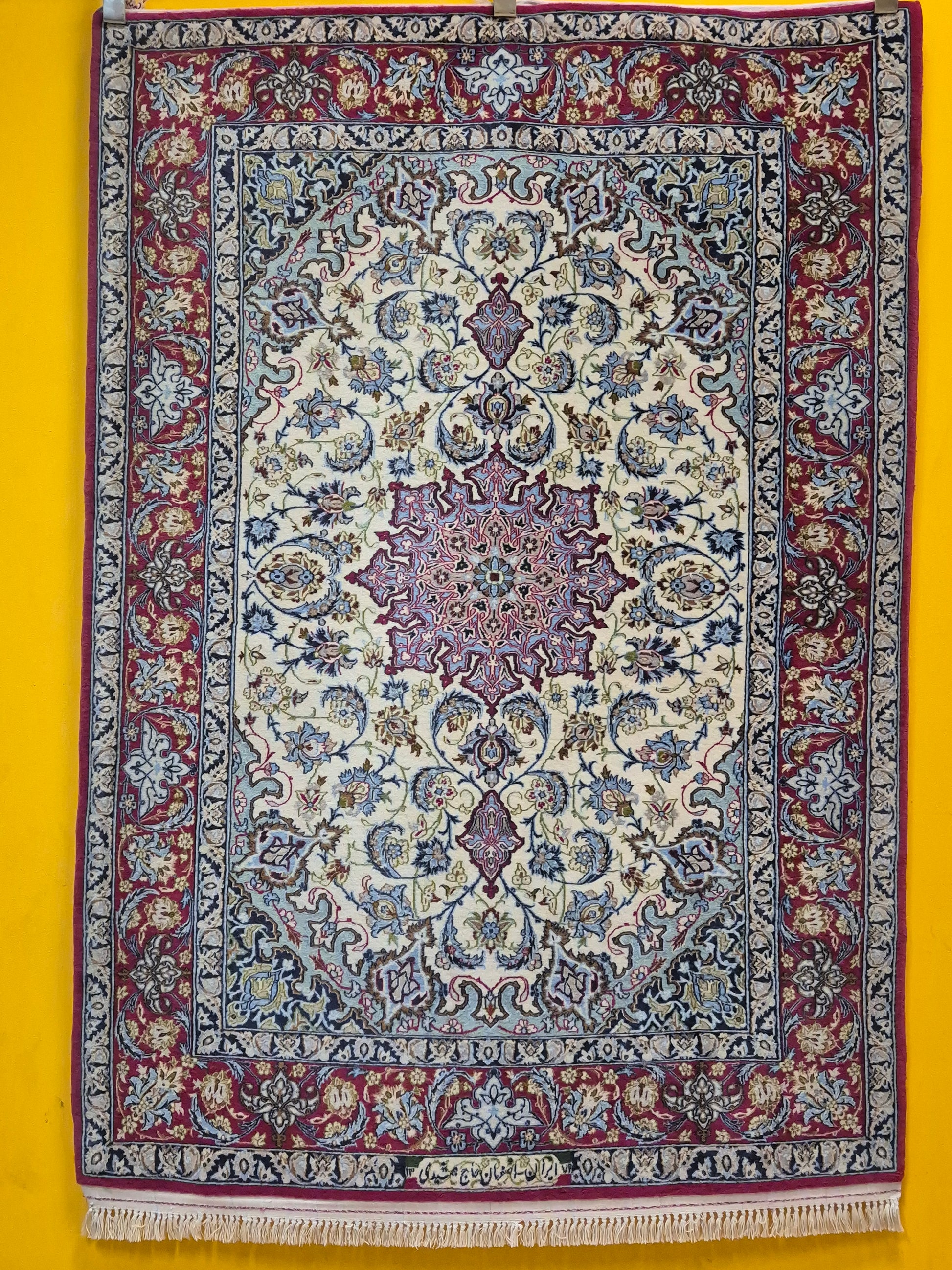 angeboten wird ein edler Isfahan Teppich aus feiner Korkwolle mit Seidenanteilen, handgeknüpft auf Seide. Das kunstvolle Design wird von einem zentralen Medaillon dominiert, das von fein ausgearbeiteten Blüten- und Rankenmustern umgeben ist. Die kräftige Bordüre in Rot mit floralen Ornamenten bildet einen harmonischen Rahmen. Durch die Signatur des Knüpfmeisters erhält dieser Teppich eine besondere Authentizität.