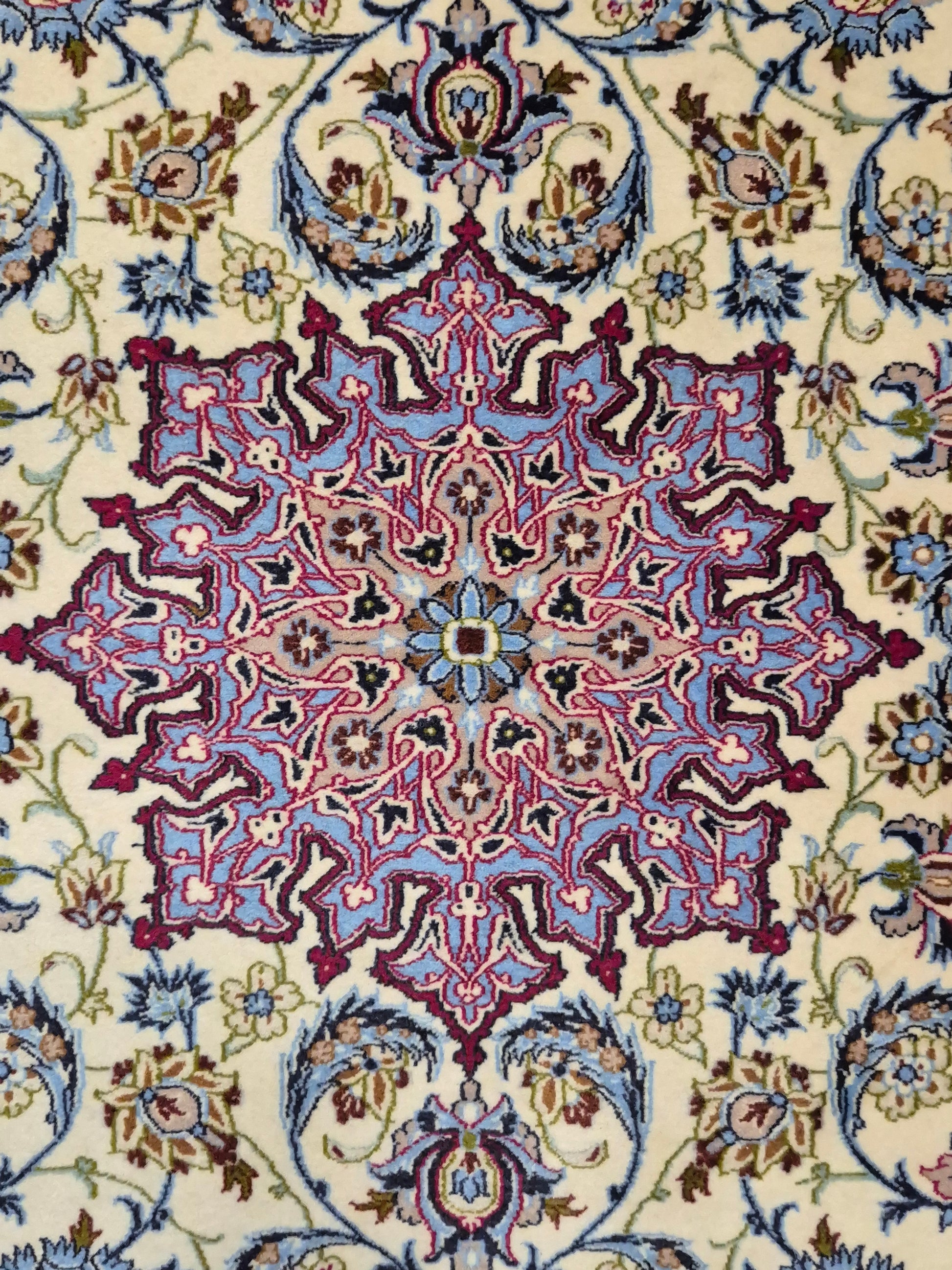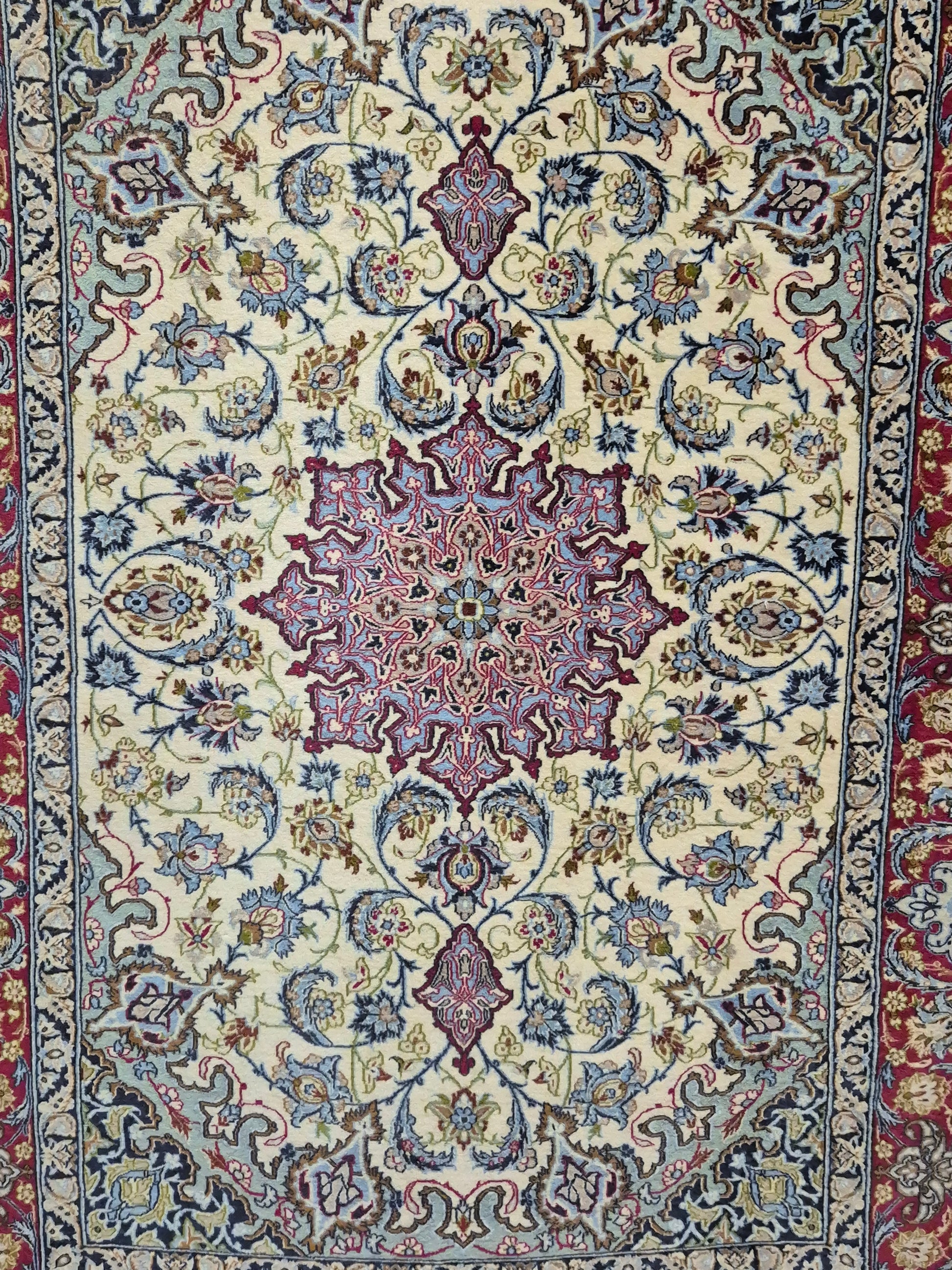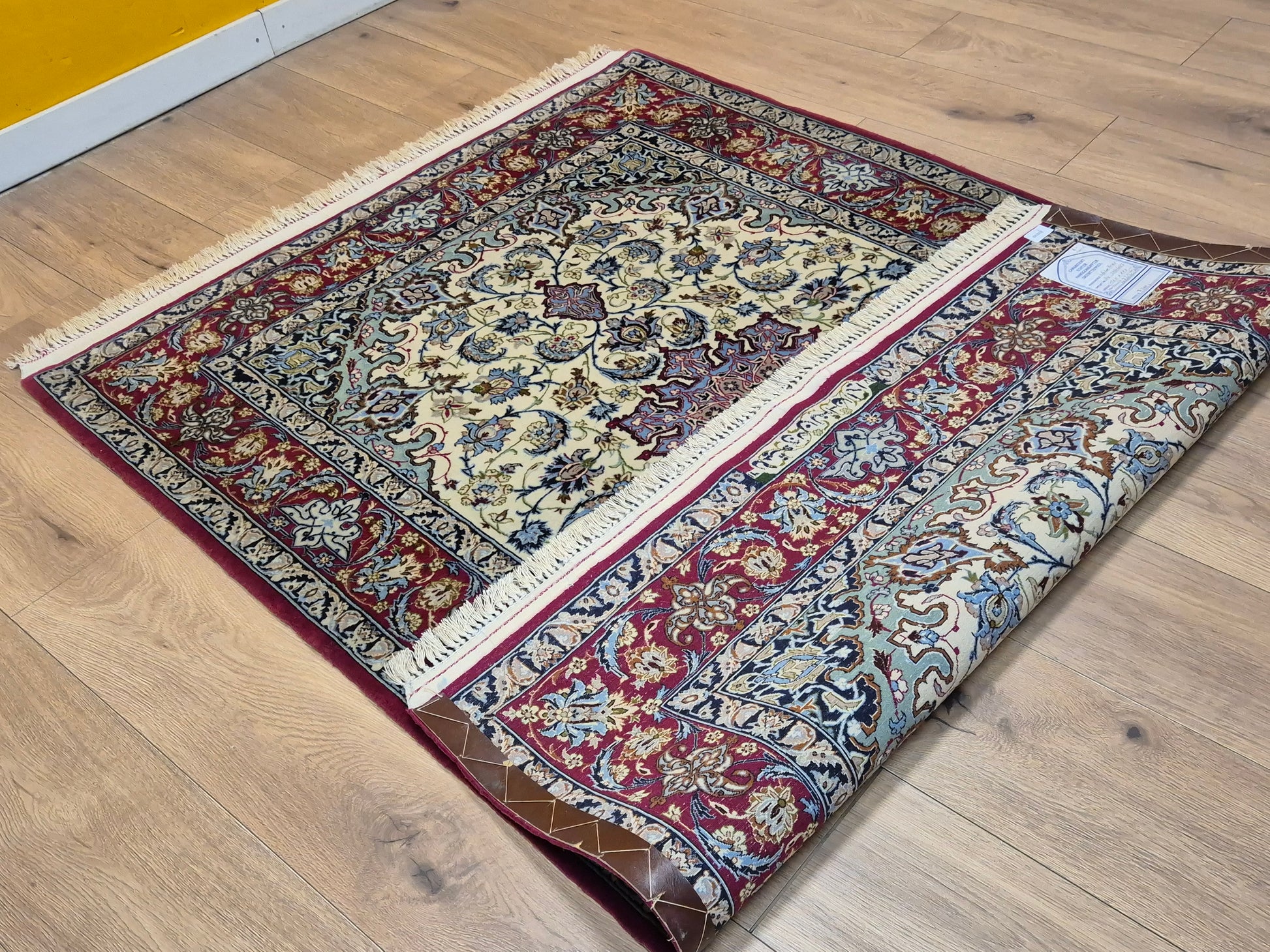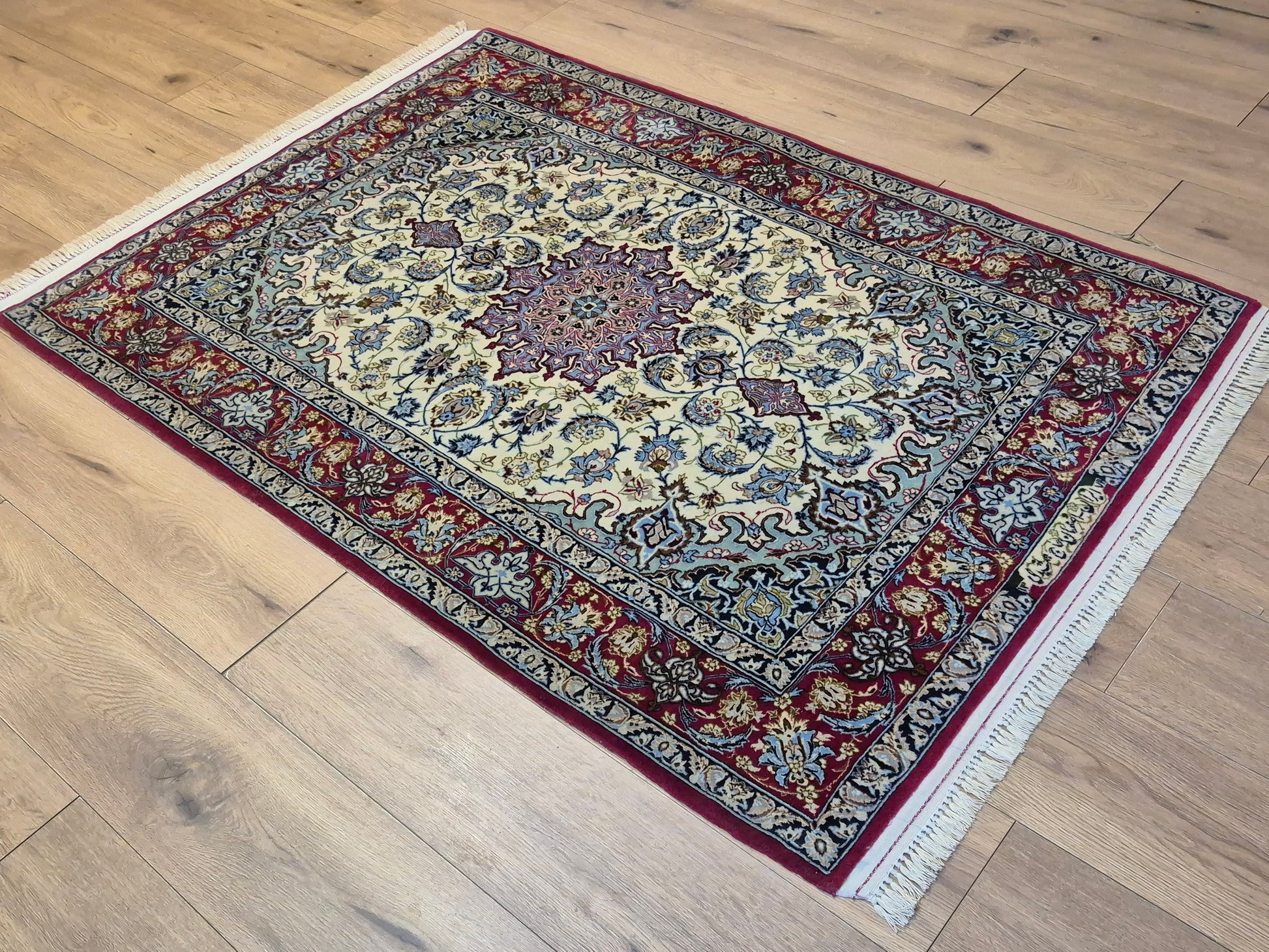 angeboten wird ein edler Isfahan Teppich aus feiner Korkwolle mit Seidenanteilen, handgeknüpft auf Seide. Das kunstvolle Design wird von einem zentralen Medaillon dominiert, das von fein ausgearbeiteten Blüten- und Rankenmustern umgeben ist. Die kräftige Bordüre in Rot mit floralen Ornamenten bildet einen harmonischen Rahmen. Durch die Signatur des Knüpfmeisters erhält dieser Teppich eine besondere Authentizität.