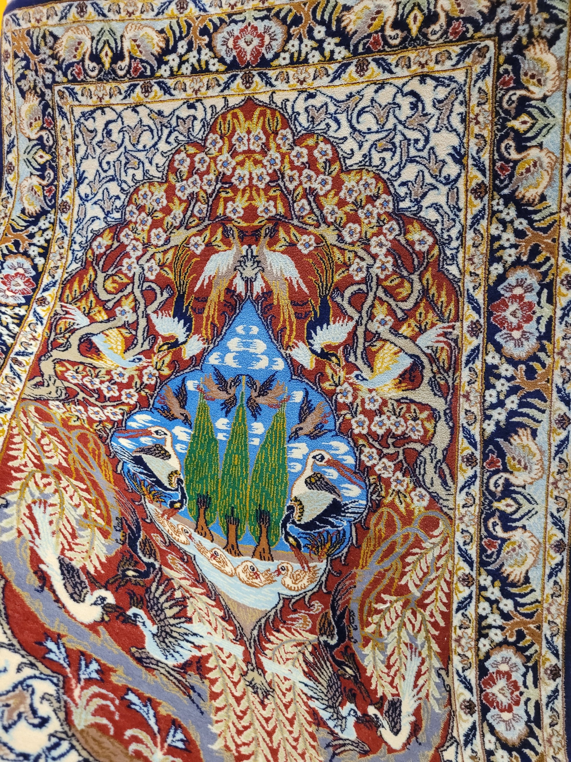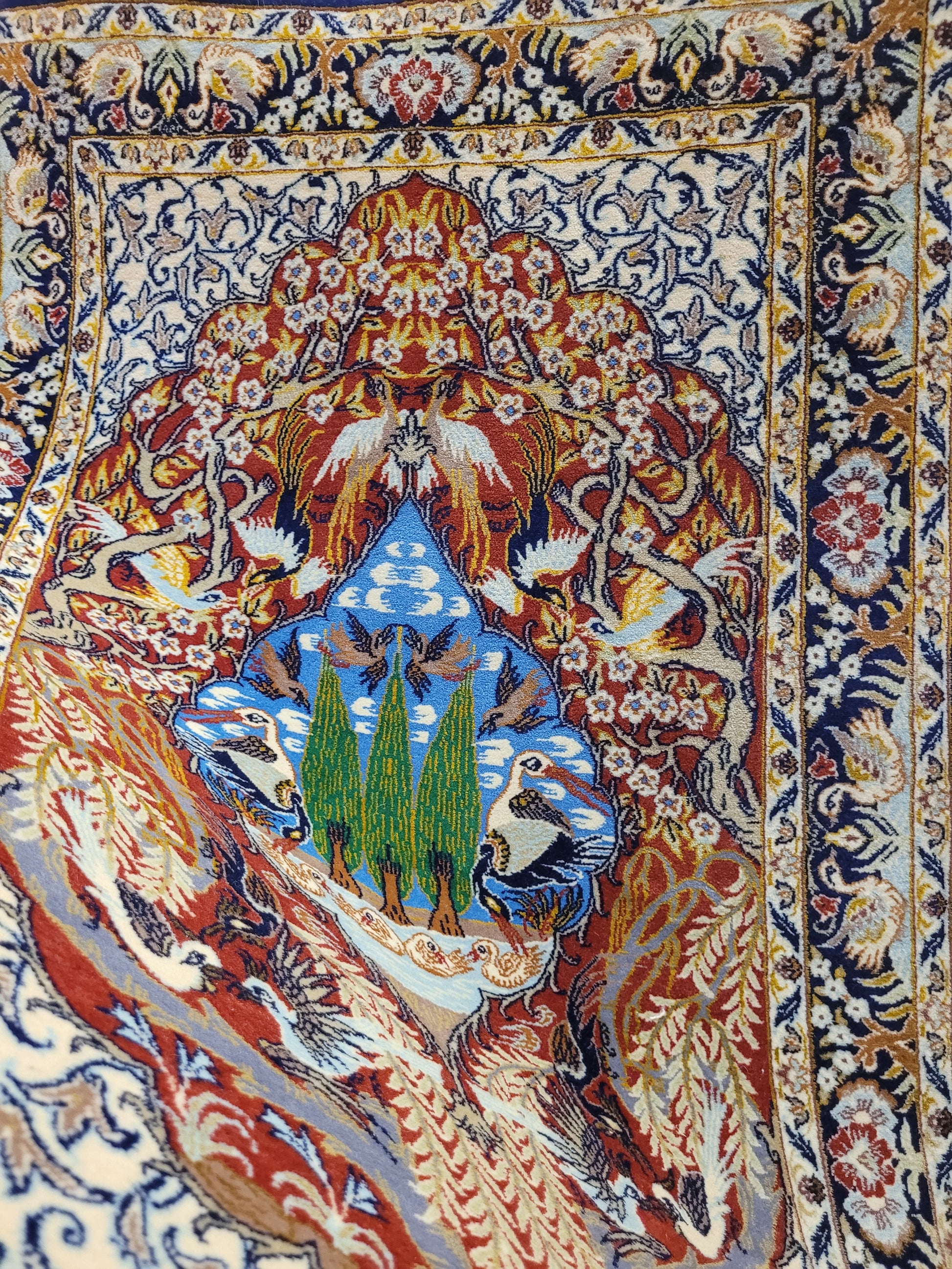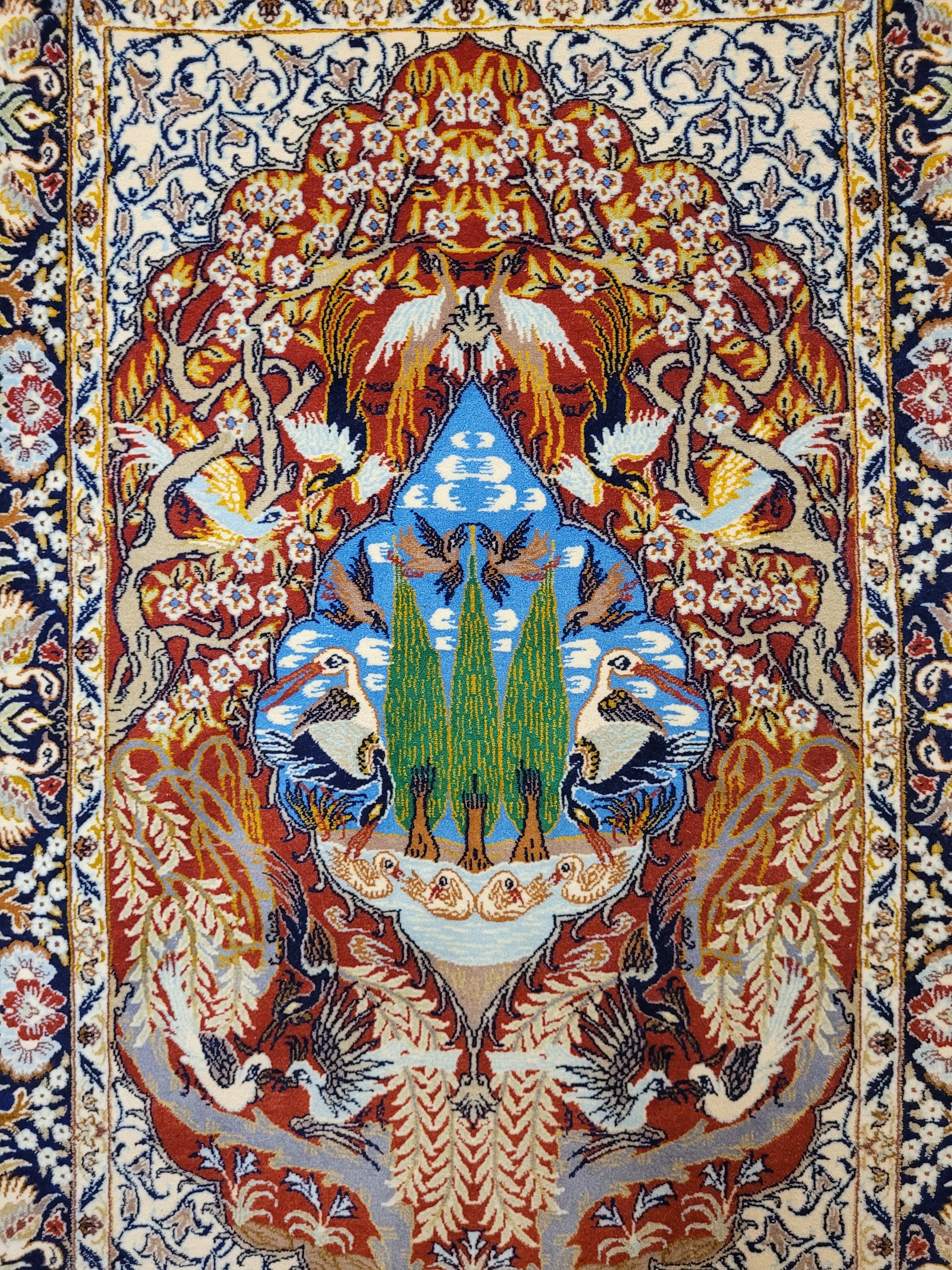 angeboten wird ein exquisiter Isfahan Teppich aus feiner Korkwolle mit Seidenakzenten, handgeknüpft in meisterlicher Qualität. Das außergewöhnliche Bildmotiv zeigt eine symmetrische Komposition mit zentralen Zypressen, umgeben von Vögeln, floralen Ornamenten und einer prachtvollen Bordüre – ein Werk von hoher künstlerischer Ausdruckskraft.