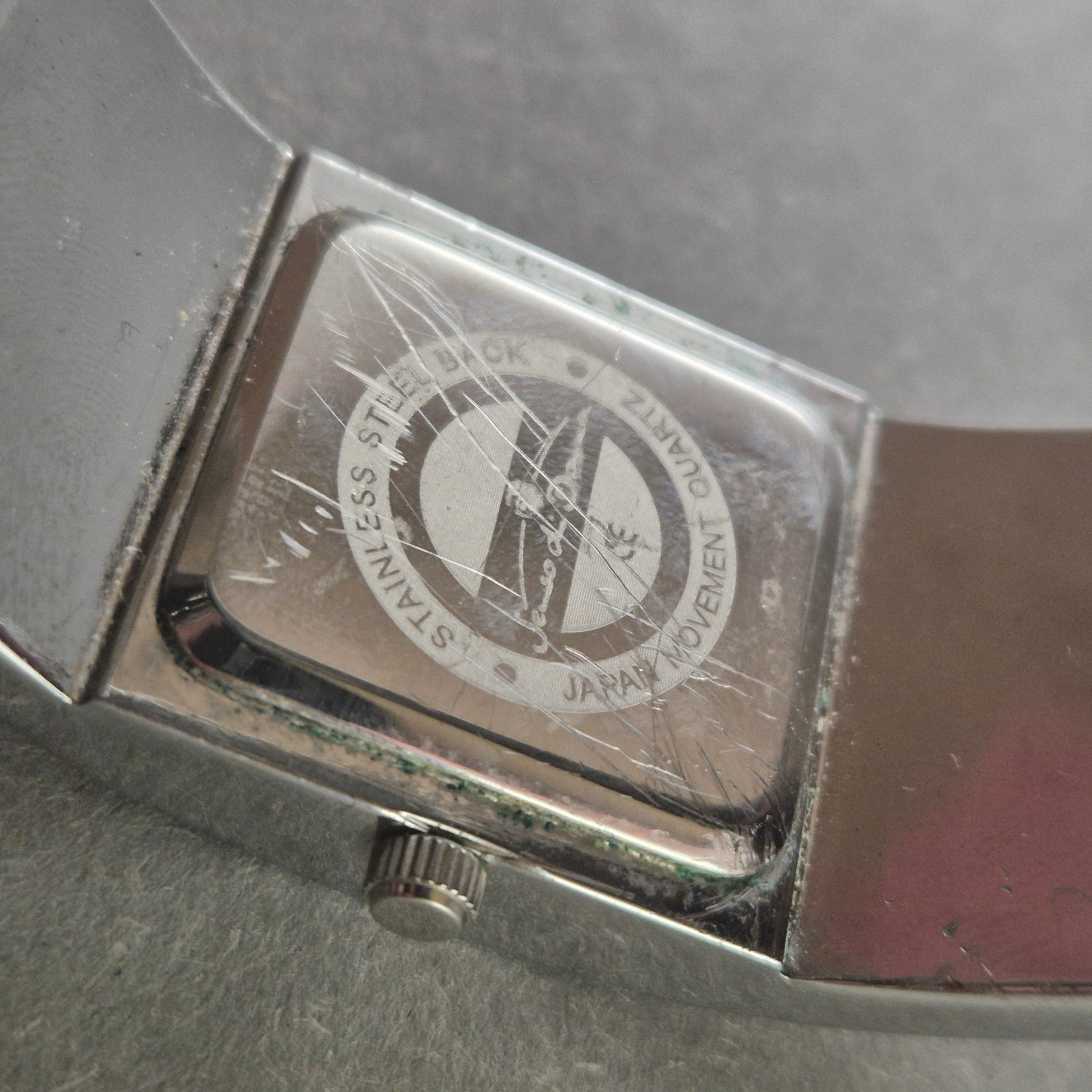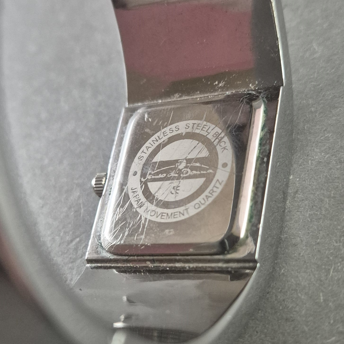 Diese elegante Damenarmbanduhr von Jacques du Manoir kombiniert luxuriöse Ästhetik mit modernem Design. Das rechteckige Perlmutt-Zifferblatt wird von funkelnden Strasssteinen umrahmt, während das breite Metallarmband mit cremefarbenen Einsätzen verziert ist. Das hochwertige Quarzwerk aus Japan sorgt für präzise Zeitmessung. Die Uhr weist sichtbare Gebrauchsspuren auf, bleibt jedoch ein stilvolles Accessoire für besondere Anlässe.