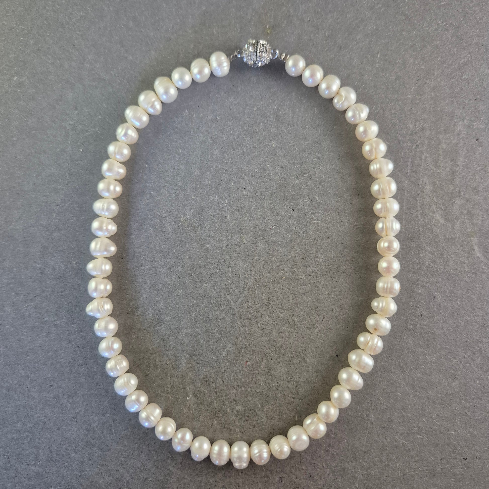 Diese klassische Halskette aus schimmernden weißen Süßwasserperlen ist ein zeitloses Schmuckstück, das zu jedem Anlass passt. Die leicht unregelmäßige Form der Perlen verleiht der Kette eine natürliche Ausstrahlung und besonderen Charme. Der silberfarbene Kugelverschluss mit Glitzerbesatz sorgt für sicheren Halt und einen dezenten, funkelnden Akzent.