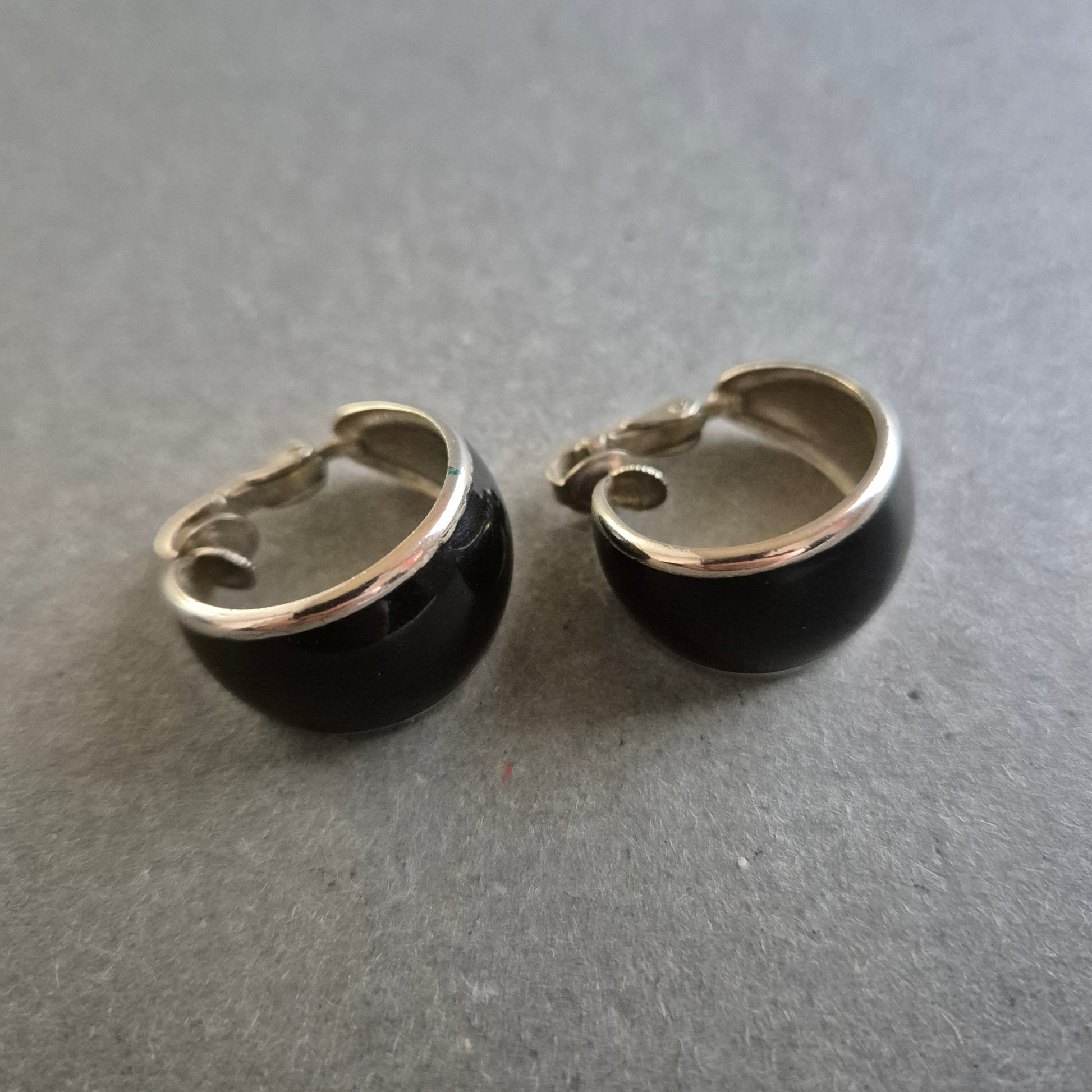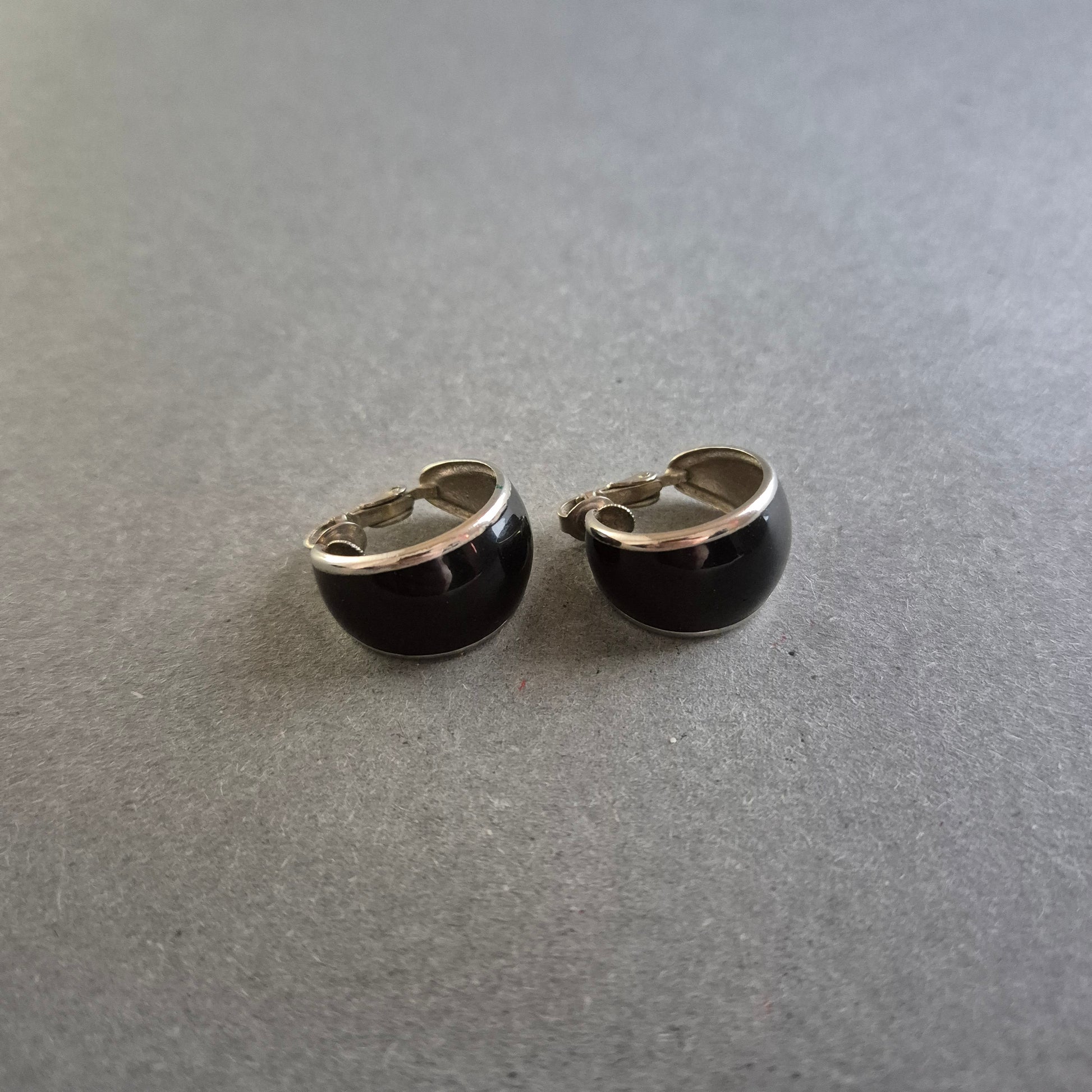 Diese eleganten Clip-Ohrringe in Halbcreolenform überzeugen mit ihrem zeitlosen Look. Der schwarze Korpus mit glänzender Oberfläche wird durch einen dezenten silberfarbenen Rand stilvoll ergänzt. Ideal für Damen, die klassischen Schmuck lieben – auch ohne Ohrlöcher tragbar dank komfortablem Clipverschluss.