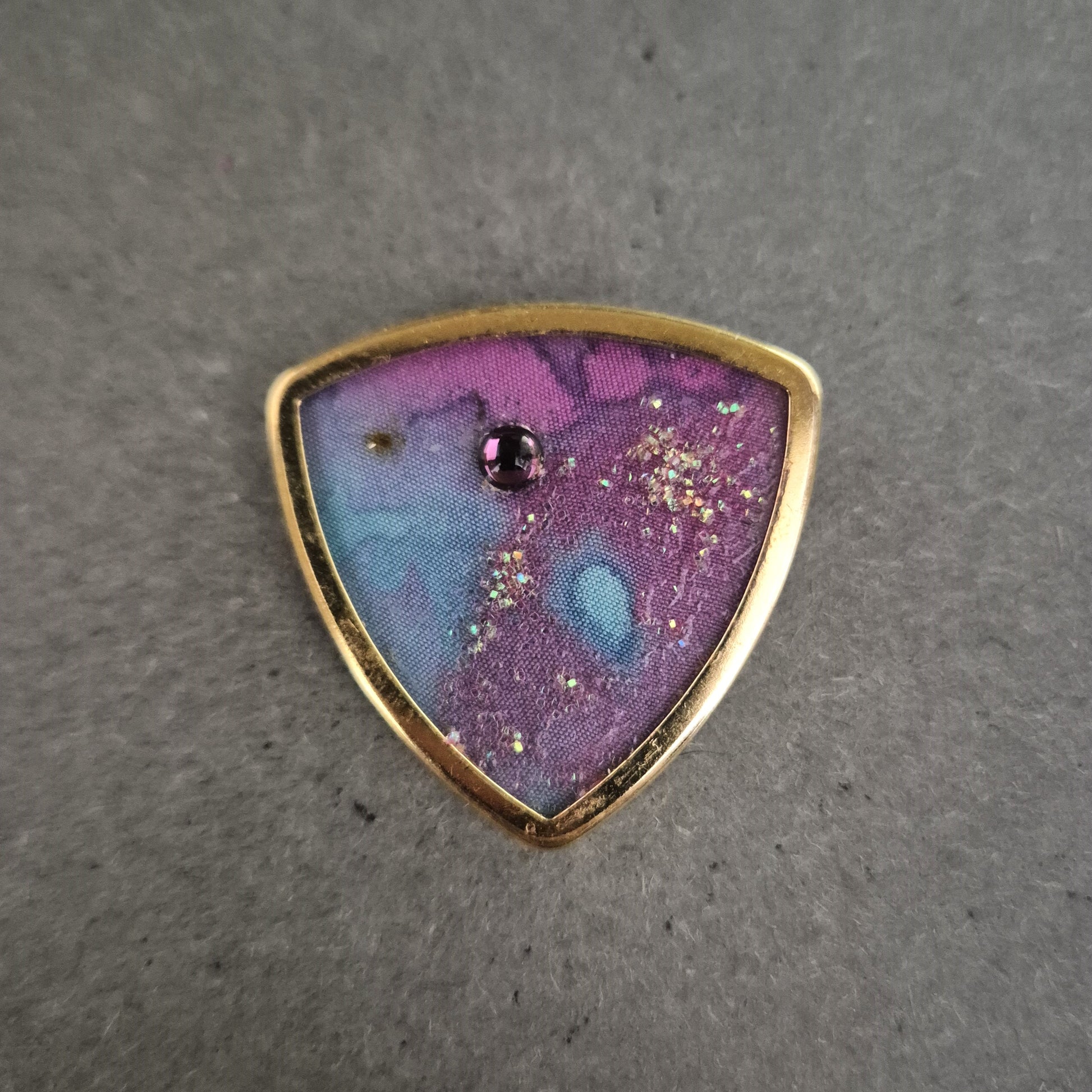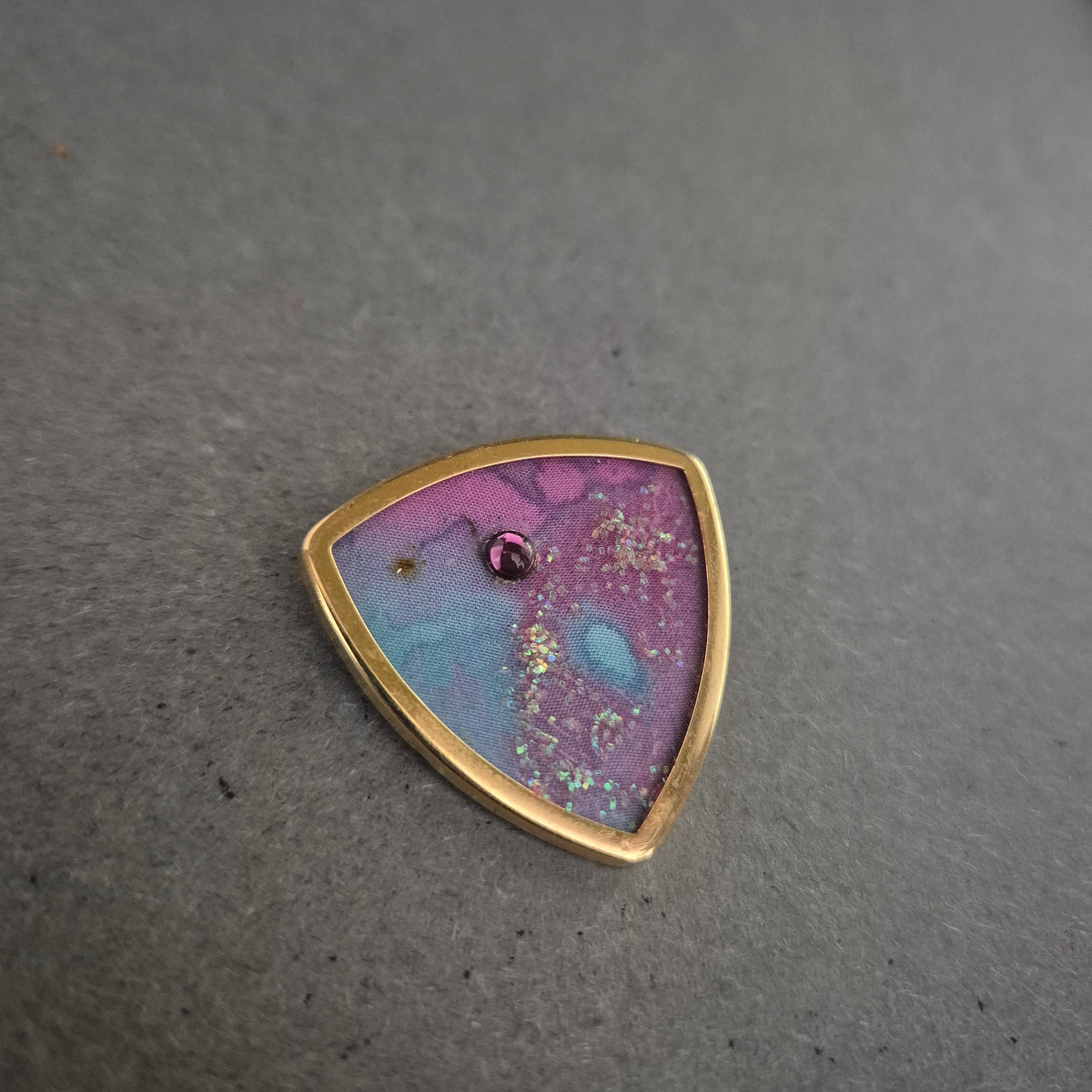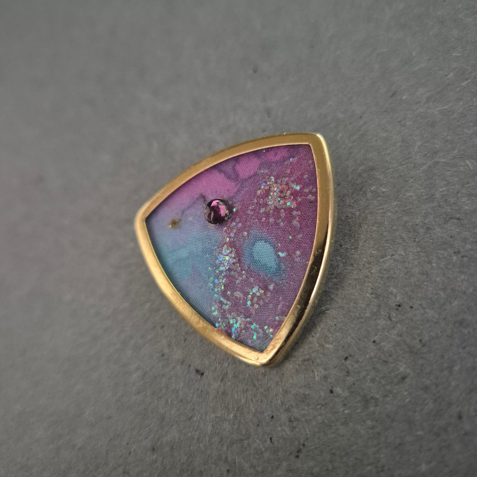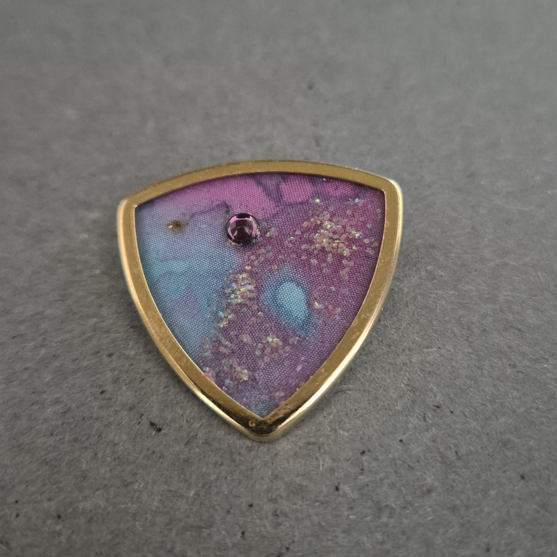 Diese außergewöhnliche Brosche kombiniert künstlerischen Ausdruck mit stilvoller Eleganz. In einem goldfarbenen Rahmen sitzt eine abstrakte Komposition in Lila- und Türkistönen, veredelt mit feinem Glitzereffekt und einem kleinen violetten Schmuckstein in der Mitte. Ein modernes, fast galaktisches Design, das jedem Outfit eine kreative Note verleiht.