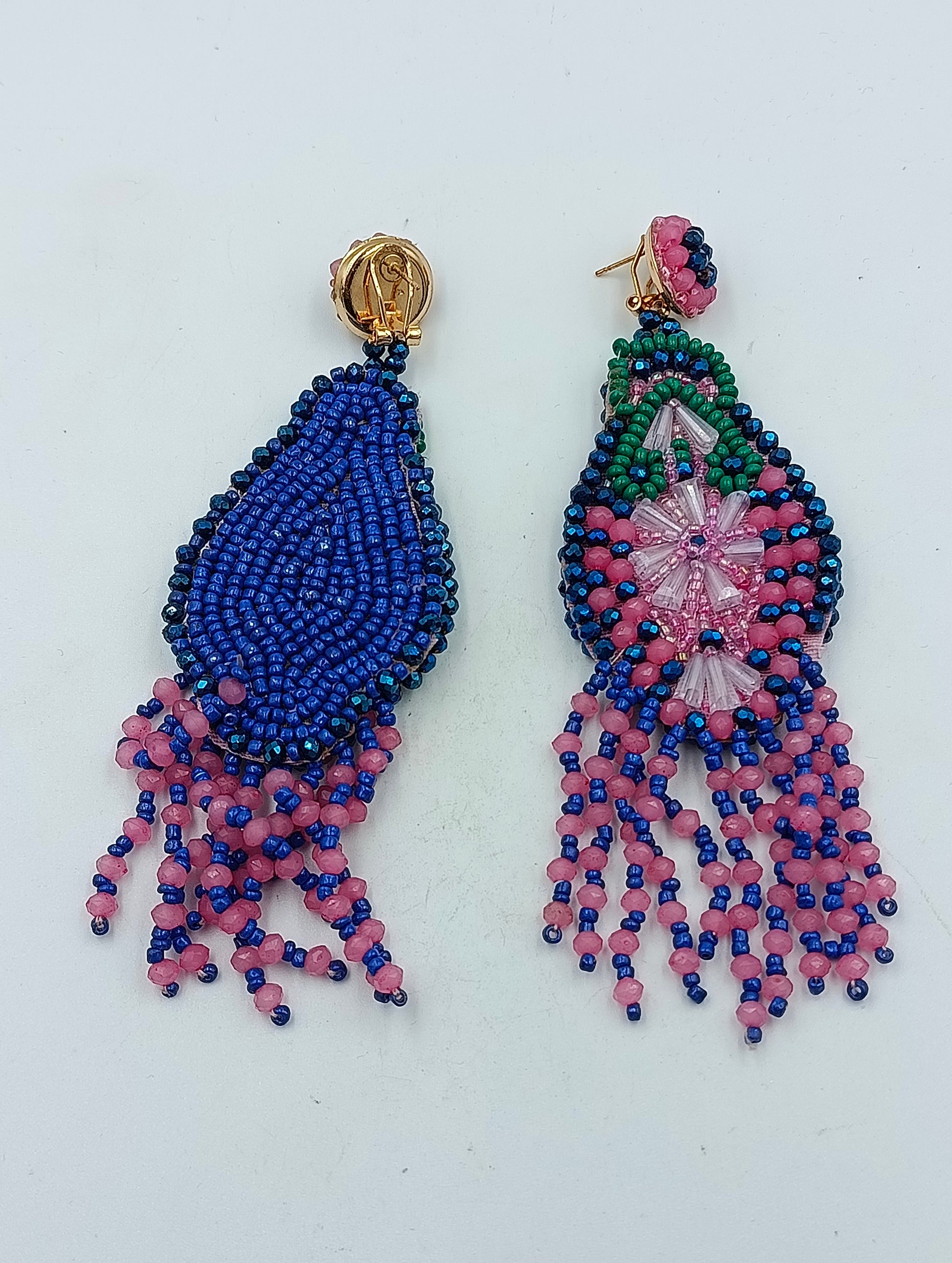 Farbenfrohe Statement-Ohrhänger im Boho-Design, aufwendig mit Glasperlen in Pink, Blau, Grün und Gold verziert. Die detailreiche Handarbeit und die beweglichen Fransen machen diese Ohrringe zu echten Hinguckern – perfekt für Sommerlooks, Festivals oder besondere Anlässe.