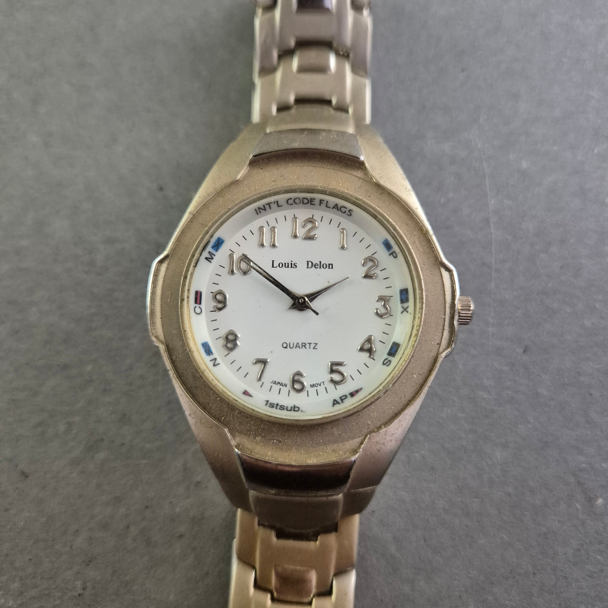 Diese markante Louis Delon Herren Uhr kombiniert sportlichen Stil mit maritimer Raffinesse. Das Zifferblatt zeigt neben arabischen Ziffern auch internationale Signalflaggen als stilvolles Designelement. Das robuste Edelstahlarmband und das stabile Gehäuse machen die Uhr zu einem zuverlässigen Begleiter im Alltag. Japanisches Quarzwerk sorgt für präzise Zeitangabe.