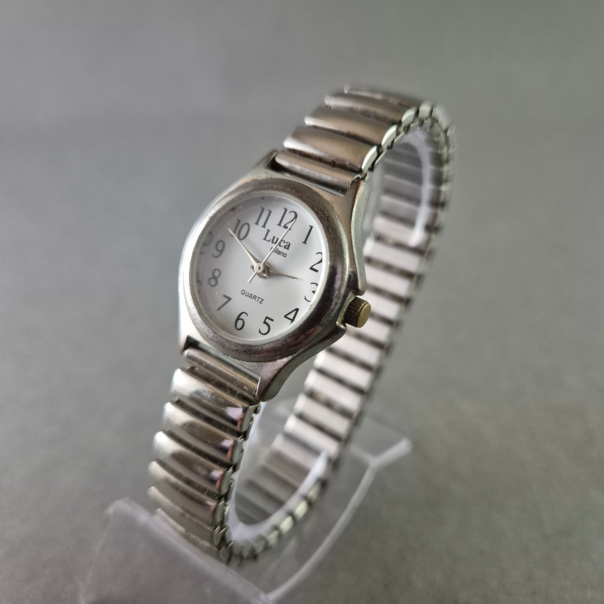 Diese Luca Milano Damen Uhr überzeugt mit ihrem schlichten und funktionalen Design. Das silberfarbene Edelstahlgehäuse und das praktische Stretcharmband machen sie besonders alltagstauglich und angenehm zu tragen. Das weiße Zifferblatt mit schwarzen, gut lesbaren arabischen Ziffern sorgt für eine klare Ablesbarkeit. Eine klassische Uhr, die Eleganz und Komfort vereint.