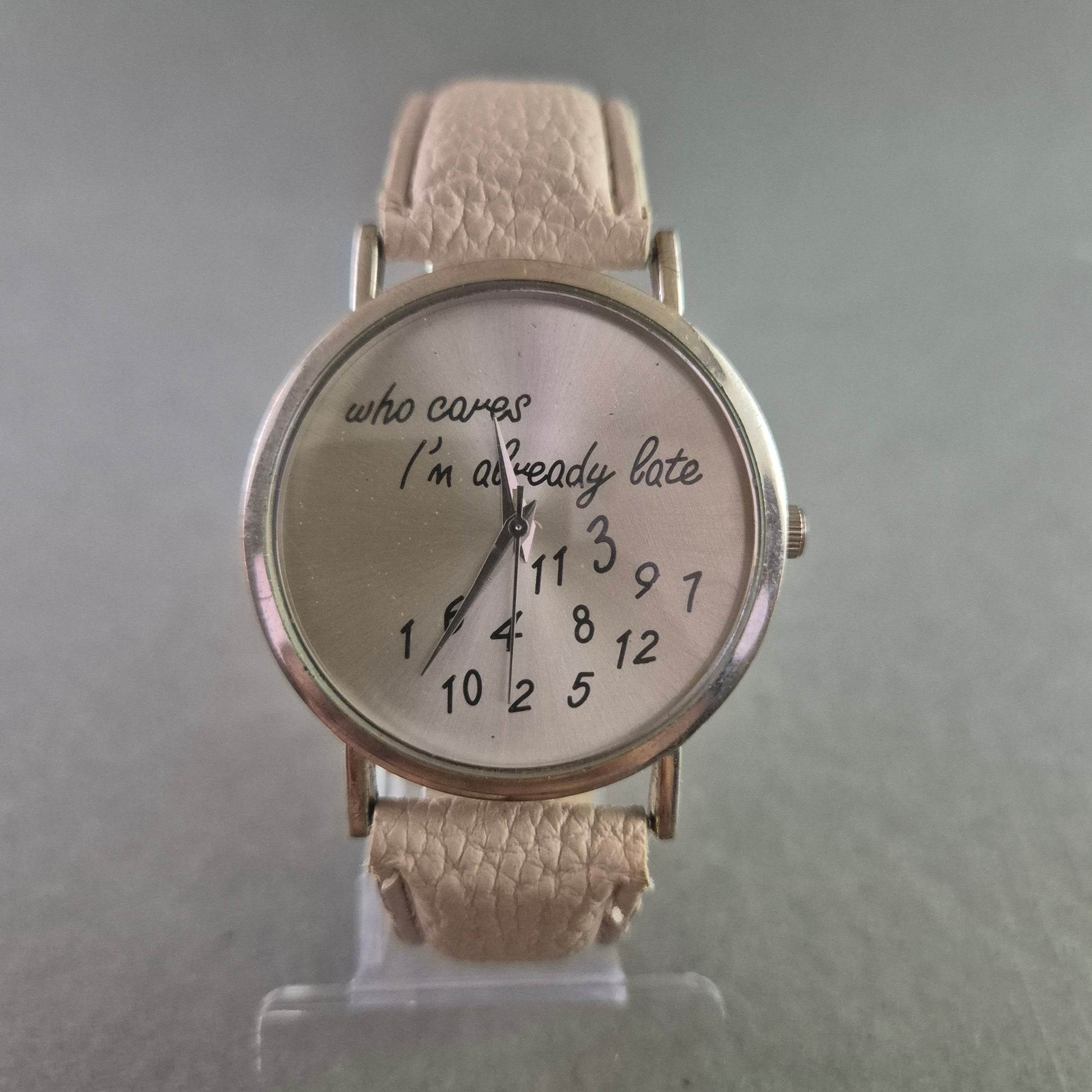 Diese originelle Damen Uhr sorgt garantiert für Gesprächsstoff. Das Zifferblatt trägt den humorvollen Spruch „Who cares, I’m already late“ und zeigt die Zahlen in spielerischer Unordnung. Das runde Gehäuse wird durch ein beiges Lederarmband ergänzt, das angenehm zu tragen ist. Perfekt für alle, die Mode mit einem Augenzwinkern tragen möchten.