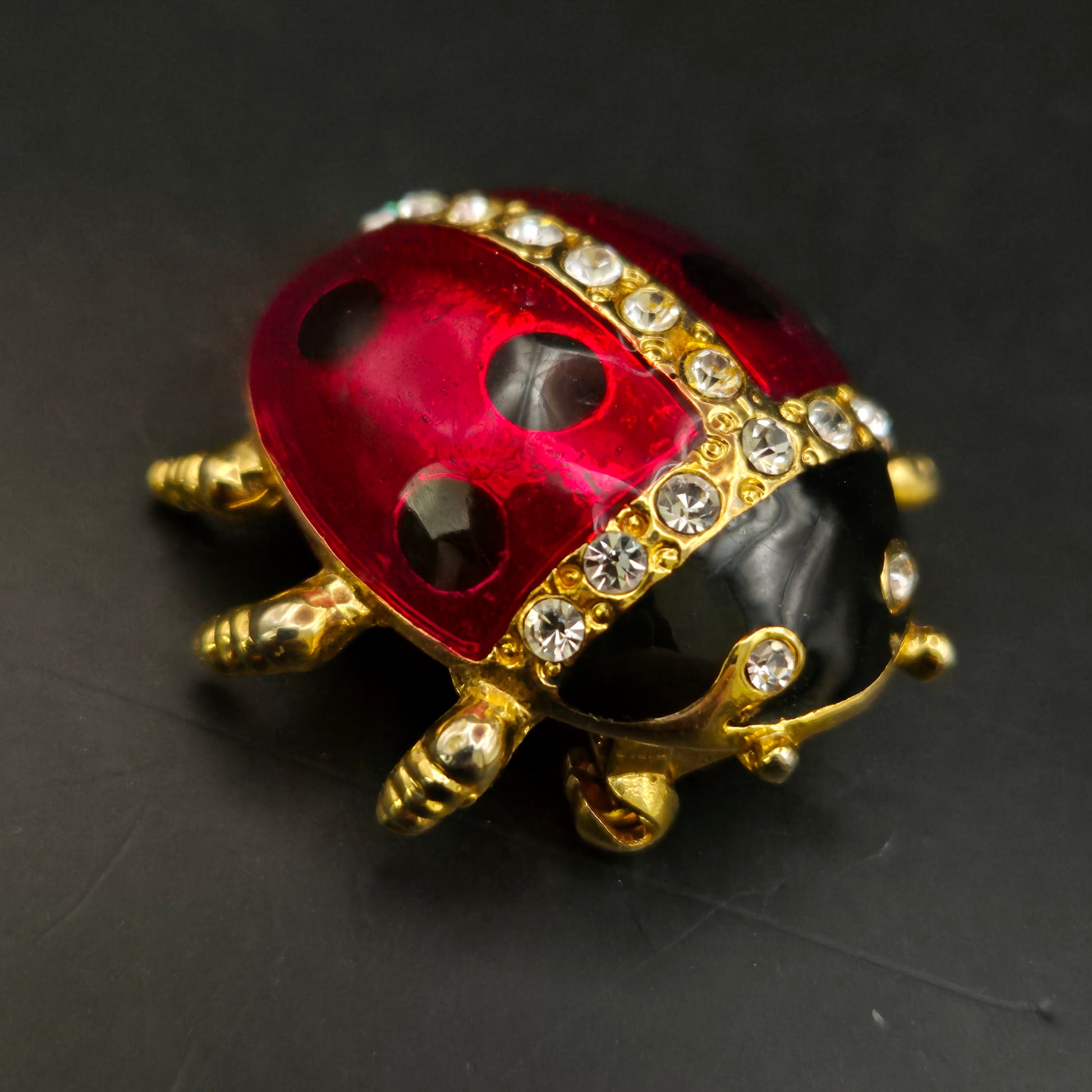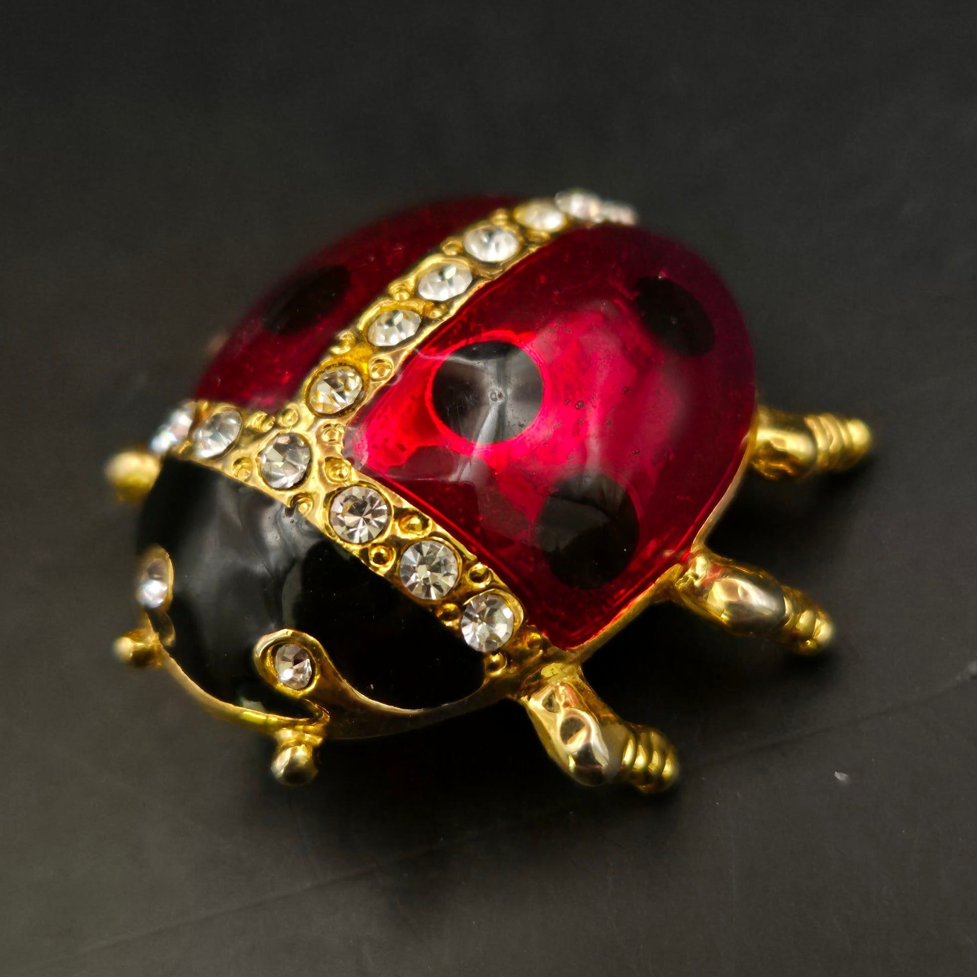 Diese charmante Marienkäfer Brosche ist ein echter Hingucker! Der Körper ist detailreich gestaltet mit glänzender roter und schwarzer Emaille sowie funkelnden Strasssteinen auf dem Rücken. Die vergoldete Oberfläche und die liebevoll ausgearbeiteten Beinchen machen sie zu einem verspielten, aber stilvollen Accessoire für Jacken, Taschen oder Hüte.