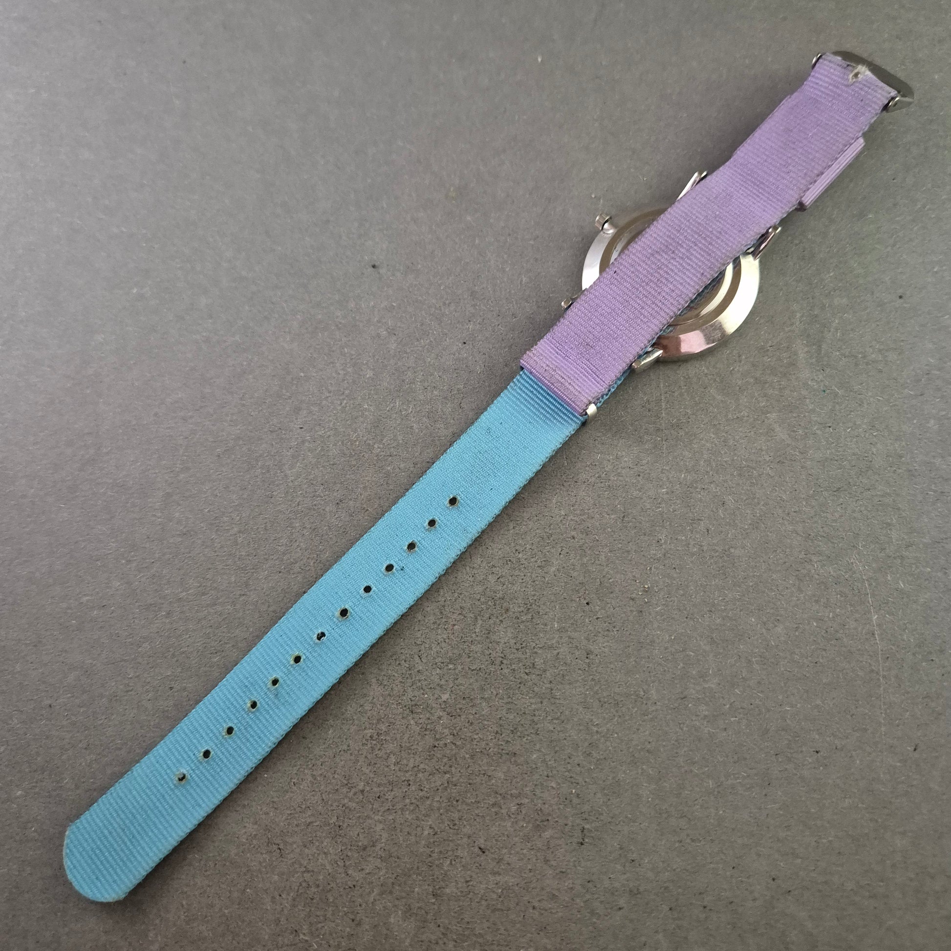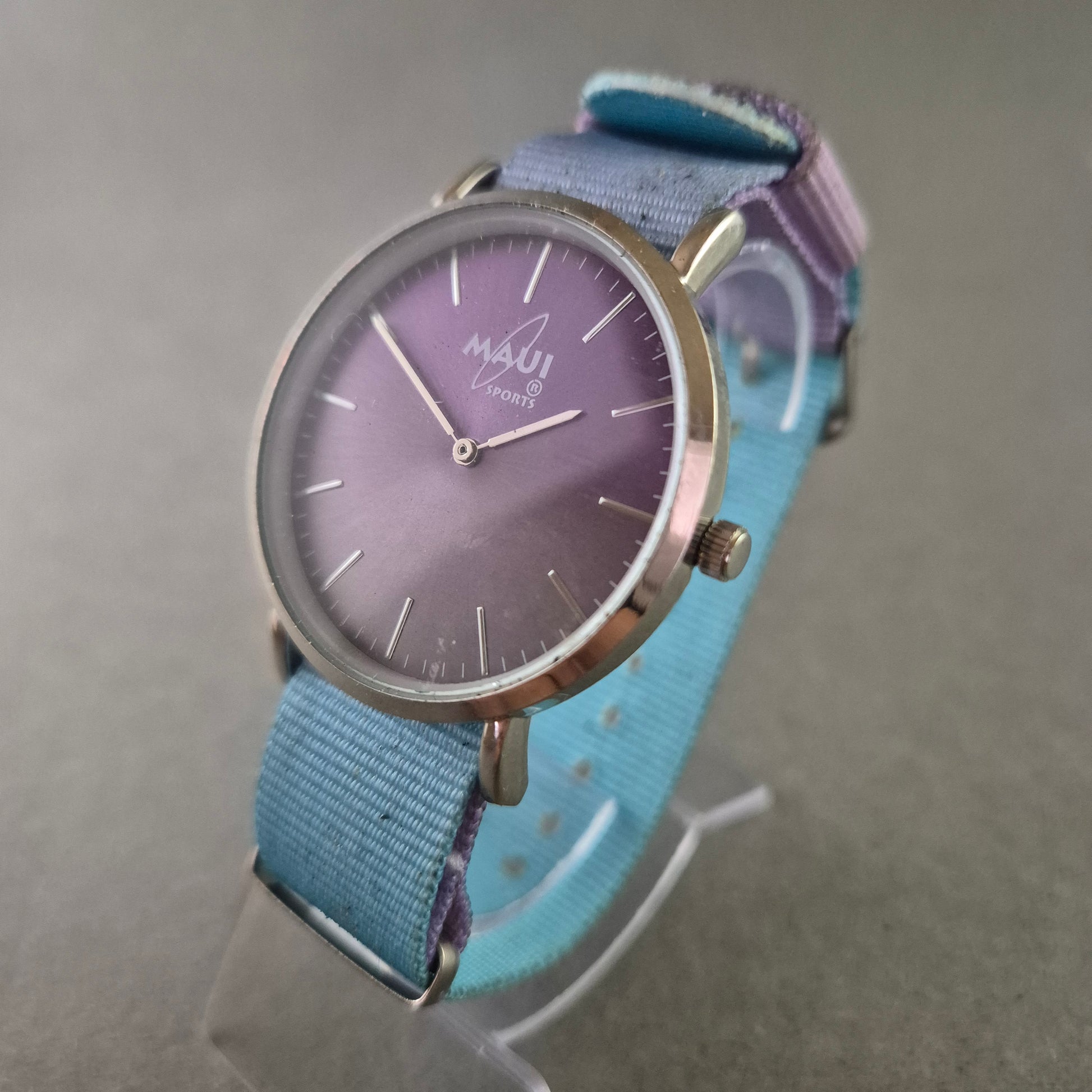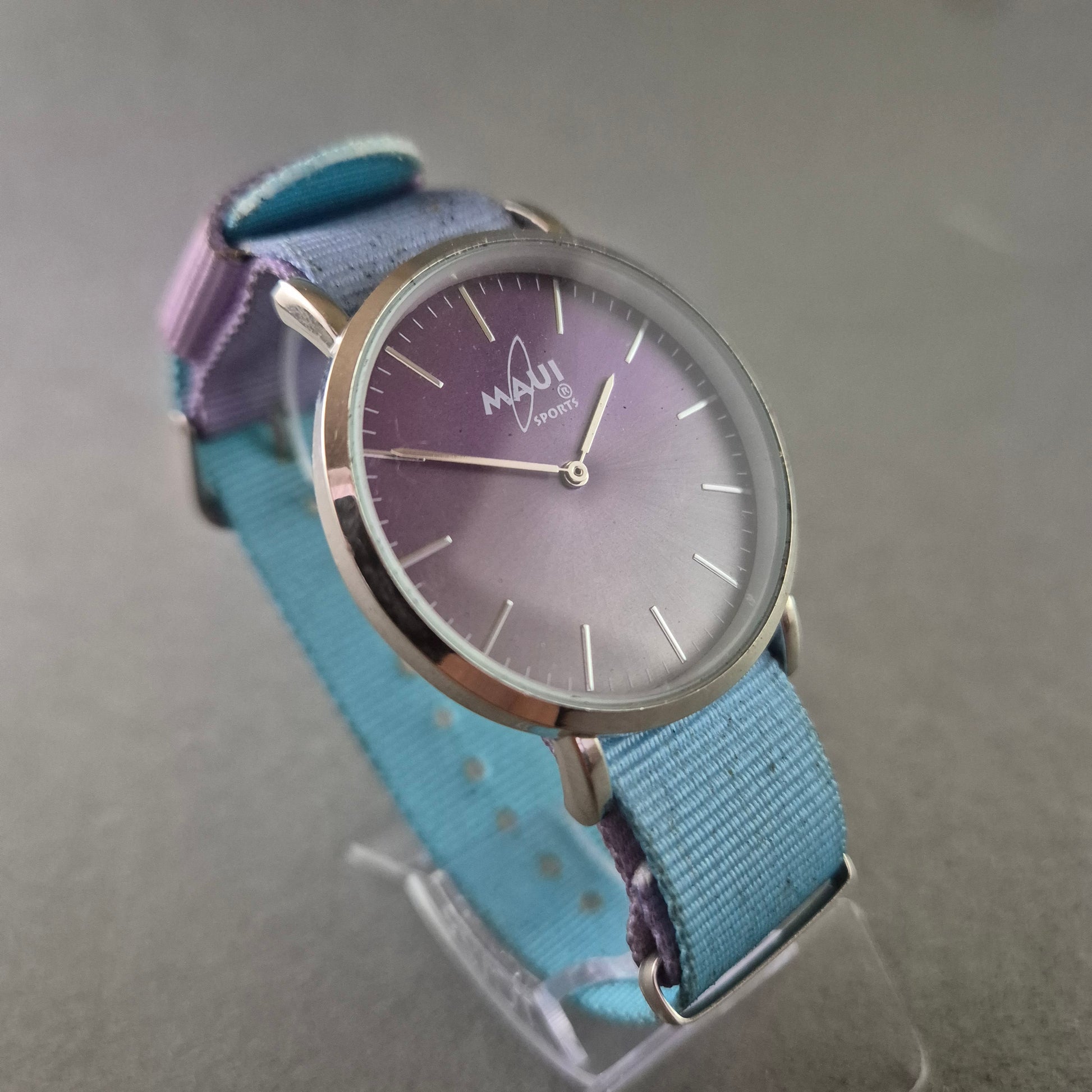 Diese Maui Sports Unisex Uhr verbindet sportliches Design mit farbenfroher Optik. Das schlichte, violett schimmernde Zifferblatt wird durch ein zweifarbiges Textilarmband in Blau und Lila ergänzt, das der Uhr einen modernen und jugendlichen Look verleiht. Dank Quarzwerk ist sie zuverlässig und pflegeleicht – perfekt für den Alltag.