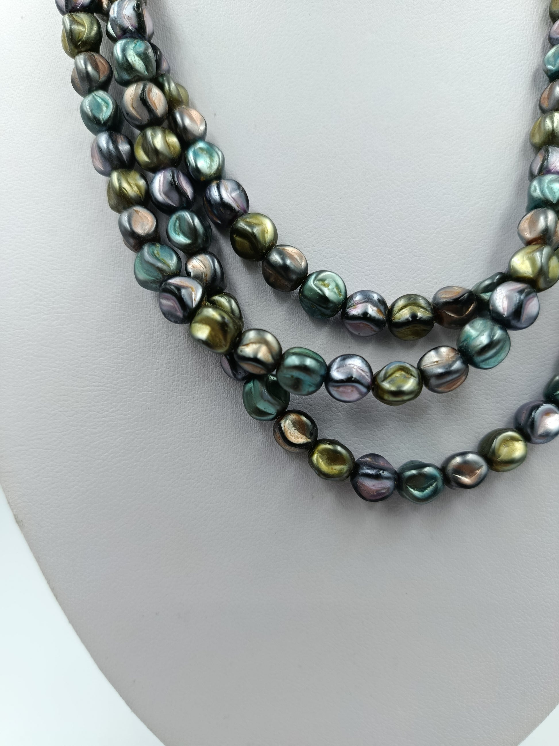 Auffällige mehrreihige Perlenhalskette mit schimmernden Perlen in changierenden Tönen von Grün, Violett, Blau und Bronze. Der dekorative goldfarbene Verschluss rundet das edle Design perfekt ab. Ein stilvolles Schmuckstück, das jedem Outfit einen Hauch von Eleganz und Glamour verleiht.