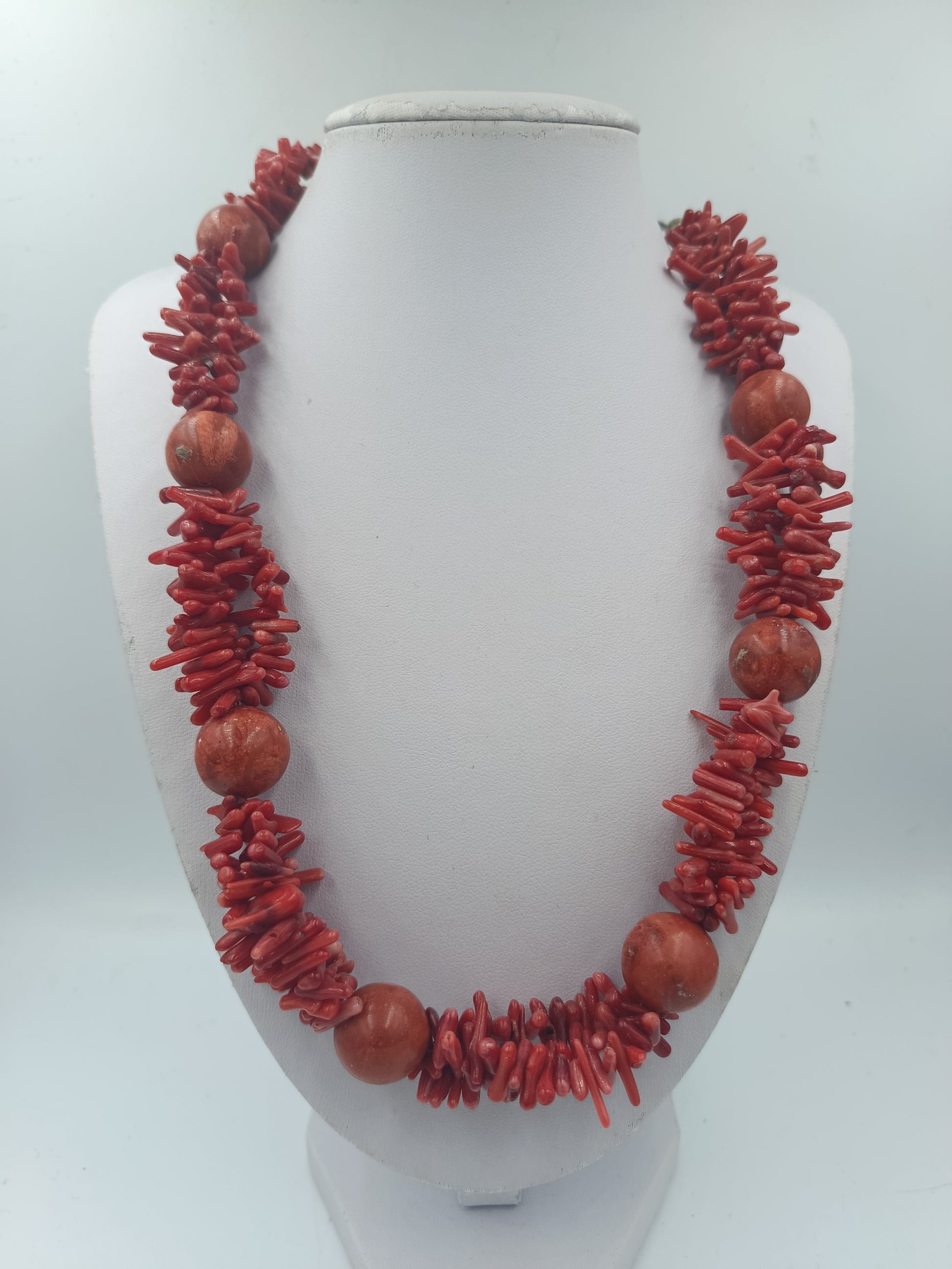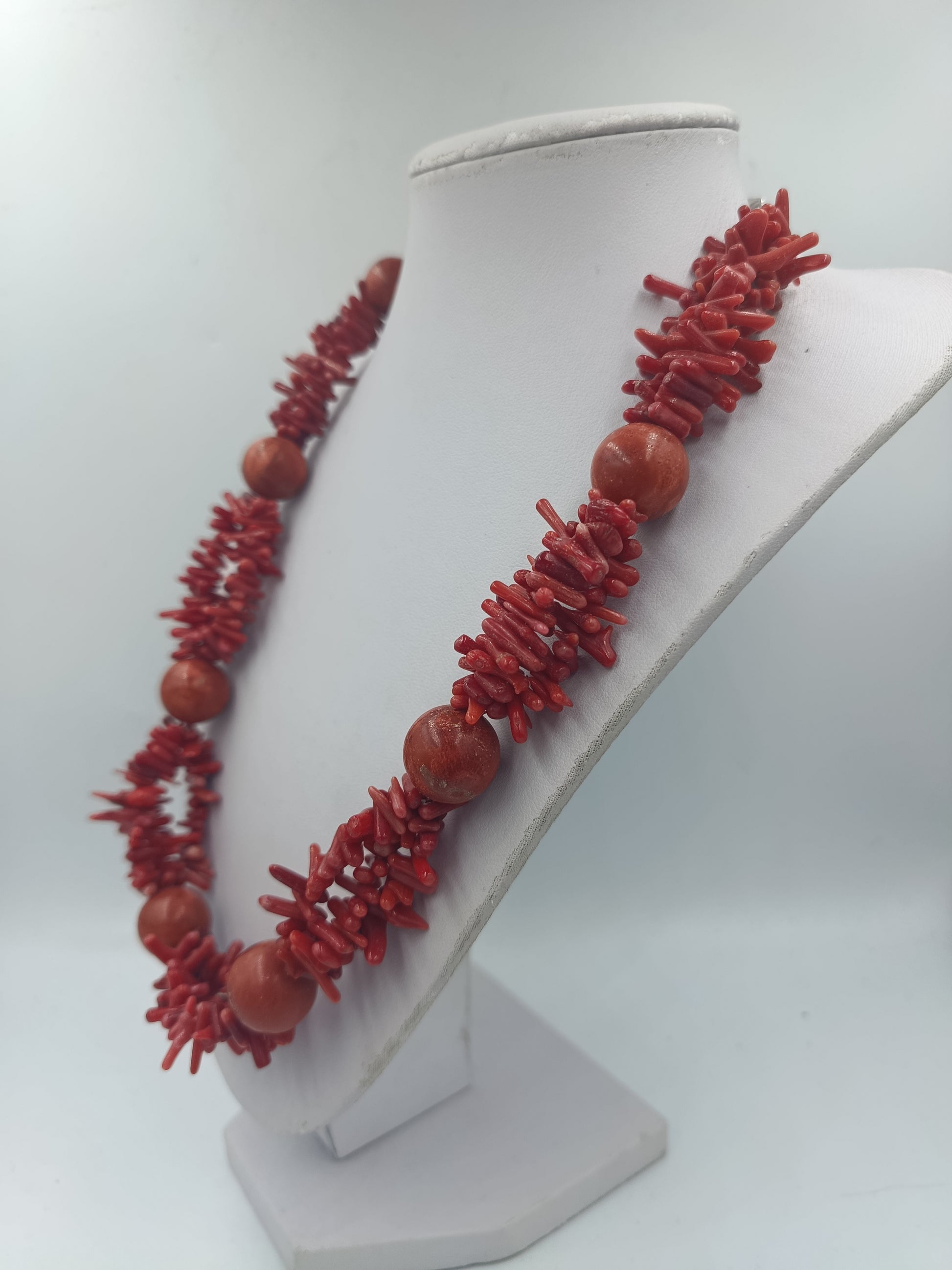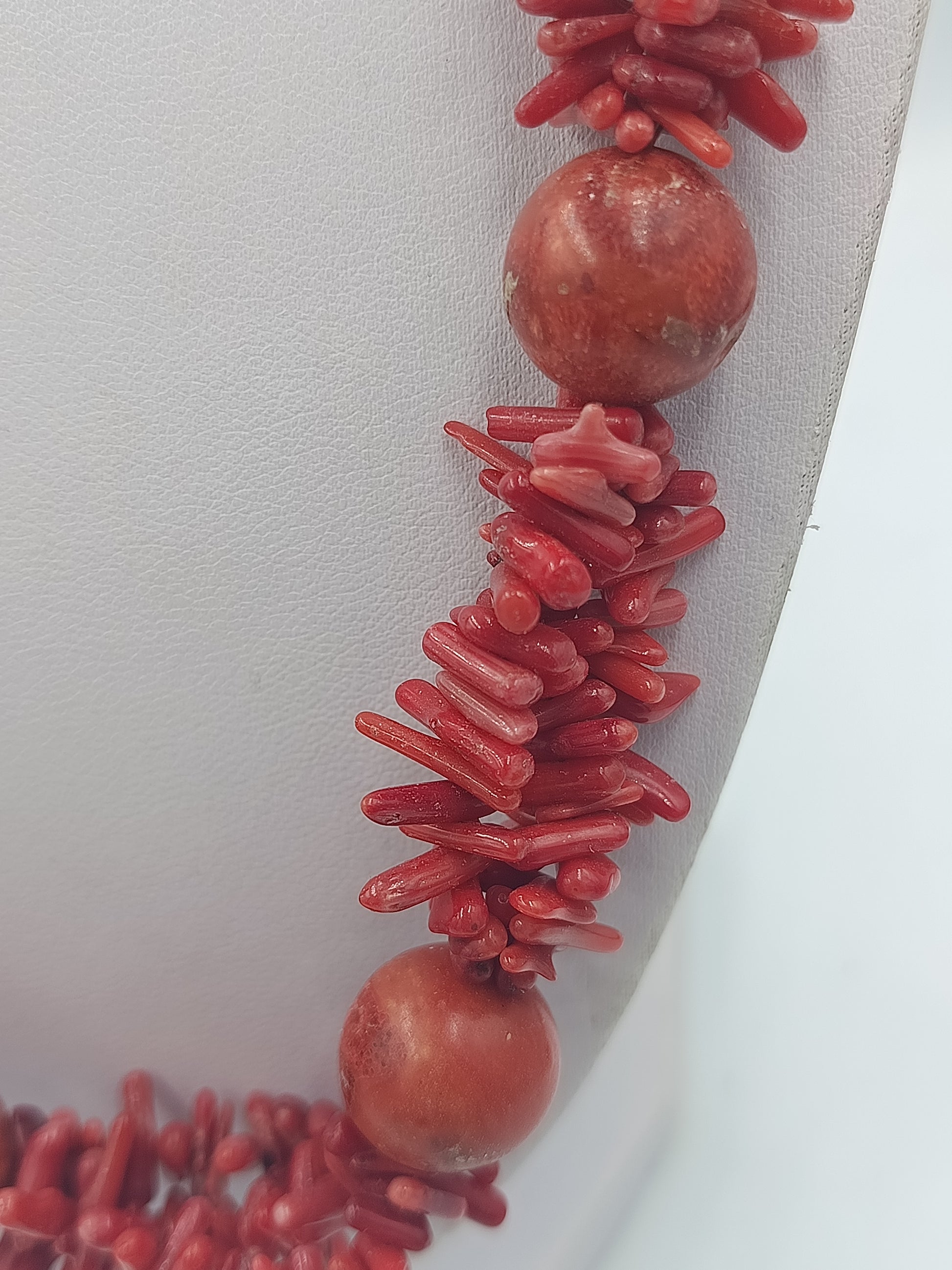 Diese auffällige mehrreihige Halskette besteht aus zahlreichen roten Korallenstäbchen und größeren runden Korallenperlen die zu einem ausdrucksstarken Schmuckstück verarbeitet wurden. Die intensive Farbgebung verleiht der Kette eine warme elegante Ausstrahlung und macht sie zu einem besonderen Blickfang. Der stabile Verschluss aus 925 Silber sorgt für sicheren Halt und angenehmen Tragekomfort. Ideal für Liebhaber von Naturmaterialien und markantem Schmuckdesign.