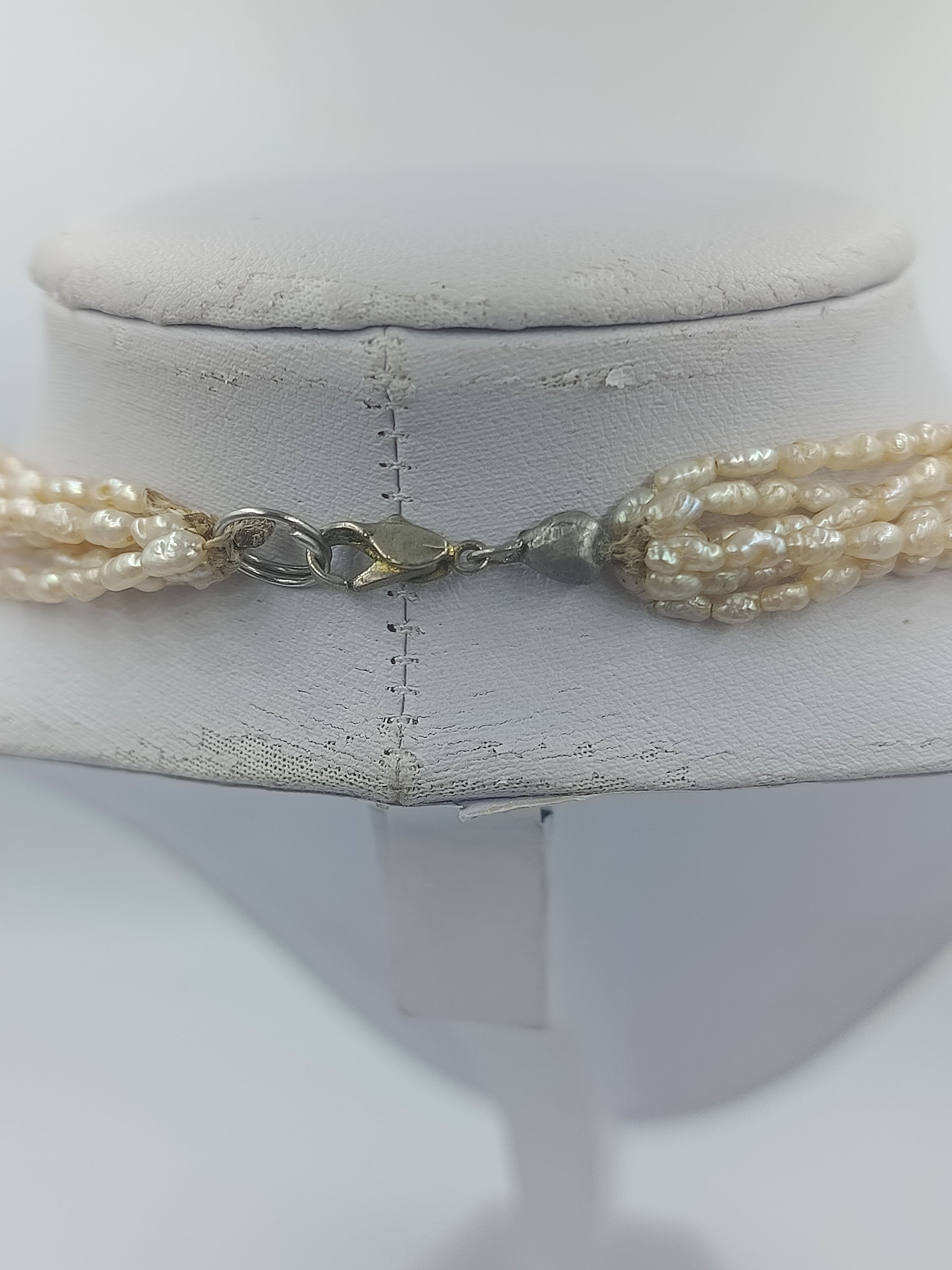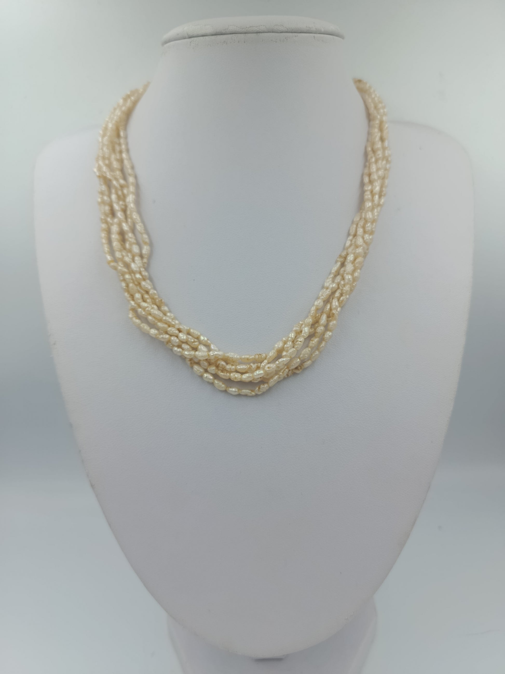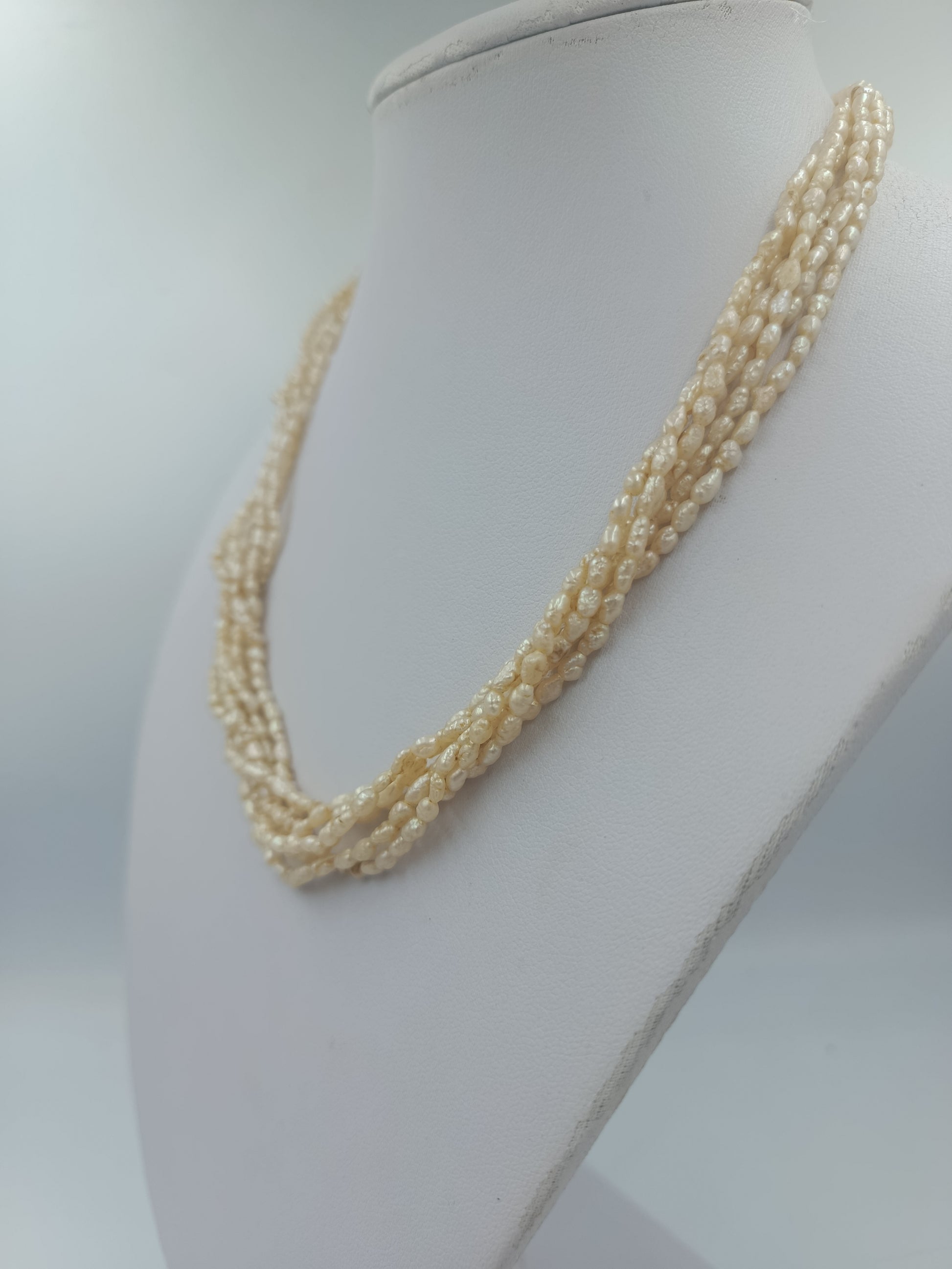 Elegante mehrreihige Halskette aus feinen, cremefarbenen Zuchtperlen. Die Perlen sind unregelmäßig geformt und verleihen der Kette ihren natürlichen, charmanten Charakter. Durch die mehrfachen Stränge entsteht ein klassisch-femininer Look – perfekt zu eleganten Outfits oder als stilvoller Akzent im Alltag.