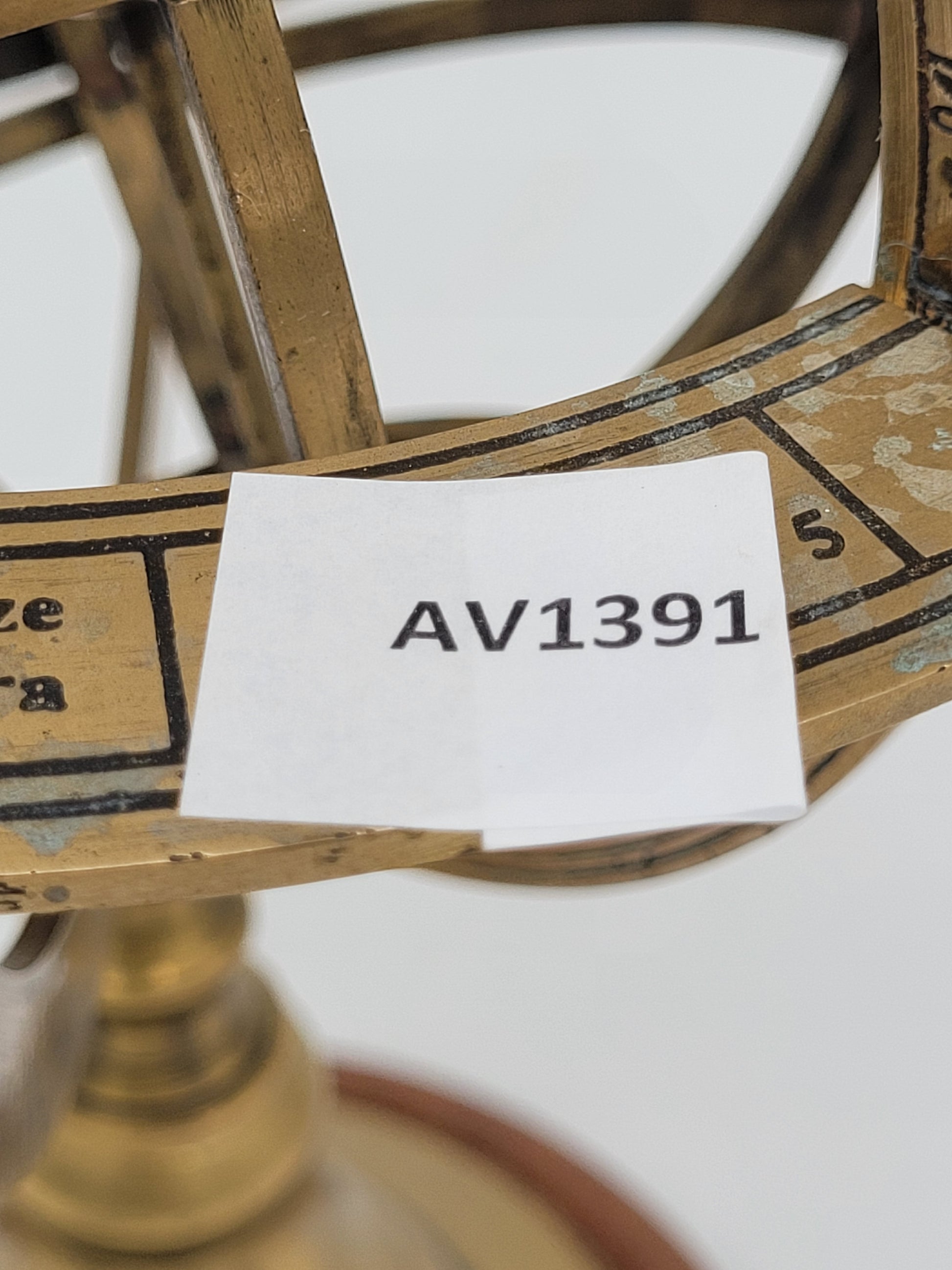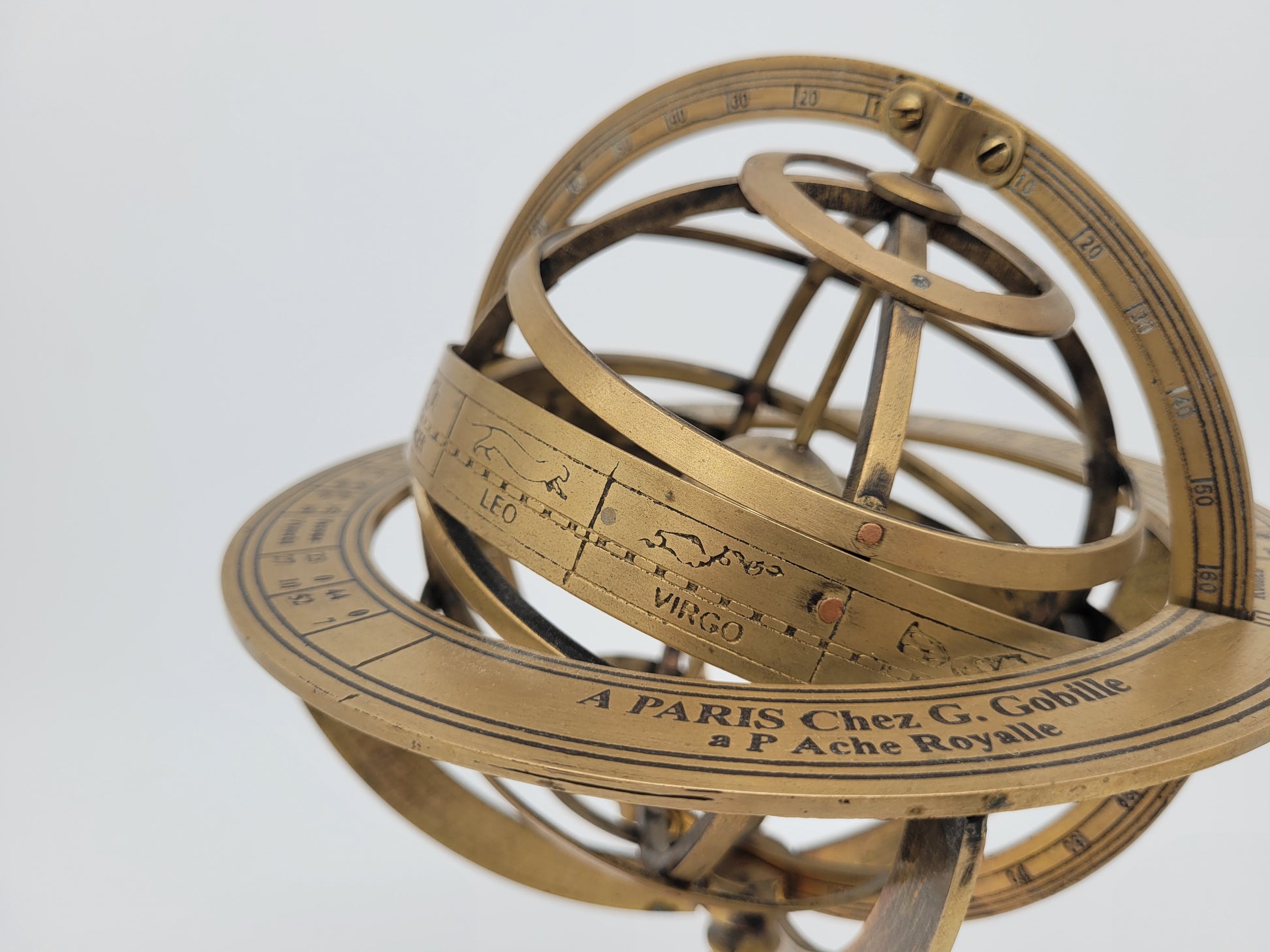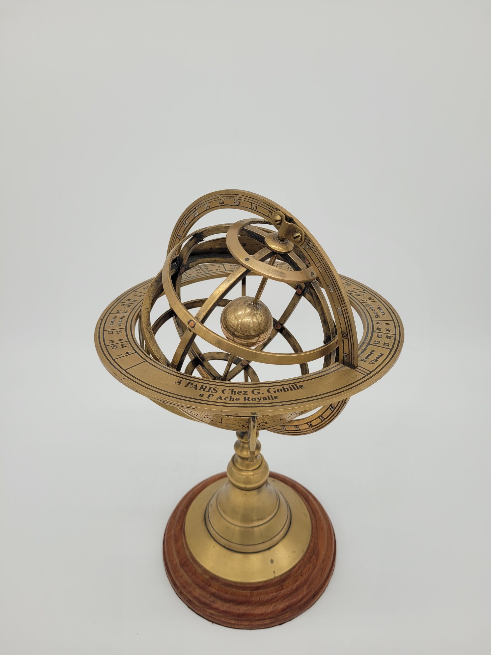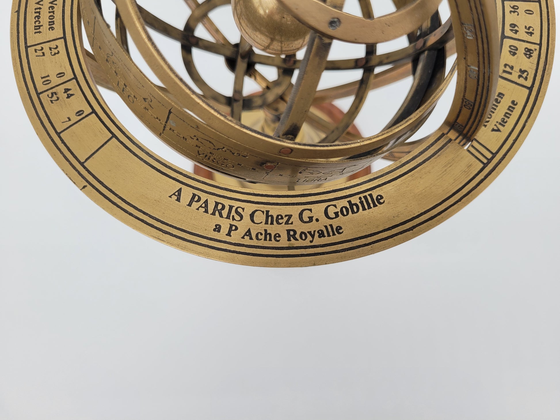 Diese dekorative Armillarsphäre besteht aus Messing und ruht auf einem runden Holzsockel. Sie zeigt ein kunstvoll verschachteltes System aus Ringen, die die Himmelskugel darstellen und die wichtigsten Koordinatenlinien abbilden. In der Mitte befindet sich eine kleine Kugel, die die Erde symbolisiert. Die Ringe sind graviert und tragen Bezeichnungen der Tierkreiszeichen sowie geographische Ortsangaben. Eine Inschrift lautet: „A PARIS Chez G. Gobille a P Ache Royalle“, was sich auf historische Vorbilder aus der Pariser Werkstatt von G. Gobille bezieht.