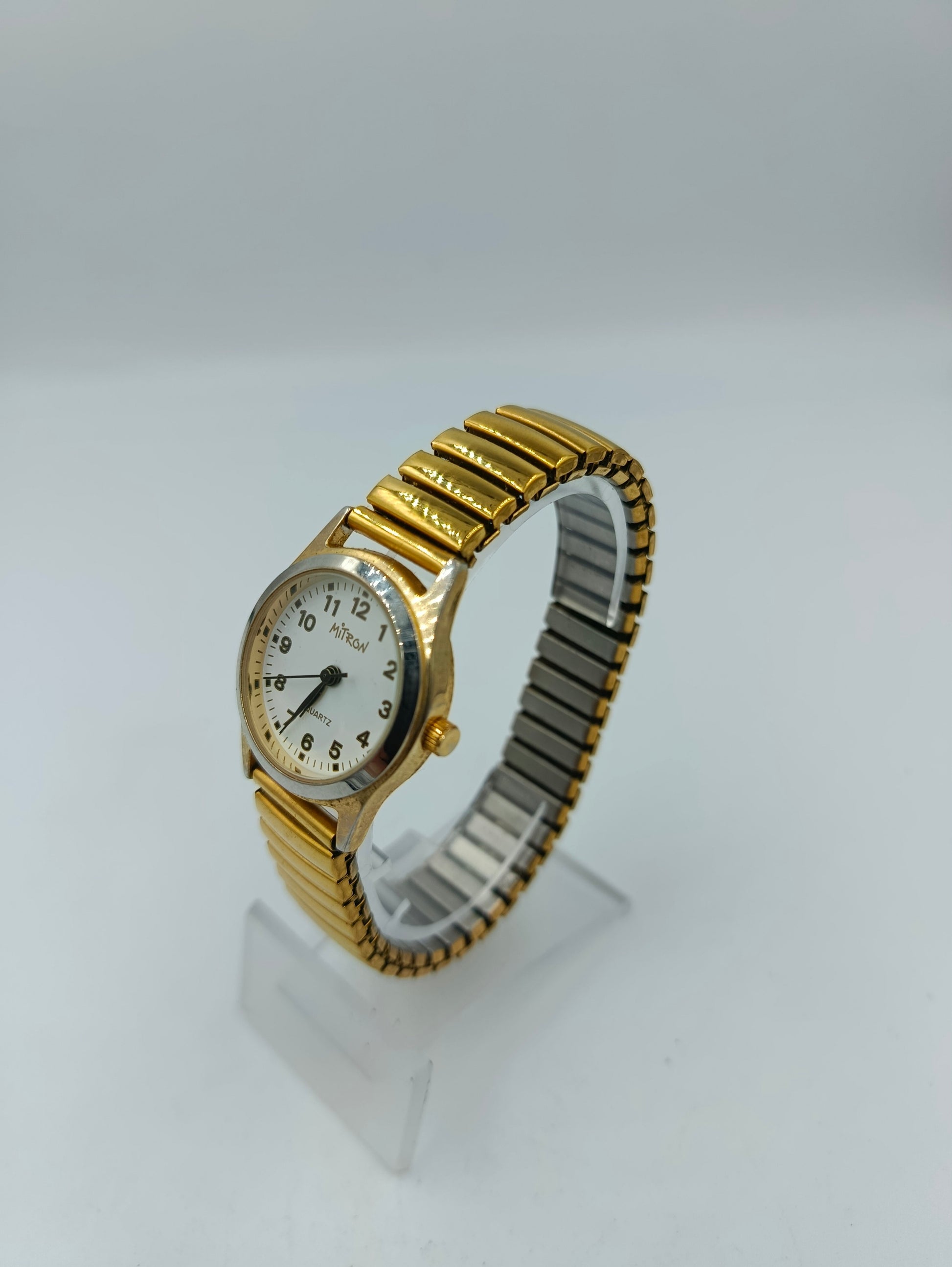 Klassische Mitron Quartz Armbanduhr mit zeitlosem Design in goldfarbener Optik. Das weiße Zifferblatt mit schwarzen Zahlen sorgt für eine klare Lesbarkeit. Das elastische Metallarmband passt sich dem Handgelenk bequem an und macht die Uhr ideal für den täglichen Gebrauch.