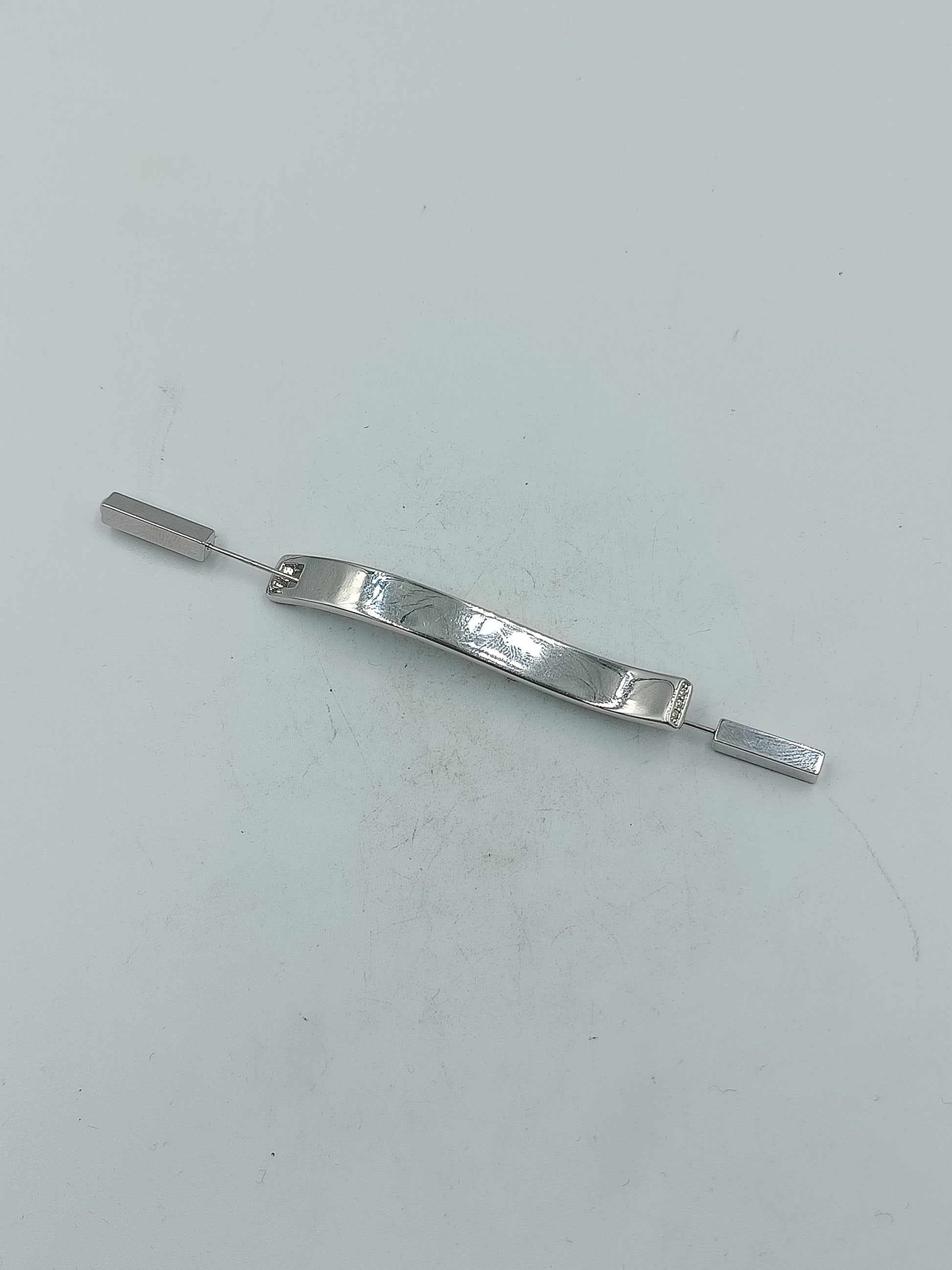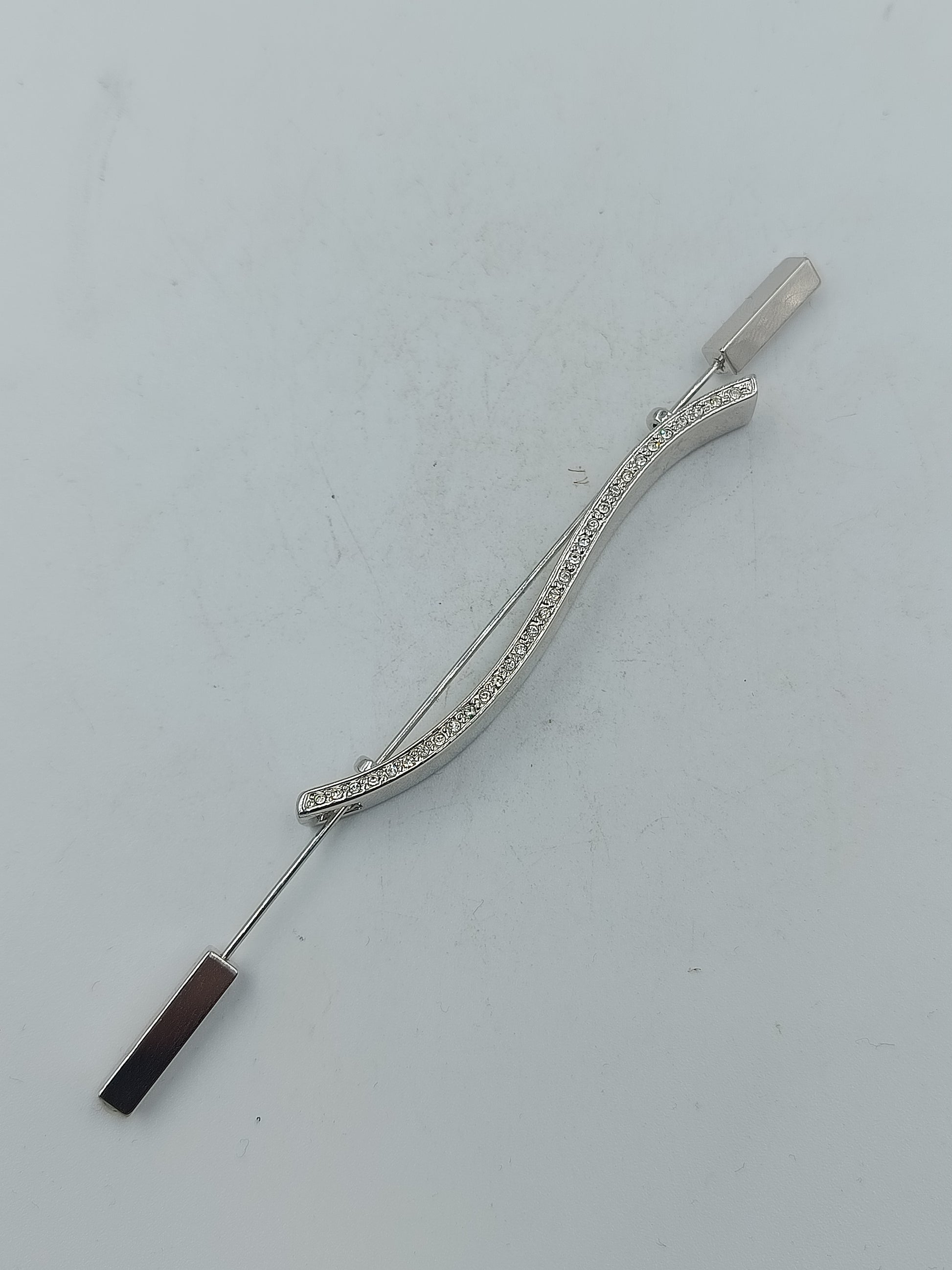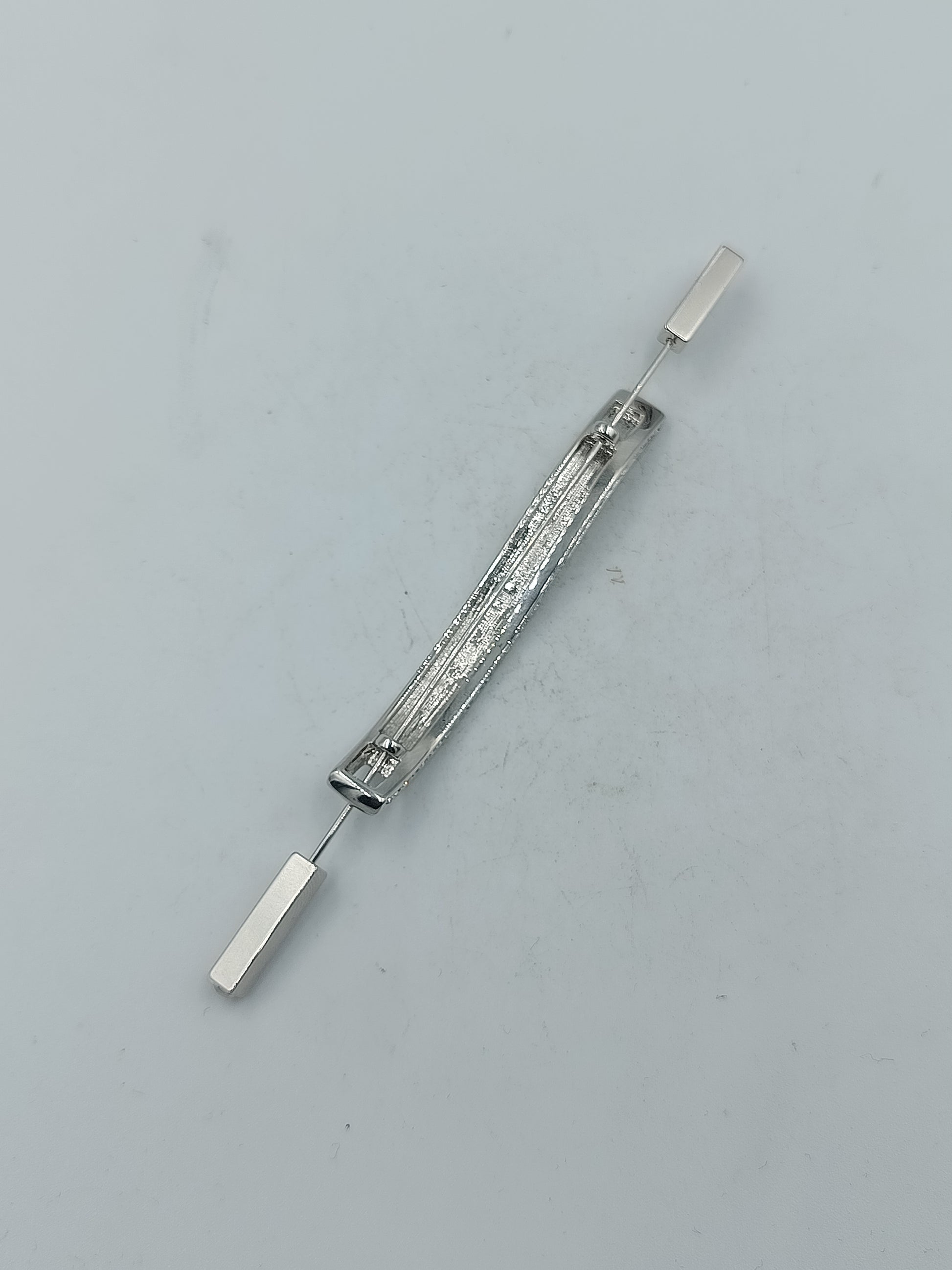 Diese moderne, silberfarbene Anstecknadel (auch Reversnadel oder Pin genannt) stammt von der österreichischen Marke Pierre Lang und ist auf der Rückseite mit dem "PL"-Stempel versehen. Das Hauptmerkmal ist die gehämmerte, strukturierte Oberfläche des Metallstabs, die dem Schmuckstück einen markanten, handwerklichen Look verleiht. Der Nadelverschluss ist einfach und funktional. Es handelt sich um hochwertigen Modeschmuck, der keine allergischen Reaktionen hervorrufen soll und jedem Outfit eine stilvolle Note verleiht.