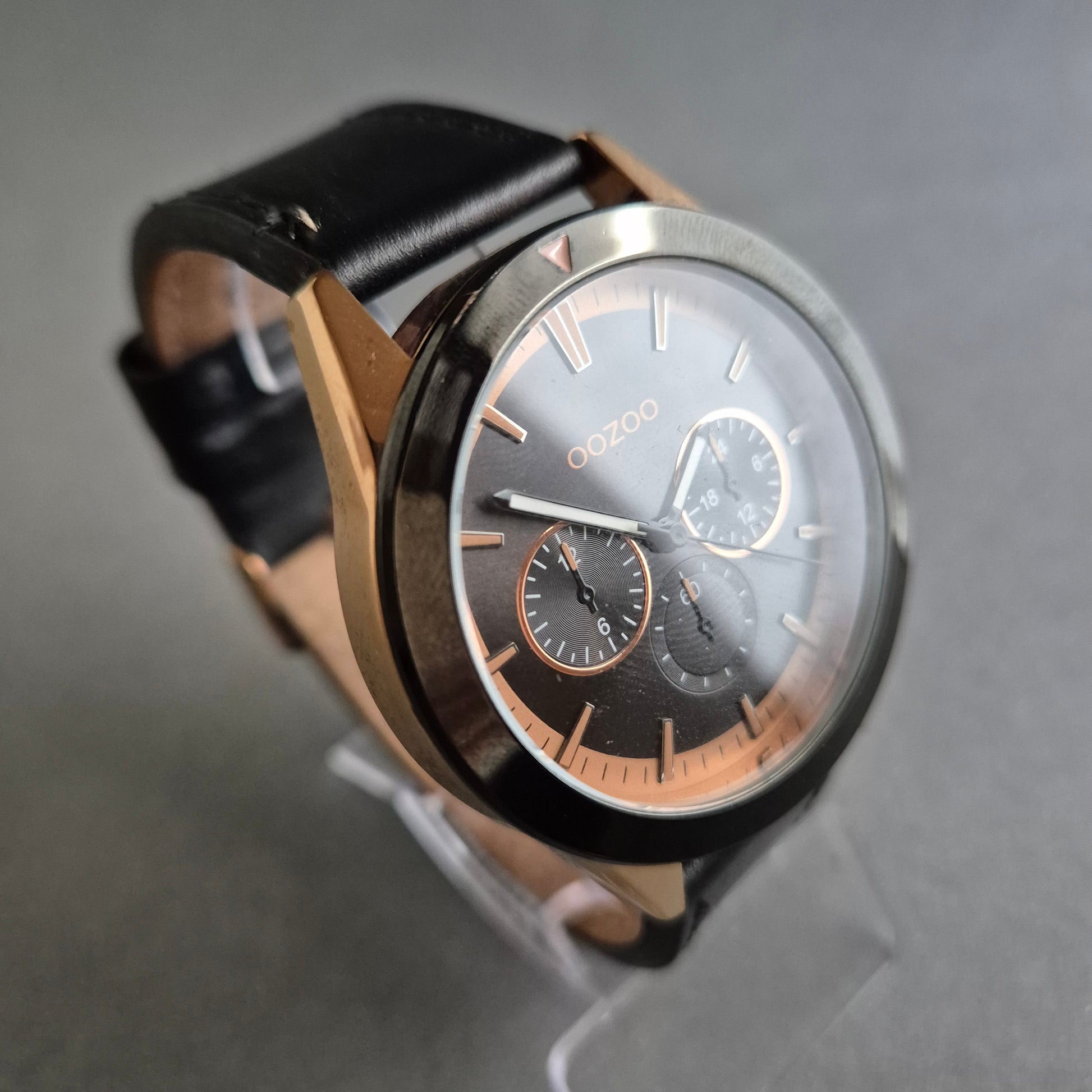 Diese OOZOO Herrenarmbanduhr überzeugt mit einem zeitgemäßen Design und sportlich-eleganter Ausstrahlung. Das roségoldfarbene Gehäuse harmoniert perfekt mit dem schwarz glänzenden Zifferblatt und den drei dekorativen Totalisatoren im Chronographen-Stil. Ein schwarzes Echtlederarmband sorgt für angenehmen Tragekomfort und rundet das stilvolle Gesamtbild ab. Ideal für modebewusste Männer, die auf einen coolen Look setzen.