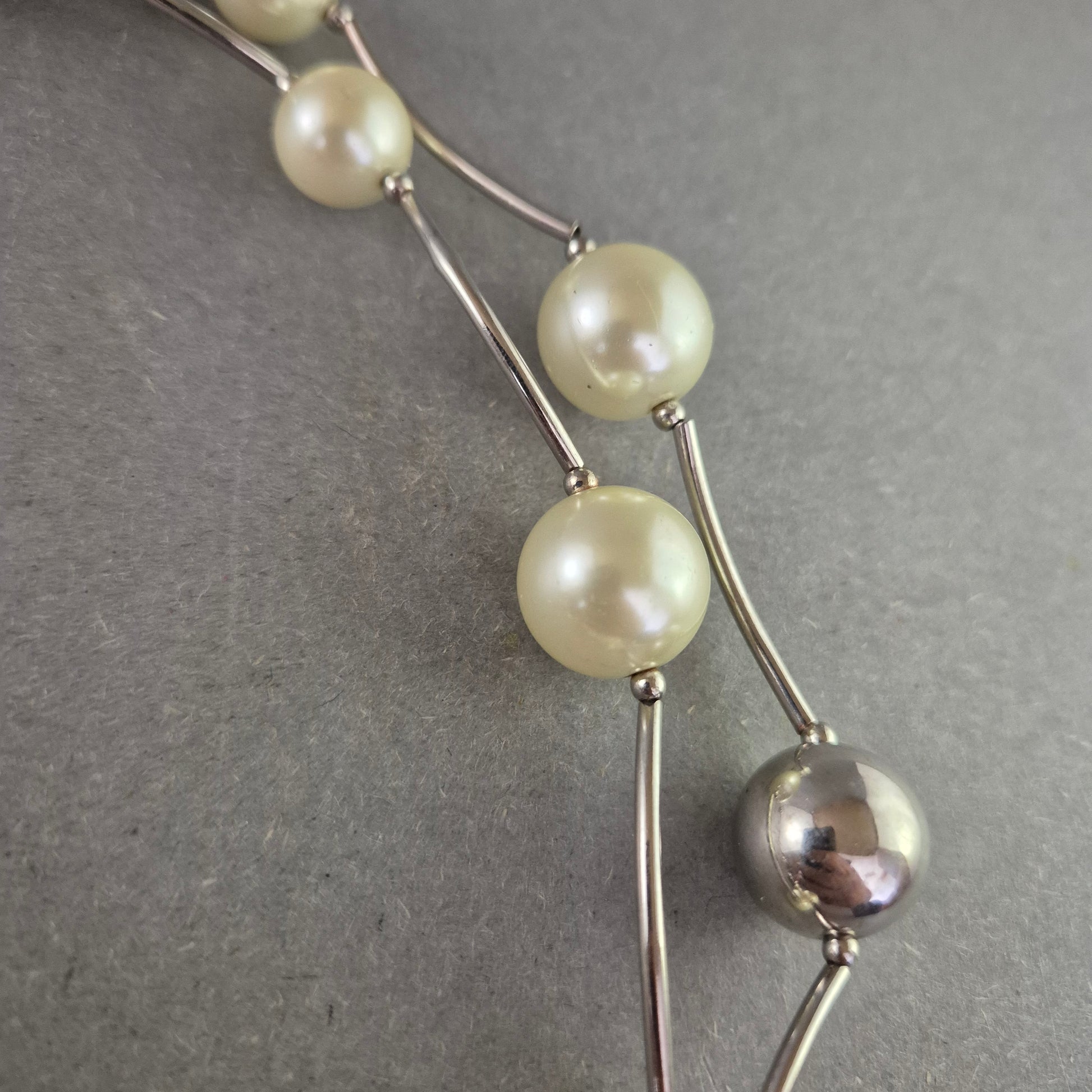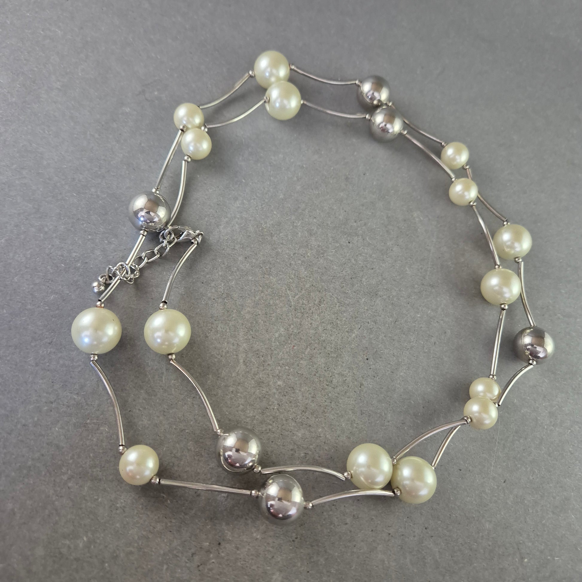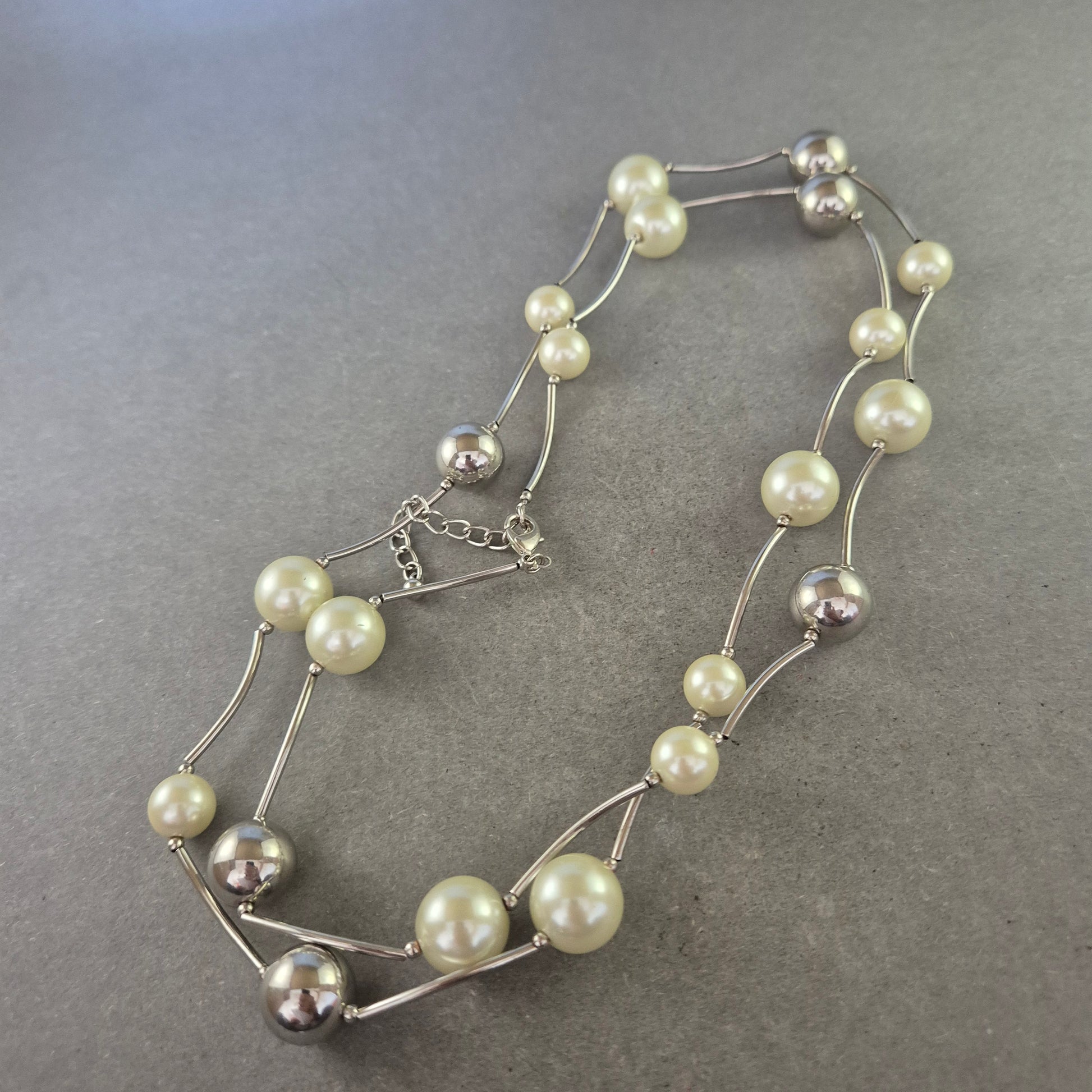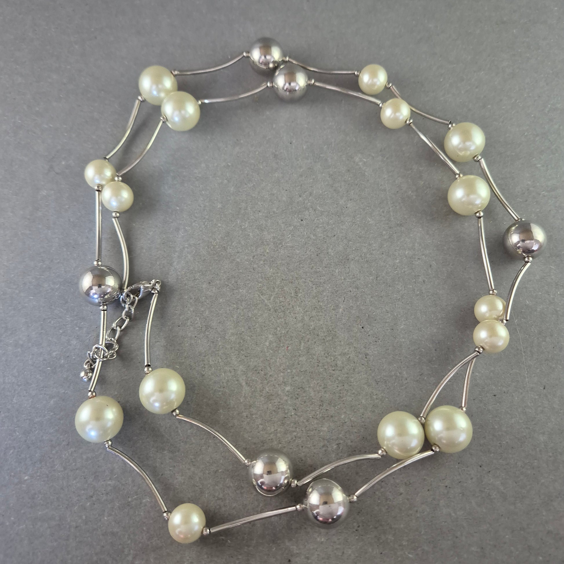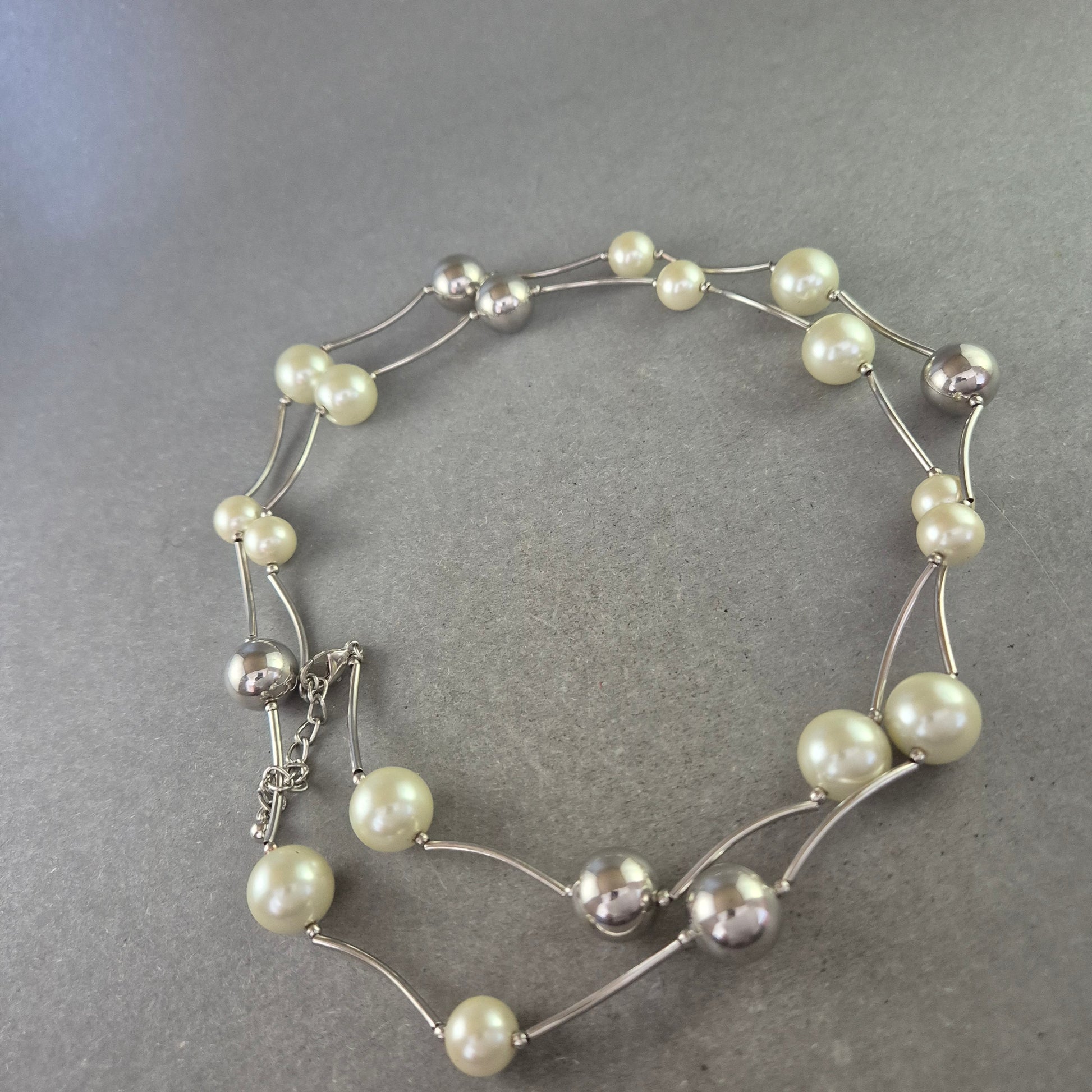 Diese moderne Halskette überzeugt durch ihre kreative Kombination aus klassischen cremefarbenen Perlen und glänzenden silberfarbenen Kugeln. Die filigranen Metallstäbe und das doppelte Strangdesign verleihen ihr eine elegante Struktur mit einem zeitgemäßen Touch. Ideal für stilbewusste Trägerinnen, die klassischen Schmuck mit einem modernen Twist suchen.