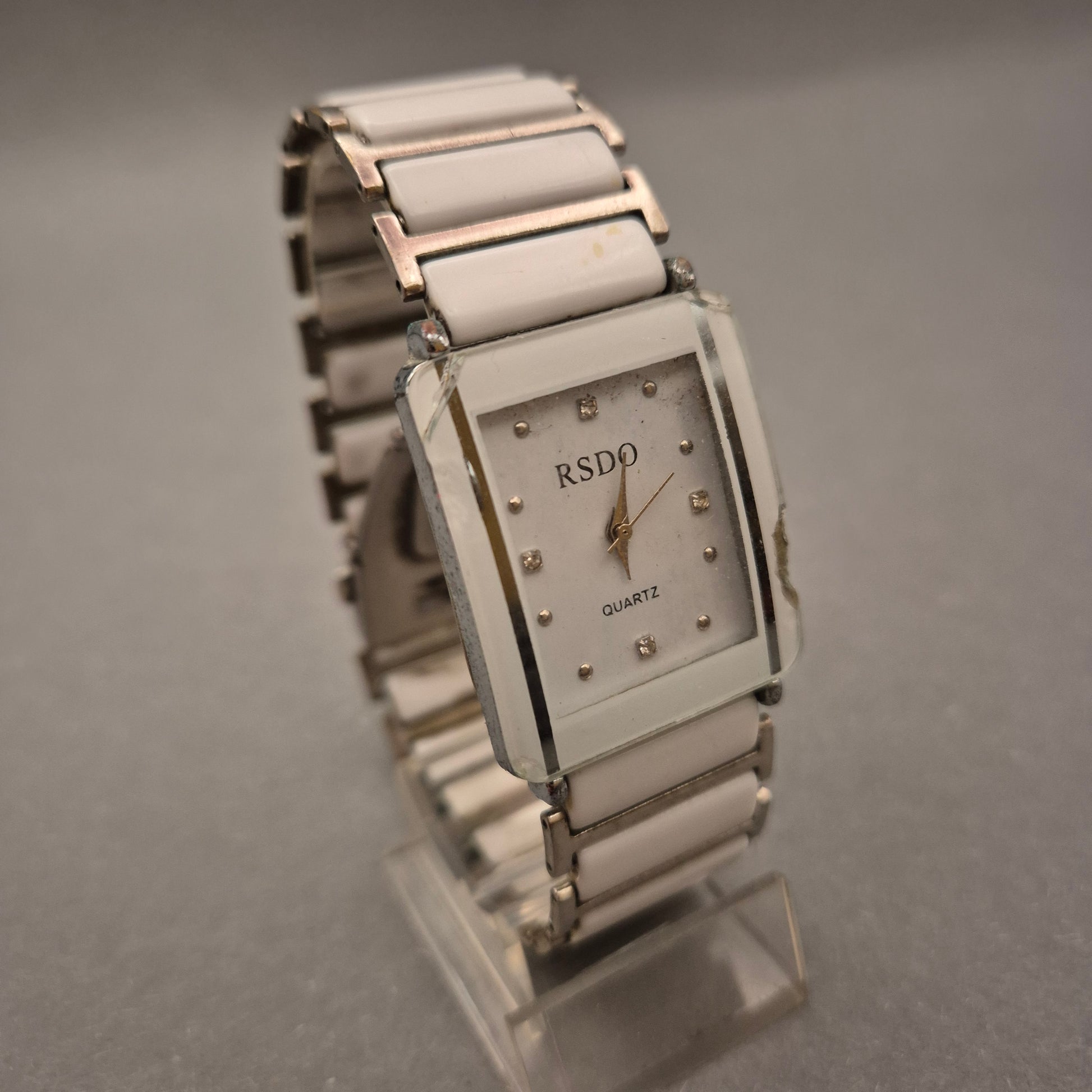 Diese stilvolle RSDO Damen Uhr präsentiert sich in einem modernen, eleganten Design, das an Keramik-Uhren erinnert. Das rechteckige Gehäuse in Silberoptik umschließt ein weißes Zifferblatt, auf dem funkelnde, kleine Steinchen als luxuriöse Indexe dienen. Das Gliederarmband wechselt elegant zwischen silberfarbenen Metallelementen und glänzenden weißen Einsätzen. Obwohl es sich um ein gebrauchtes Stück handelt, ist diese Uhr ein modisches Accessoire, das perfekt zu zeitgenössischen Outfits passt und dem Handgelenk eine helle, schicke Note verleiht. Details: