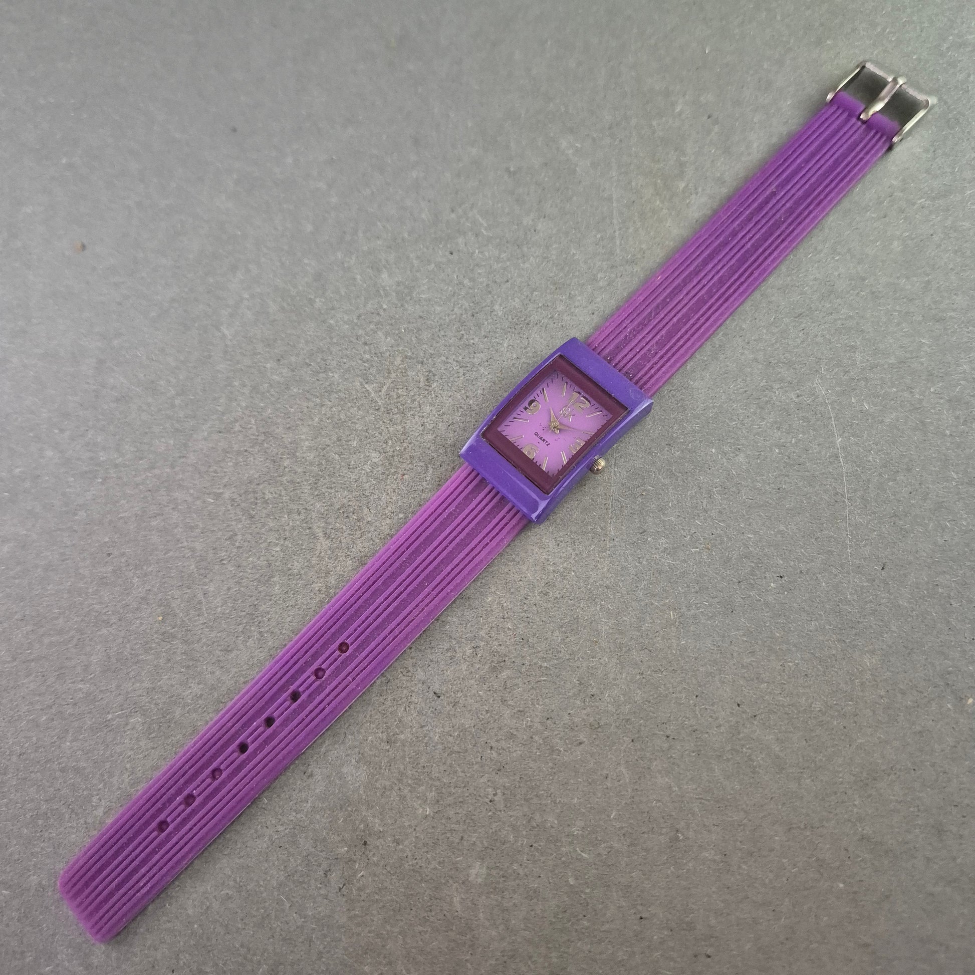 Diese modische Damen Uhr bringt Farbe ins Spiel! Mit ihrem rechteckigen Gehäuse, dem lila Zifferblatt und dem dazu passenden Armband ist sie ein echter Blickfang. Das leichte Kunststoffgehäuse sorgt für angenehmen Tragekomfort, während das Quarzwerk eine zuverlässige Zeitanzeige garantiert. Perfekt für modebewusste Damen, die auffällige Accessoires lieben.