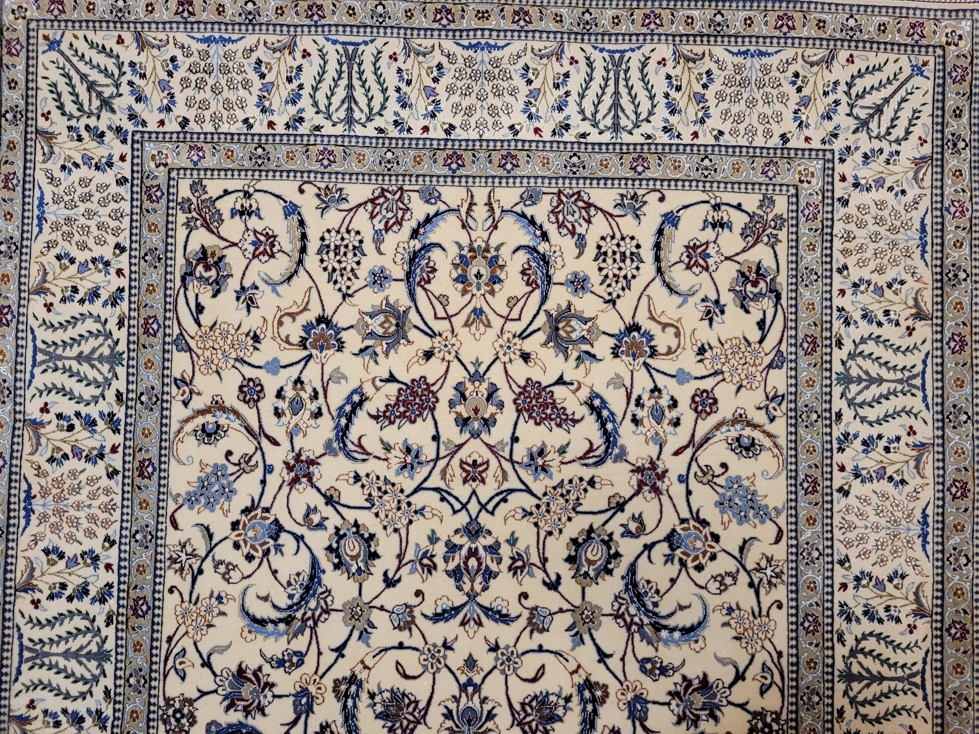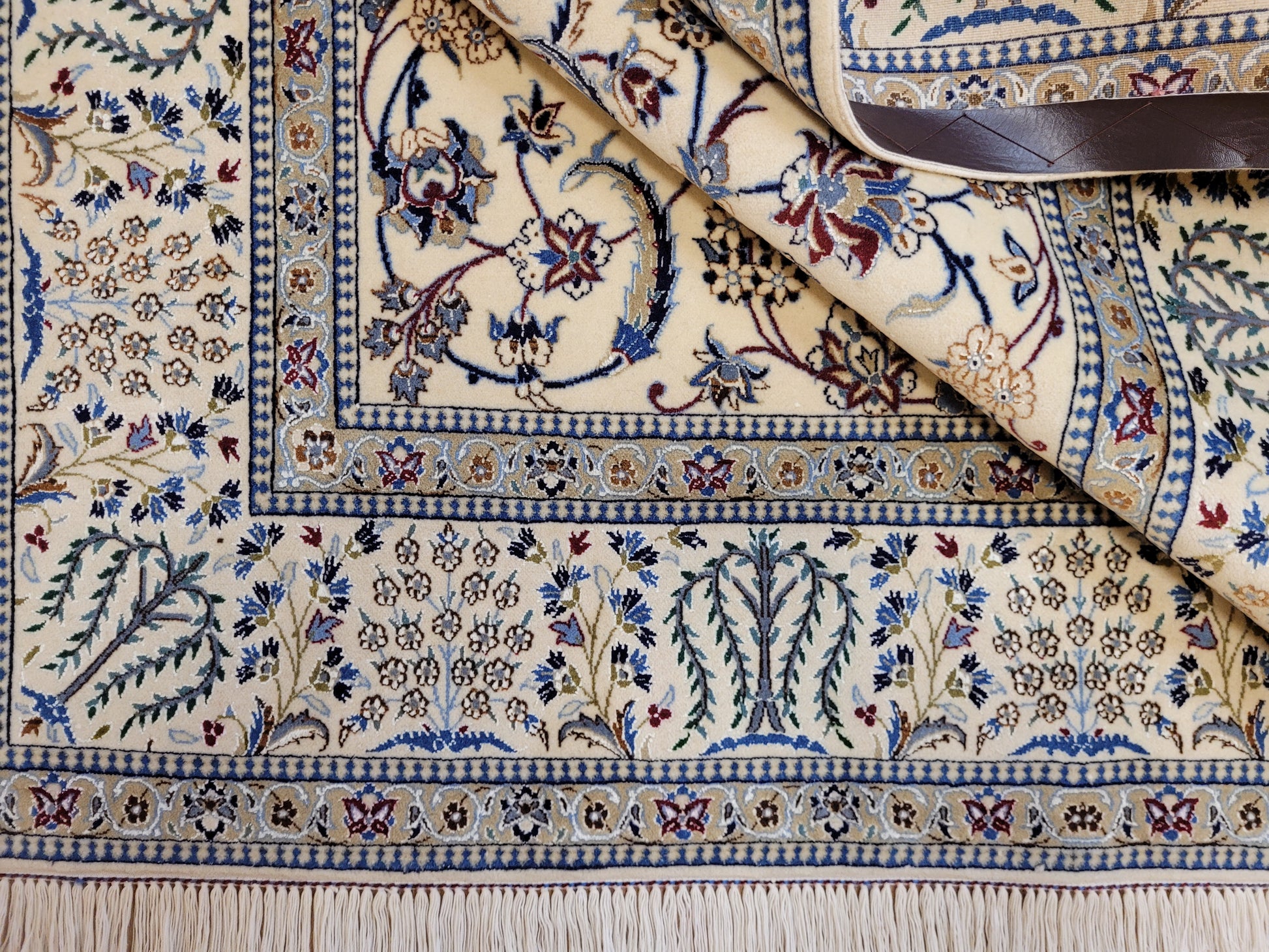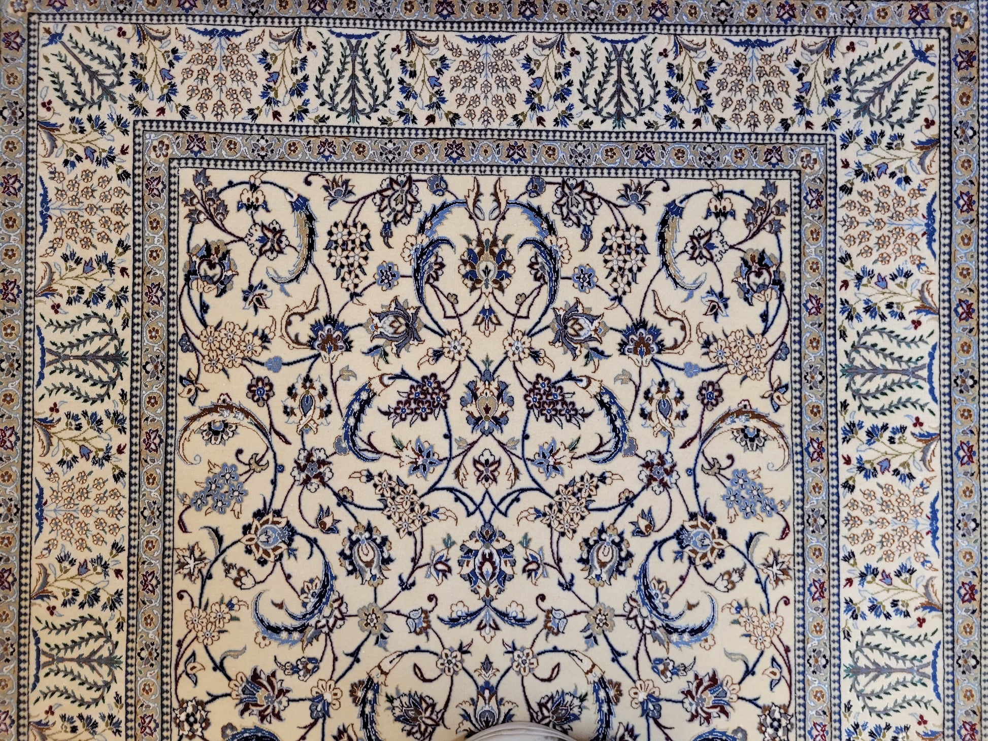 angeboten wird ein eleganter Nain Teppich, handgeknüpft aus feiner Korkwolle mit Seidenakzenten. Durch die Verwendung von Seide wird das detailreiche Muster hervorgehoben und erhält einen edlen Glanz. Das Design ist klassisch mit zentralem Medaillon, floraler Füllung und reich verzierter Bordüre.