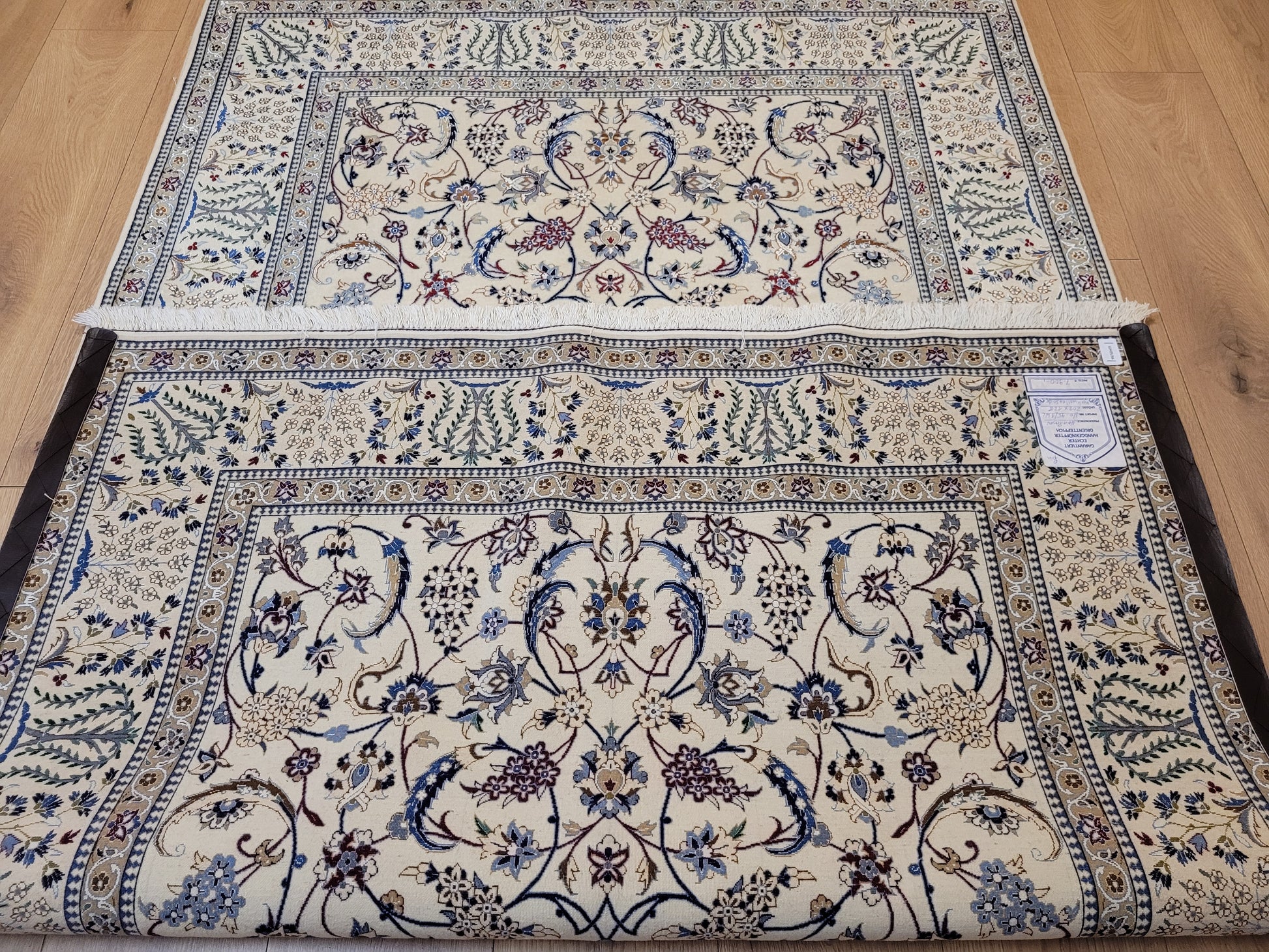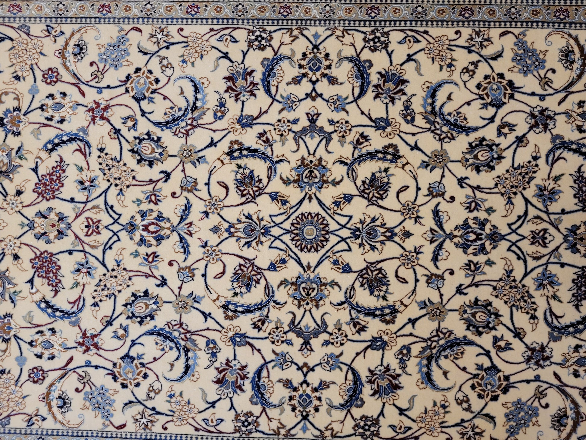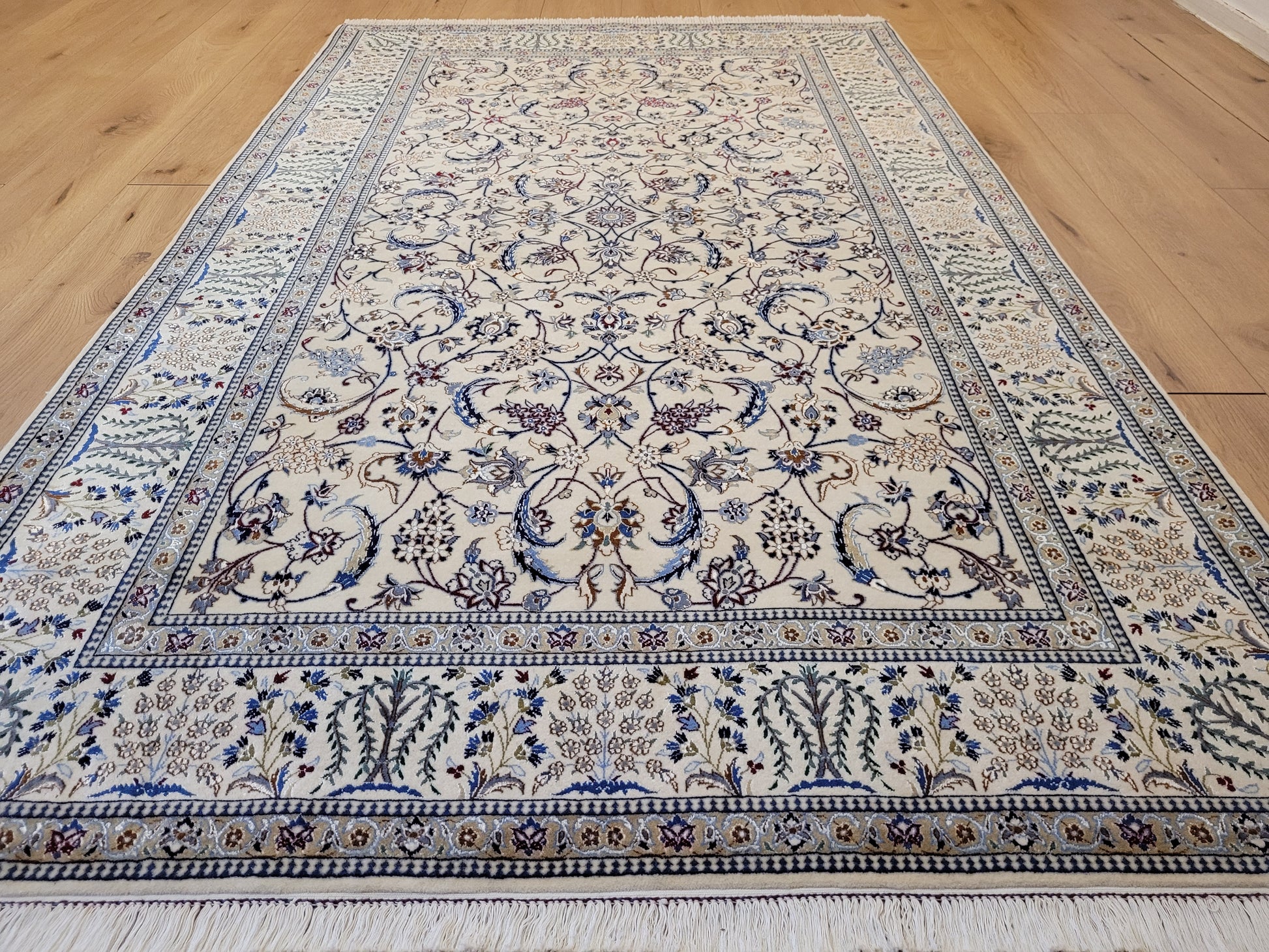 angeboten wird ein eleganter Nain Teppich, handgeknüpft aus feiner Korkwolle mit Seidenakzenten. Durch die Verwendung von Seide wird das detailreiche Muster hervorgehoben und erhält einen edlen Glanz. Das Design ist klassisch mit zentralem Medaillon, floraler Füllung und reich verzierter Bordüre.