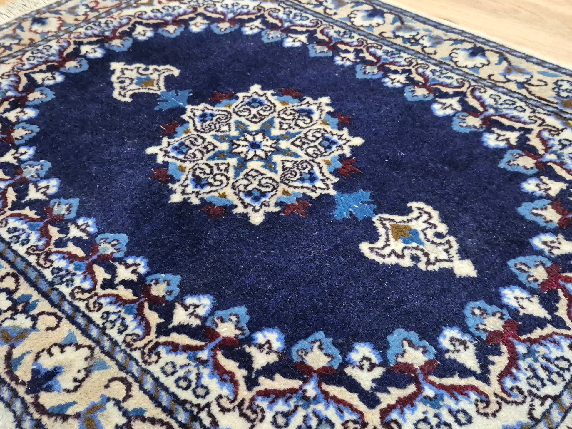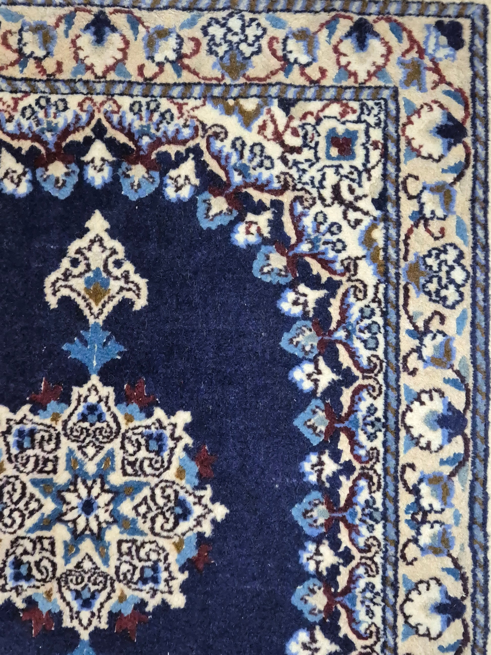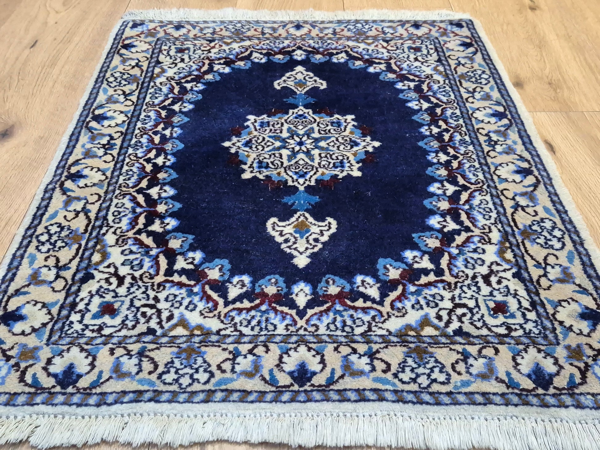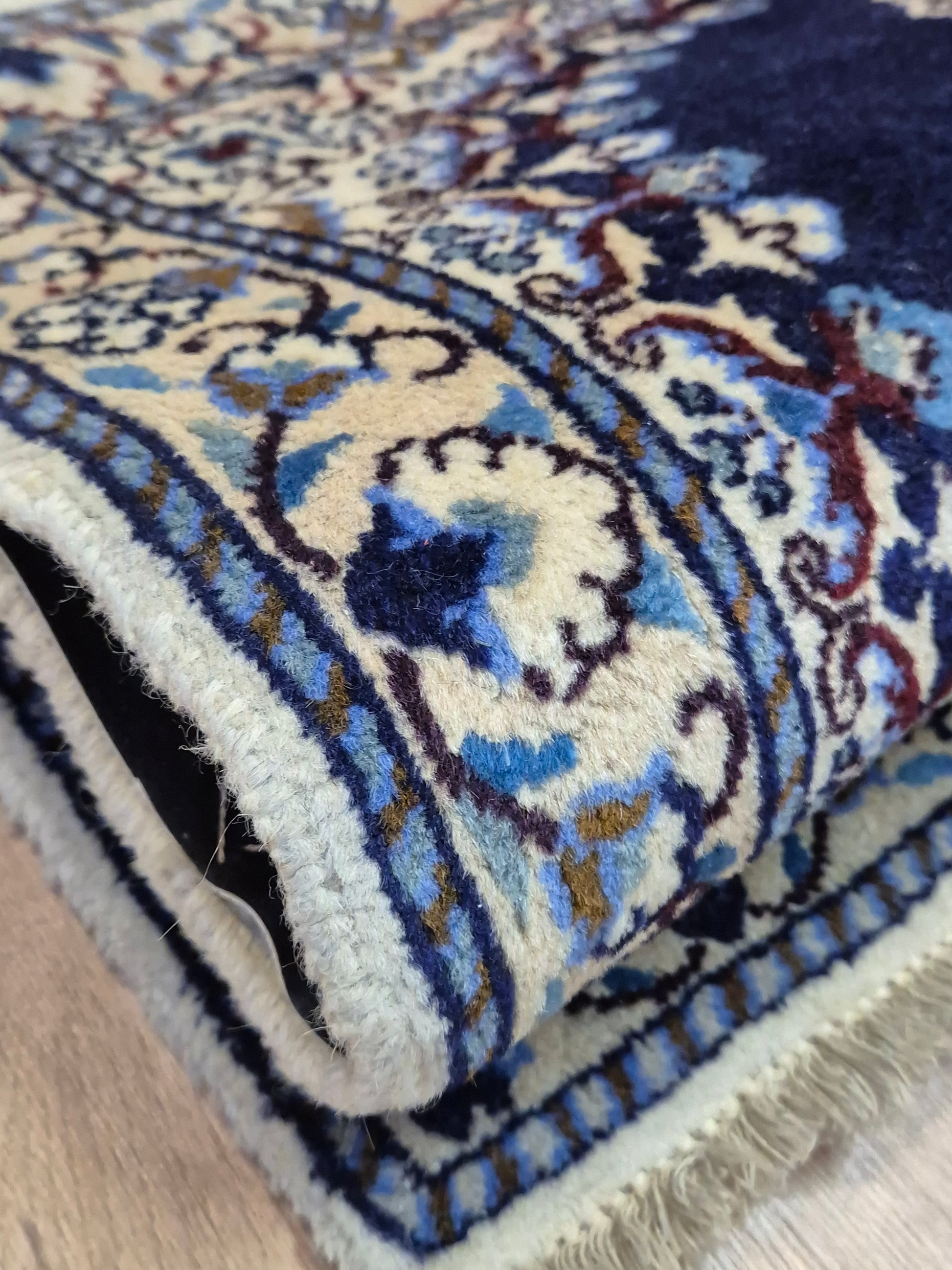 angeboten wird ein feiner Nain Teppich aus Wolle mit Seide, handgeknüpft in traditioneller Ausführung. Das Design zeigt ein harmonisches Mittelmedaillon auf tiefblauem Fond, eingefasst von floralen Ornamenten und zarten Arabesken. Die eingearbeiteten Seidendetails verleihen dem Teppich einen edlen Glanz und betonen die feinen Konturen der Muster.