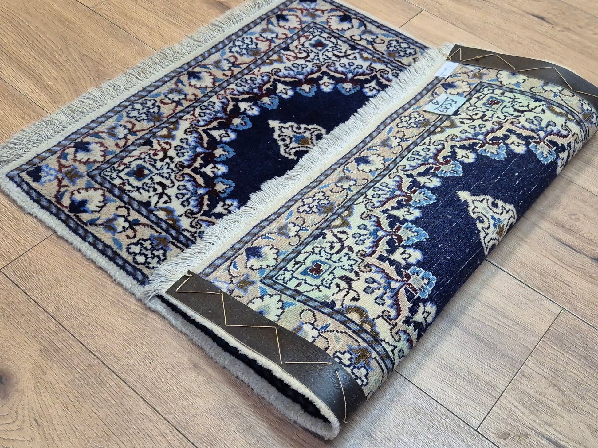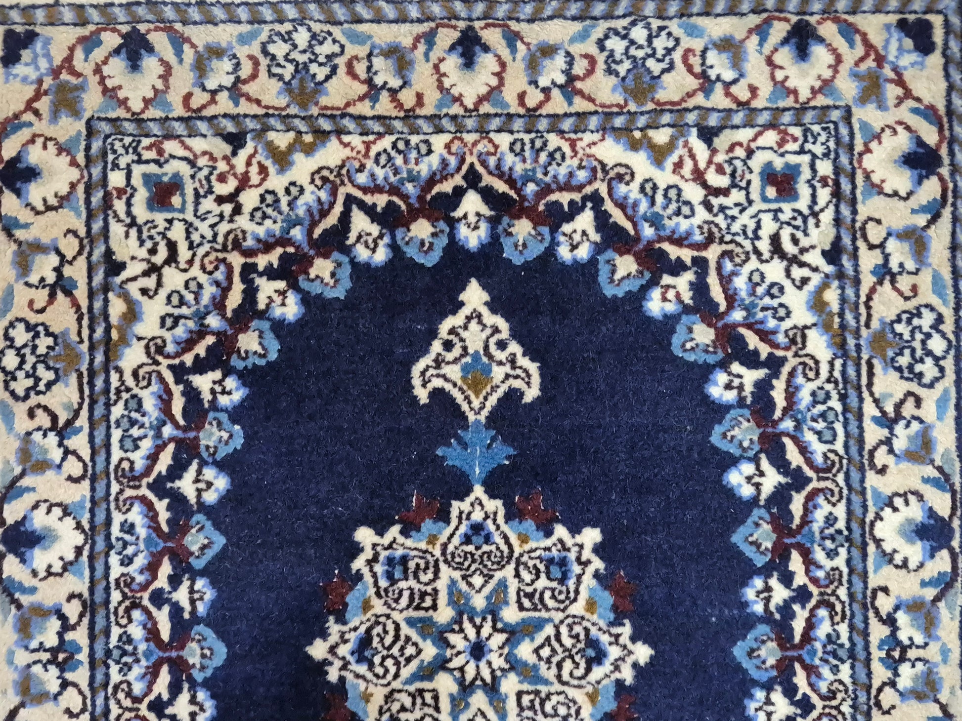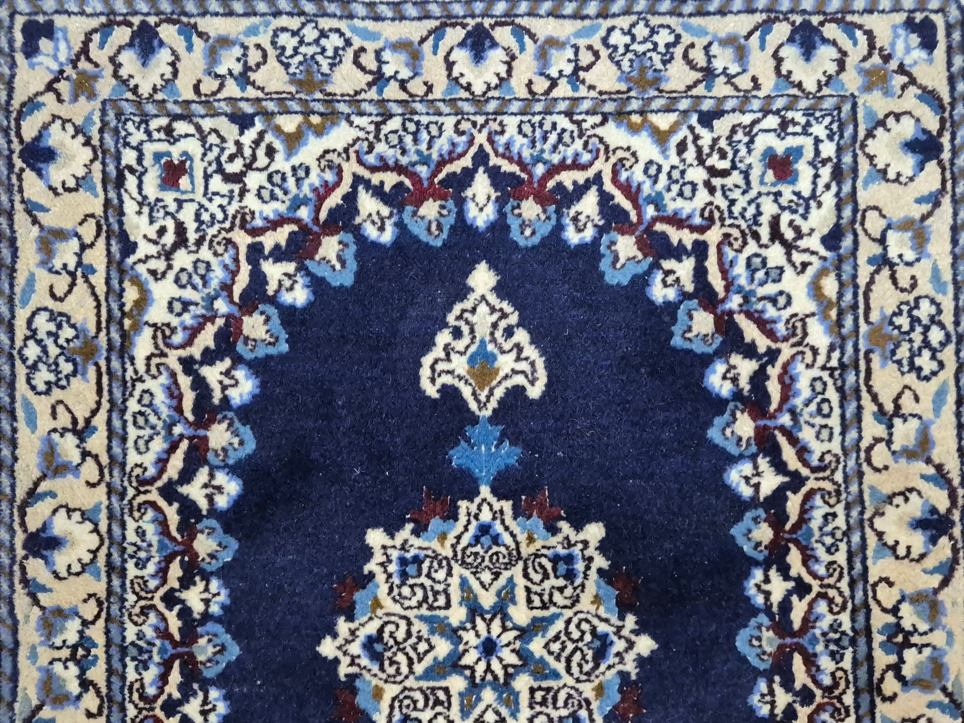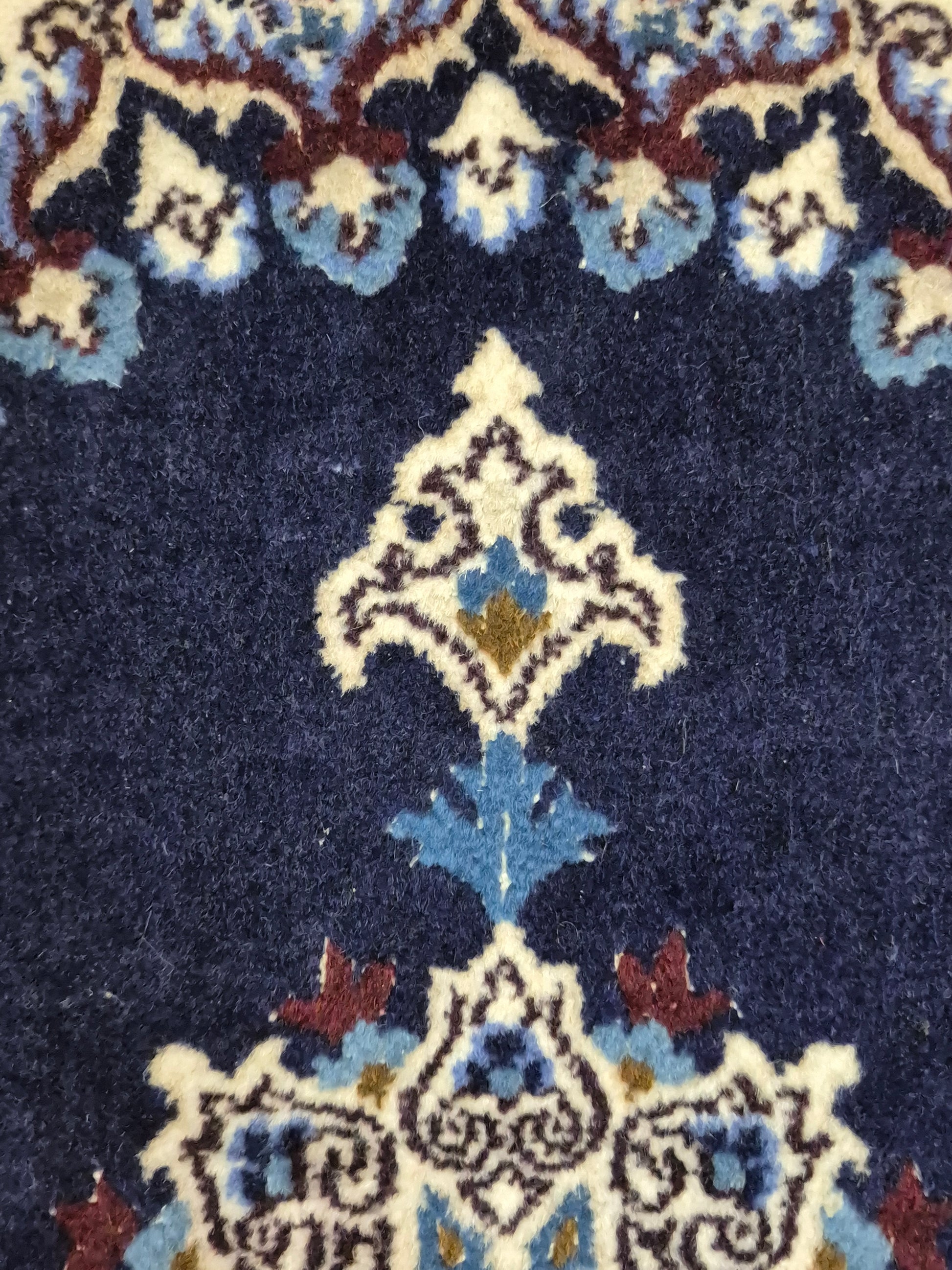 angeboten wird ein feiner Nain Teppich aus Wolle mit Seide, handgeknüpft in traditioneller Ausführung. Das Design zeigt ein harmonisches Mittelmedaillon auf tiefblauem Fond, eingefasst von floralen Ornamenten und zarten Arabesken. Die eingearbeiteten Seidendetails verleihen dem Teppich einen edlen Glanz und betonen die feinen Konturen der Muster.