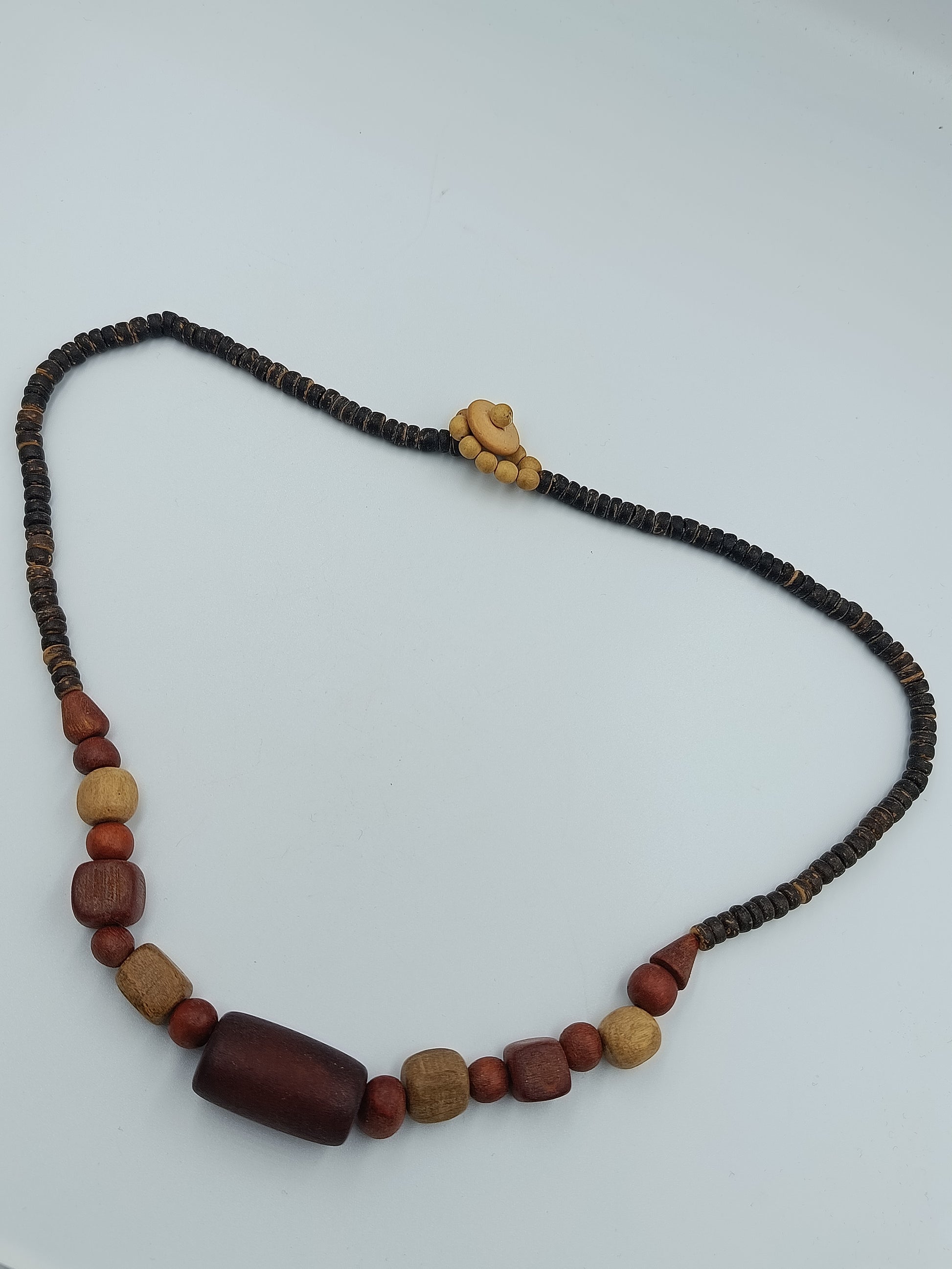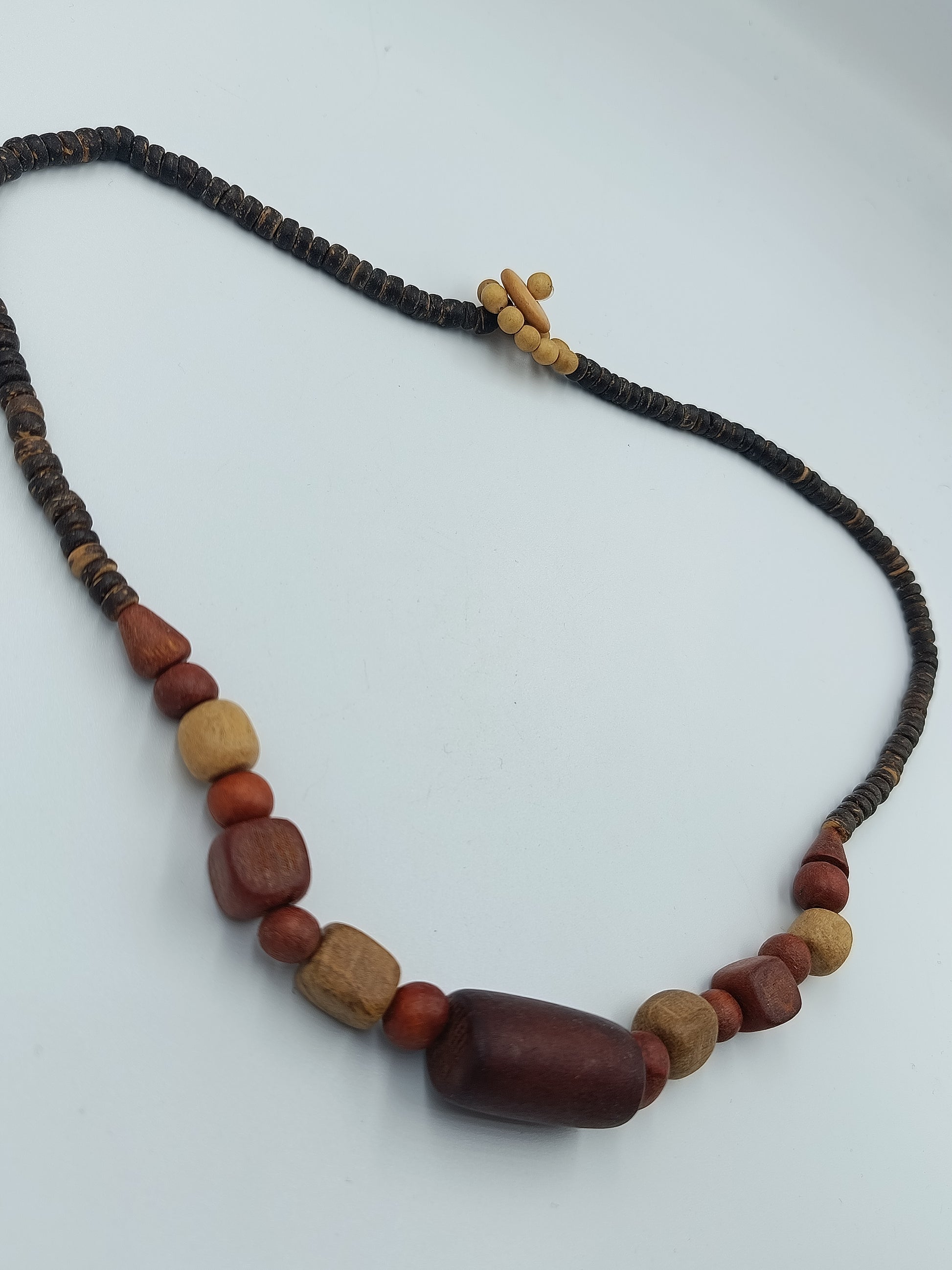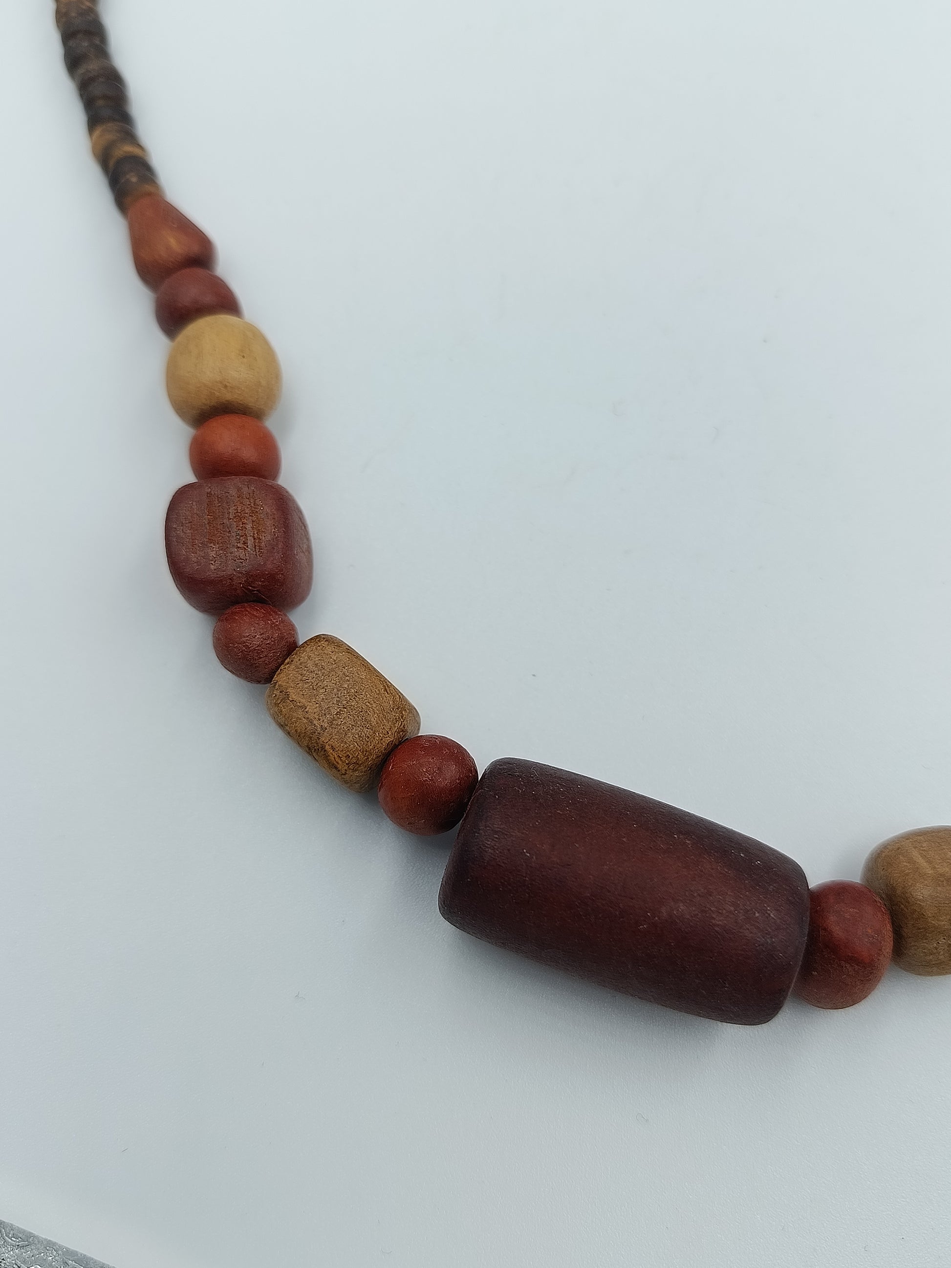 Rustikale, handgefertigte Holzperlenkette in verschiedenen Formen und warmen Naturtönen. Die Kombination aus runden, eckigen und zylinderförmigen Perlen verleiht der Kette einen natürlichen, organischen Look. Perfekt für einen lässigen Boho- oder Ethno-Style.