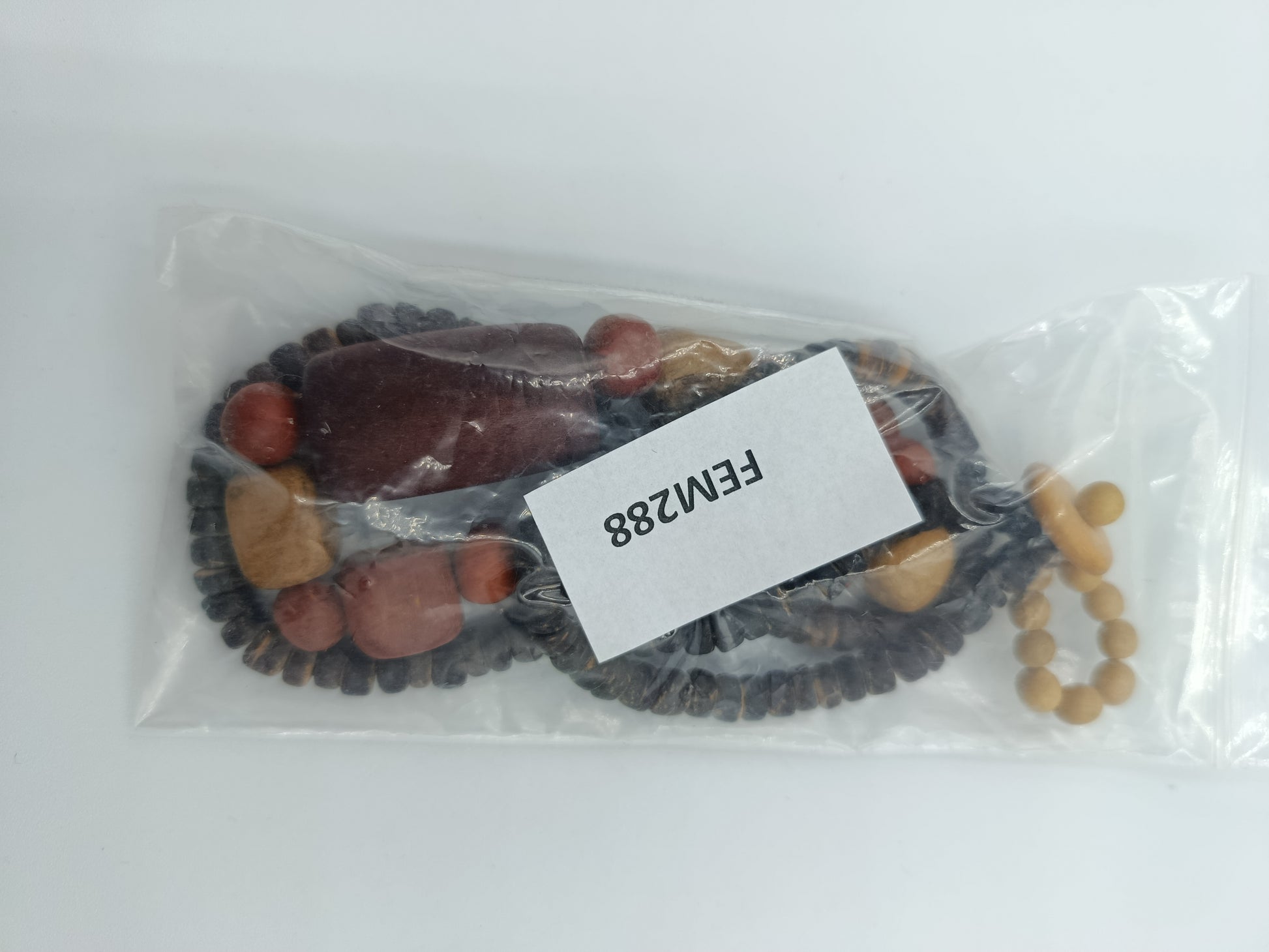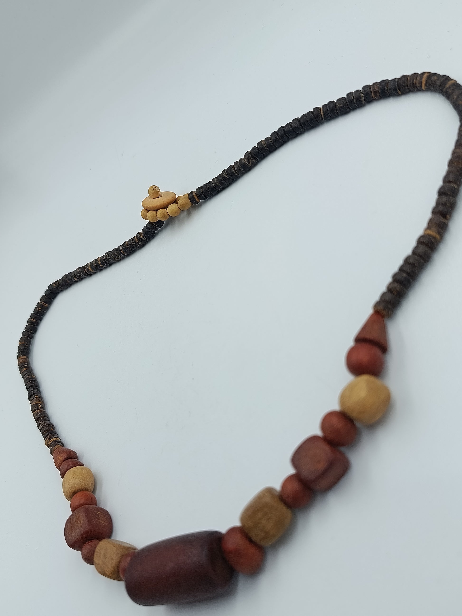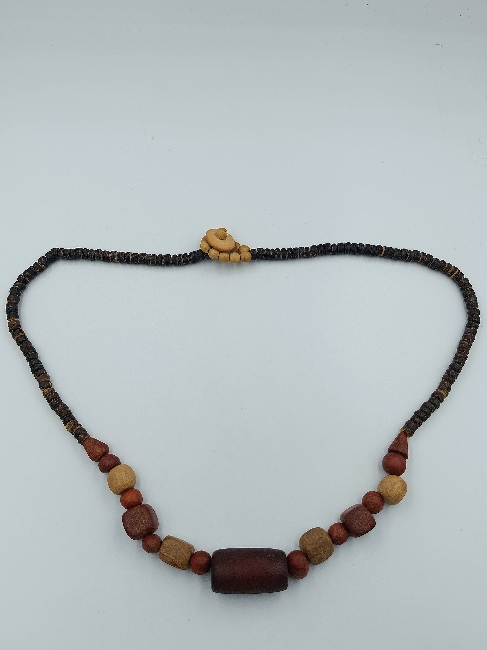 Rustikale, handgefertigte Holzperlenkette in verschiedenen Formen und warmen Naturtönen. Die Kombination aus runden, eckigen und zylinderförmigen Perlen verleiht der Kette einen natürlichen, organischen Look. Perfekt für einen lässigen Boho- oder Ethno-Style.