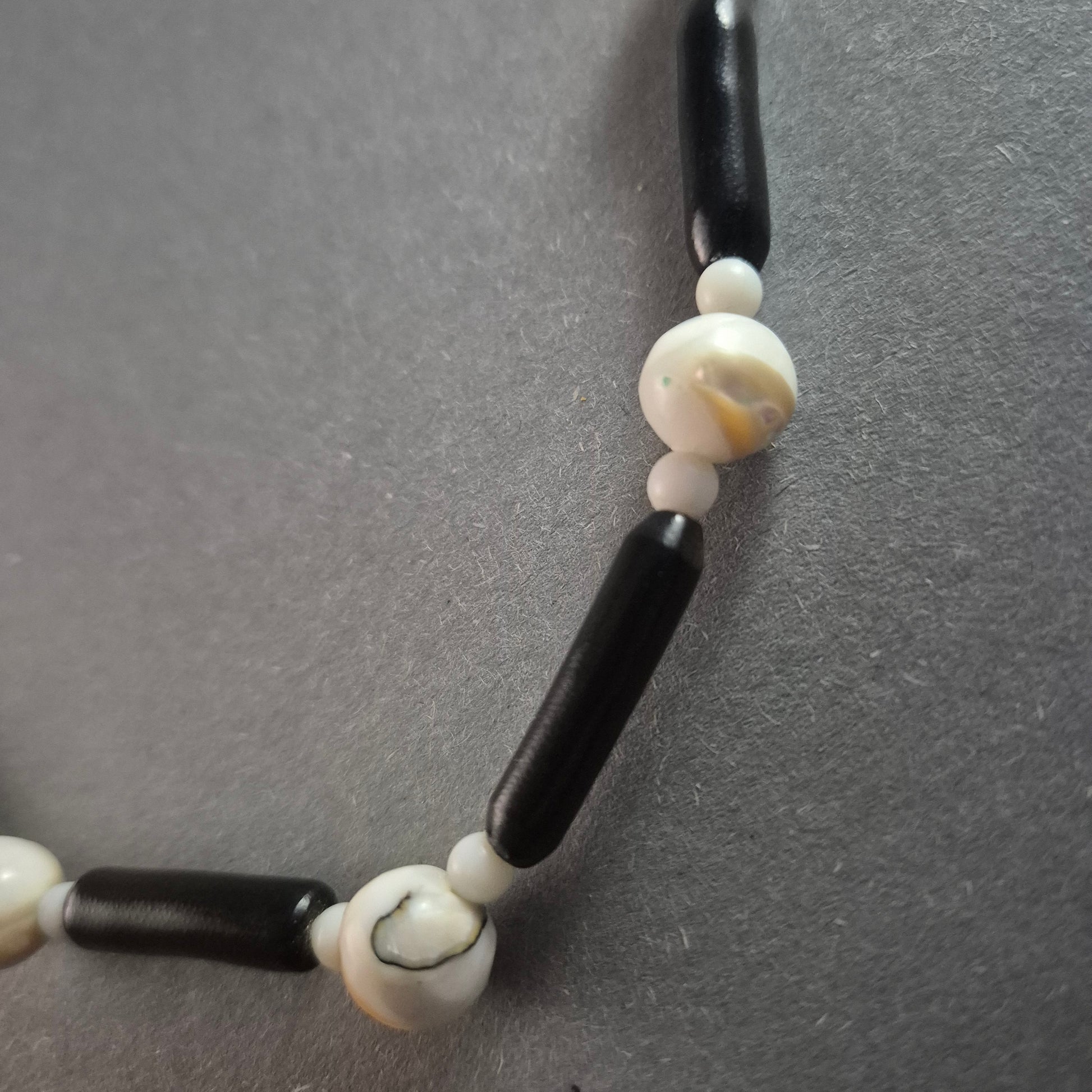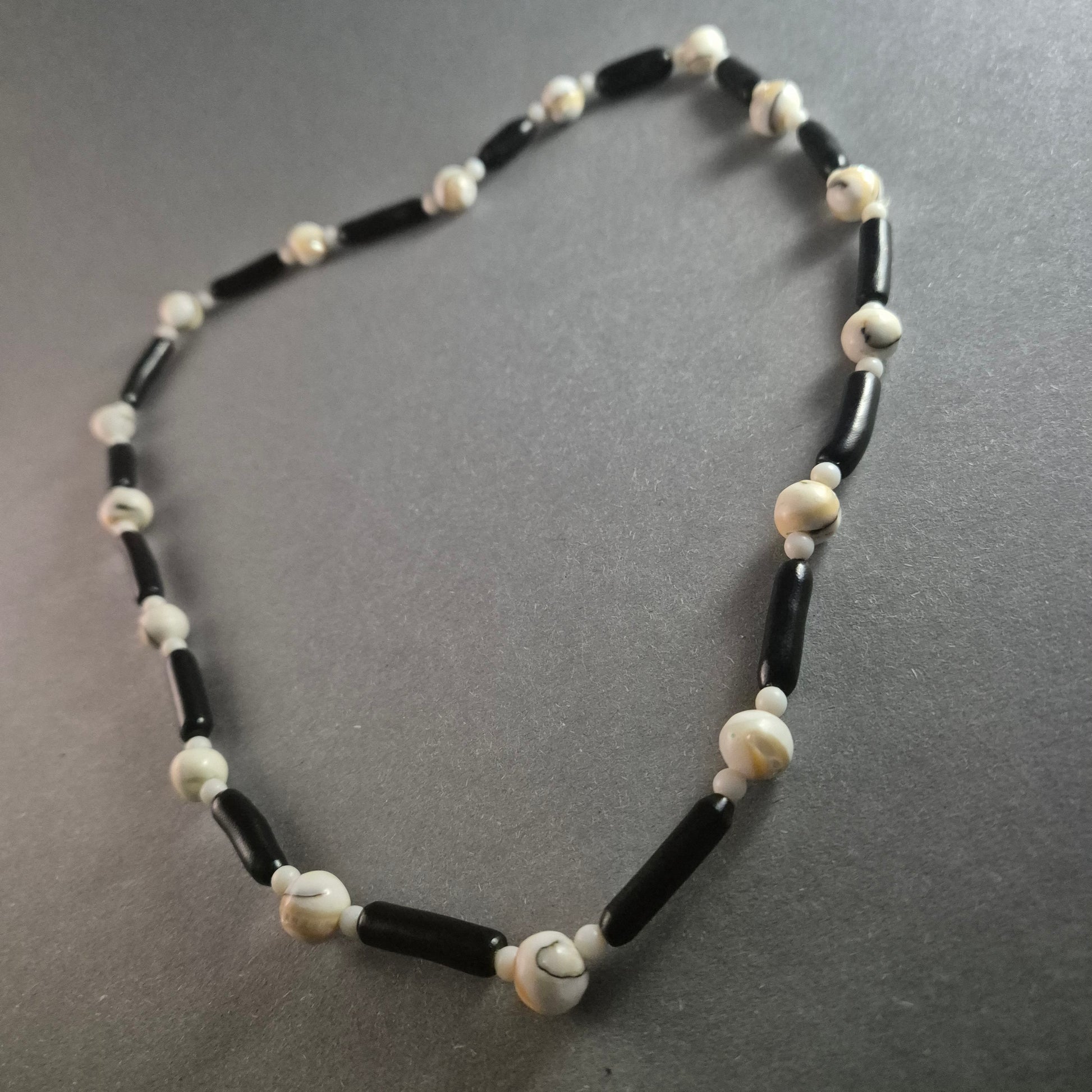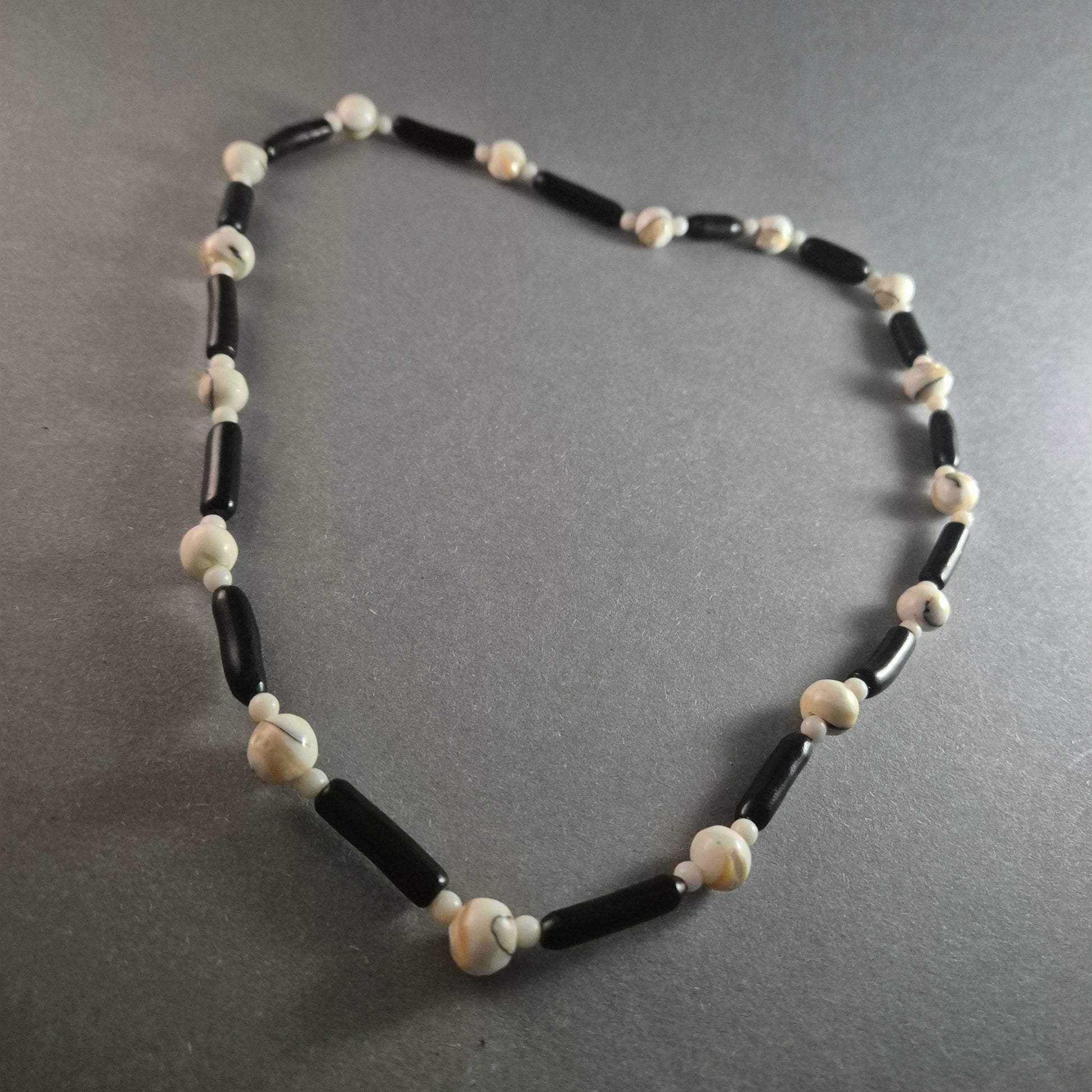 Diese einzigartige Vintage-Perlenkette kombiniert natürliche Muschelperlen mit dunklen Holzperlen zu einem harmonischen Design. Die kontrastreiche Kombination aus runden, cremefarbenen Muschelkugeln und länglichen schwarzen Holzperlen verleiht der Kette eine stilvolle, natürliche Ästhetik. Perfekt für Liebhaber maritimer oder ethnisch inspirierter Schmuckstücke.