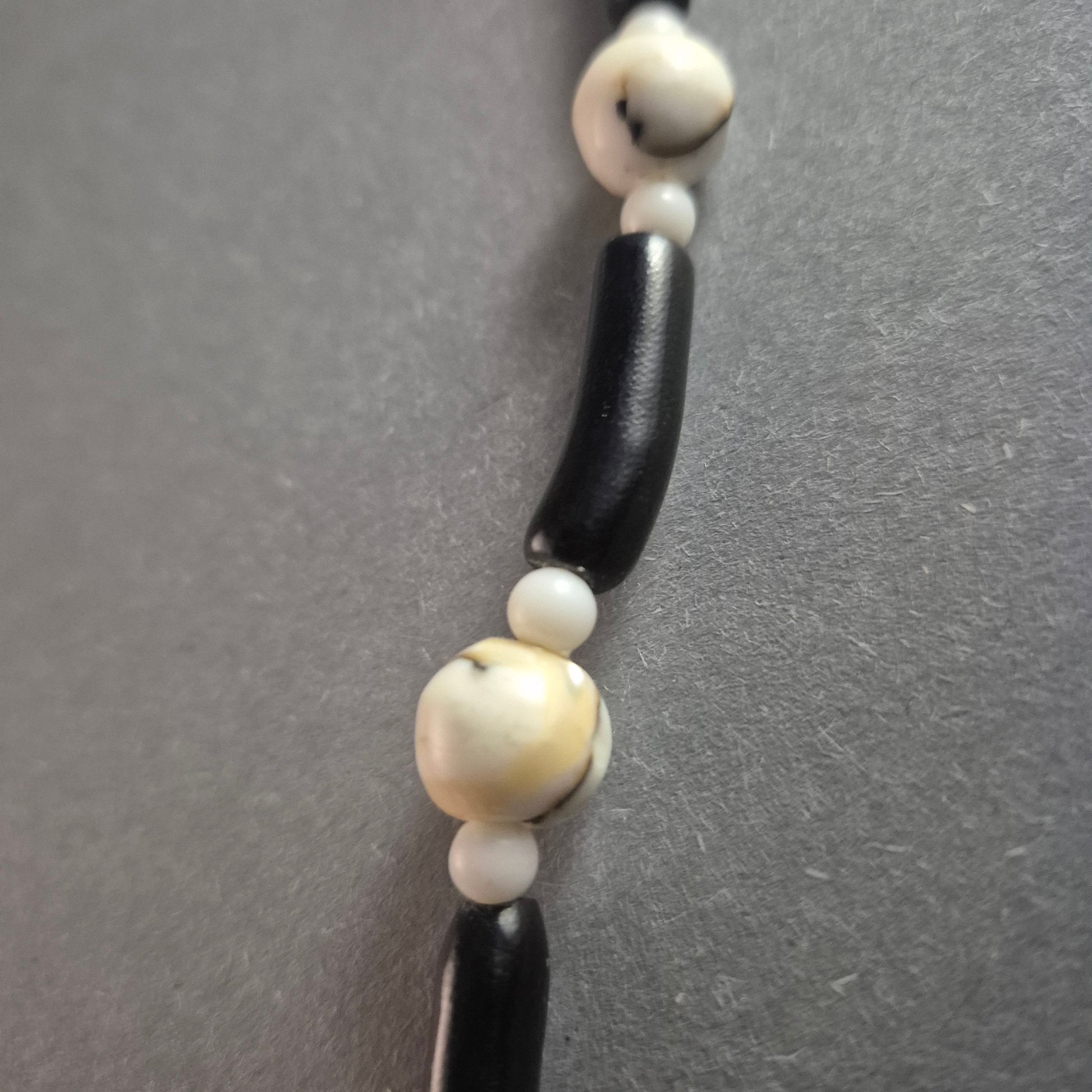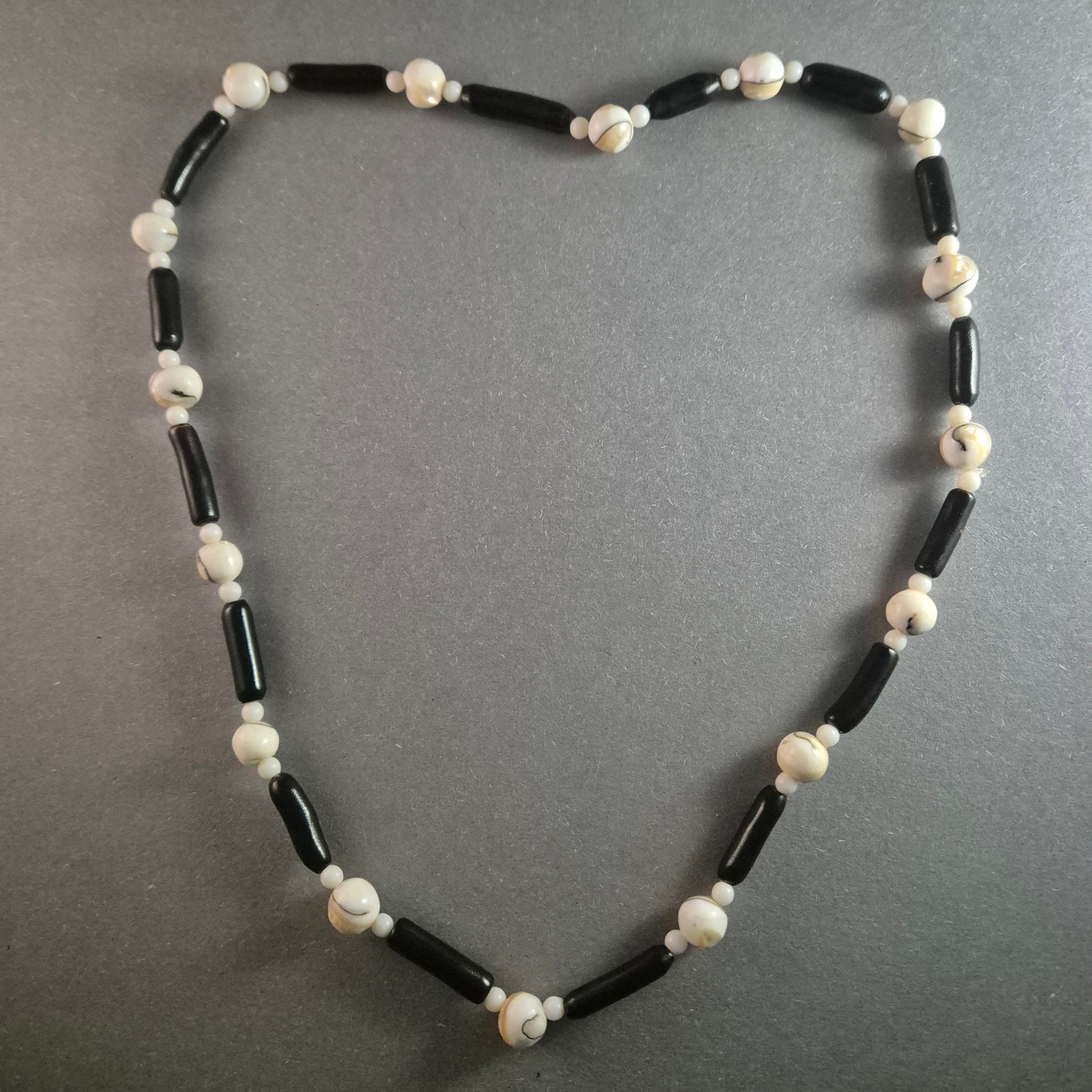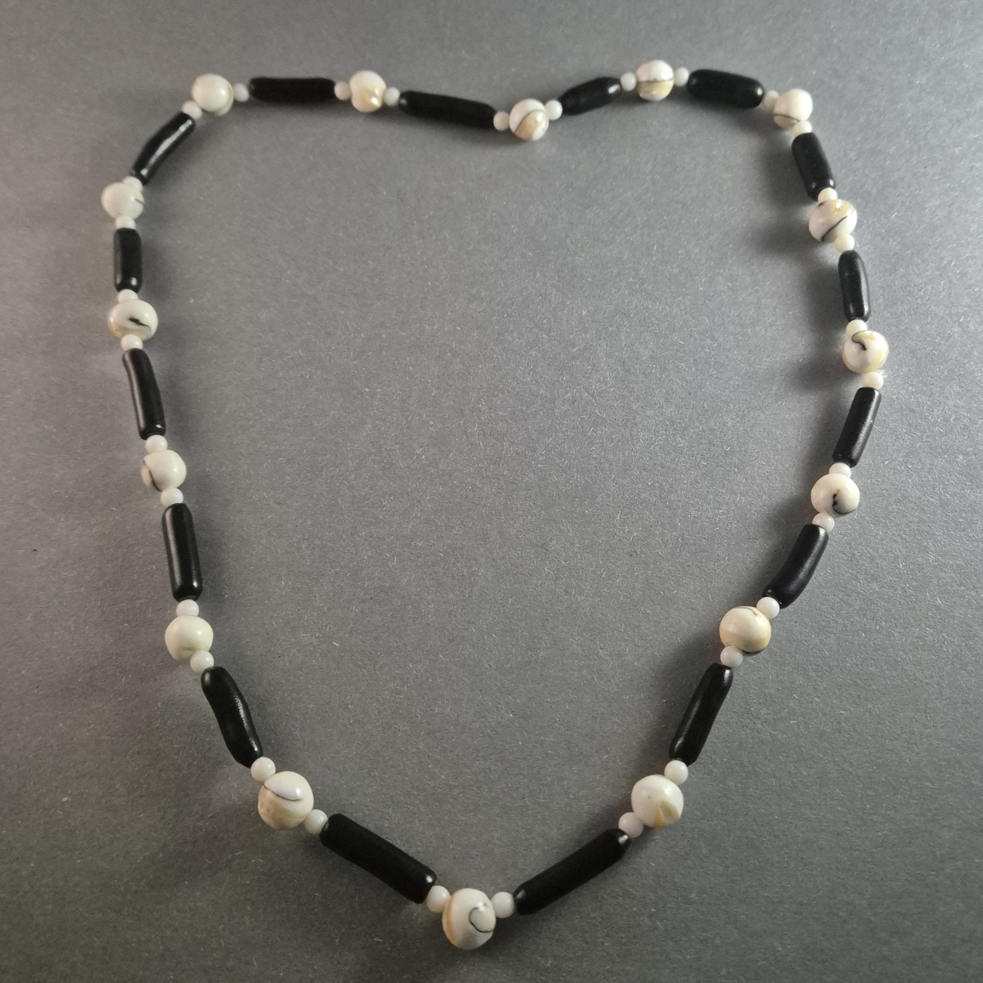 Diese einzigartige Vintage-Perlenkette kombiniert natürliche Muschelperlen mit dunklen Holzperlen zu einem harmonischen Design. Die kontrastreiche Kombination aus runden, cremefarbenen Muschelkugeln und länglichen schwarzen Holzperlen verleiht der Kette eine stilvolle, natürliche Ästhetik. Perfekt für Liebhaber maritimer oder ethnisch inspirierter Schmuckstücke.