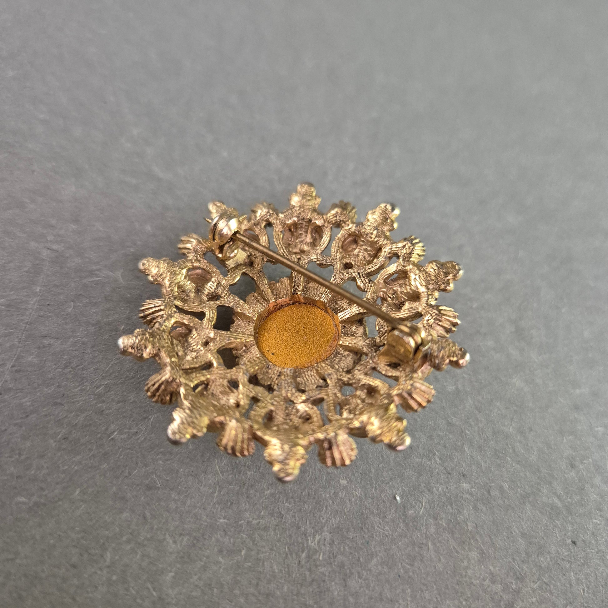 Diese prachtvolle Vintage-Brosche vereint barocke Opulenz mit zartem Schimmer: Ein großer milchig-opaleszierender Cabochon wird von kleineren runden Glascabochons umrahmt. Die reich verzierte, antikgoldene Metallfassung verleiht dem Stück einen Hauch von viktorianischem Flair. Ein ausdrucksstarkes Accessoire für Liebhaber nostalgischer Eleganz.