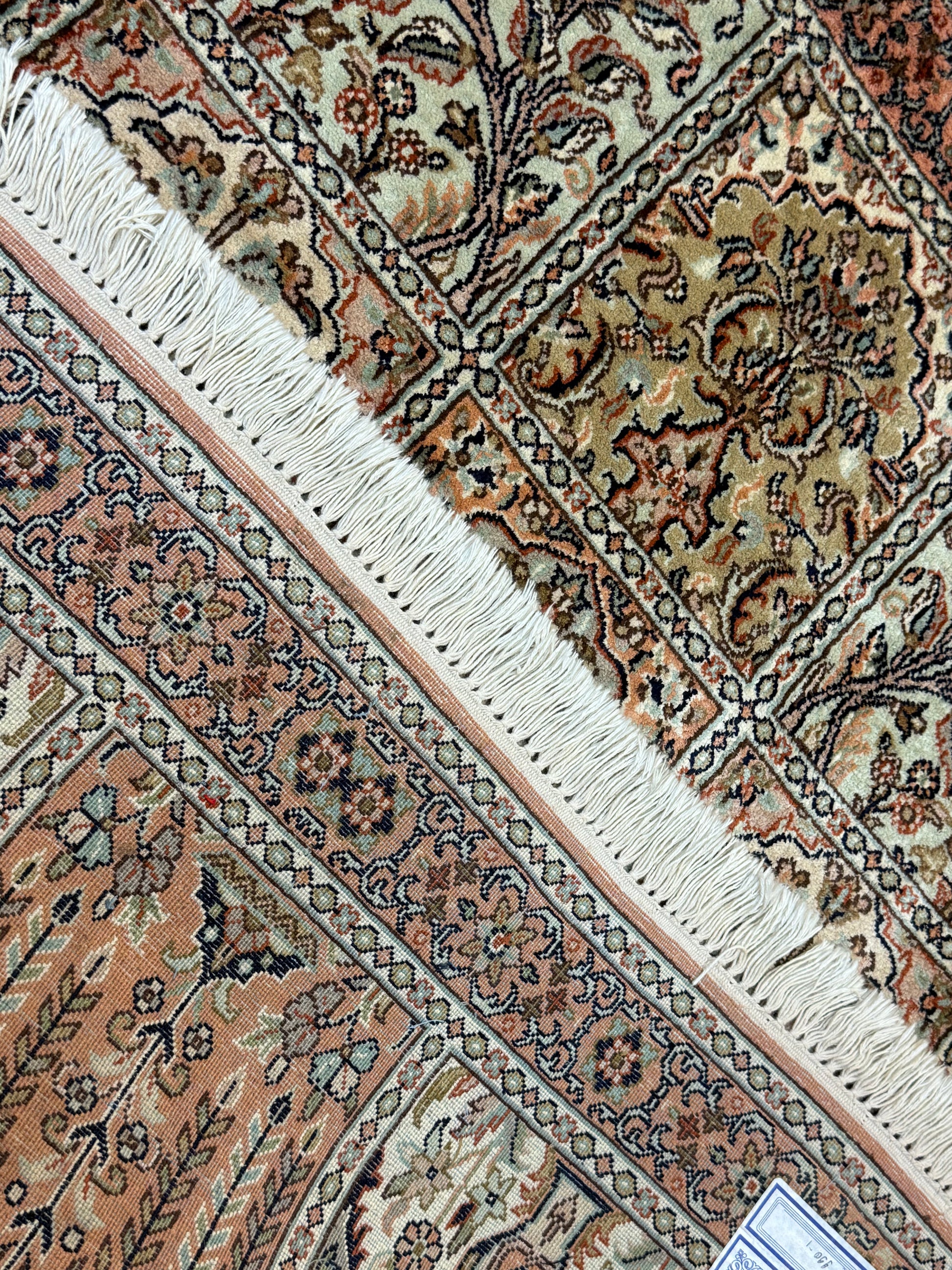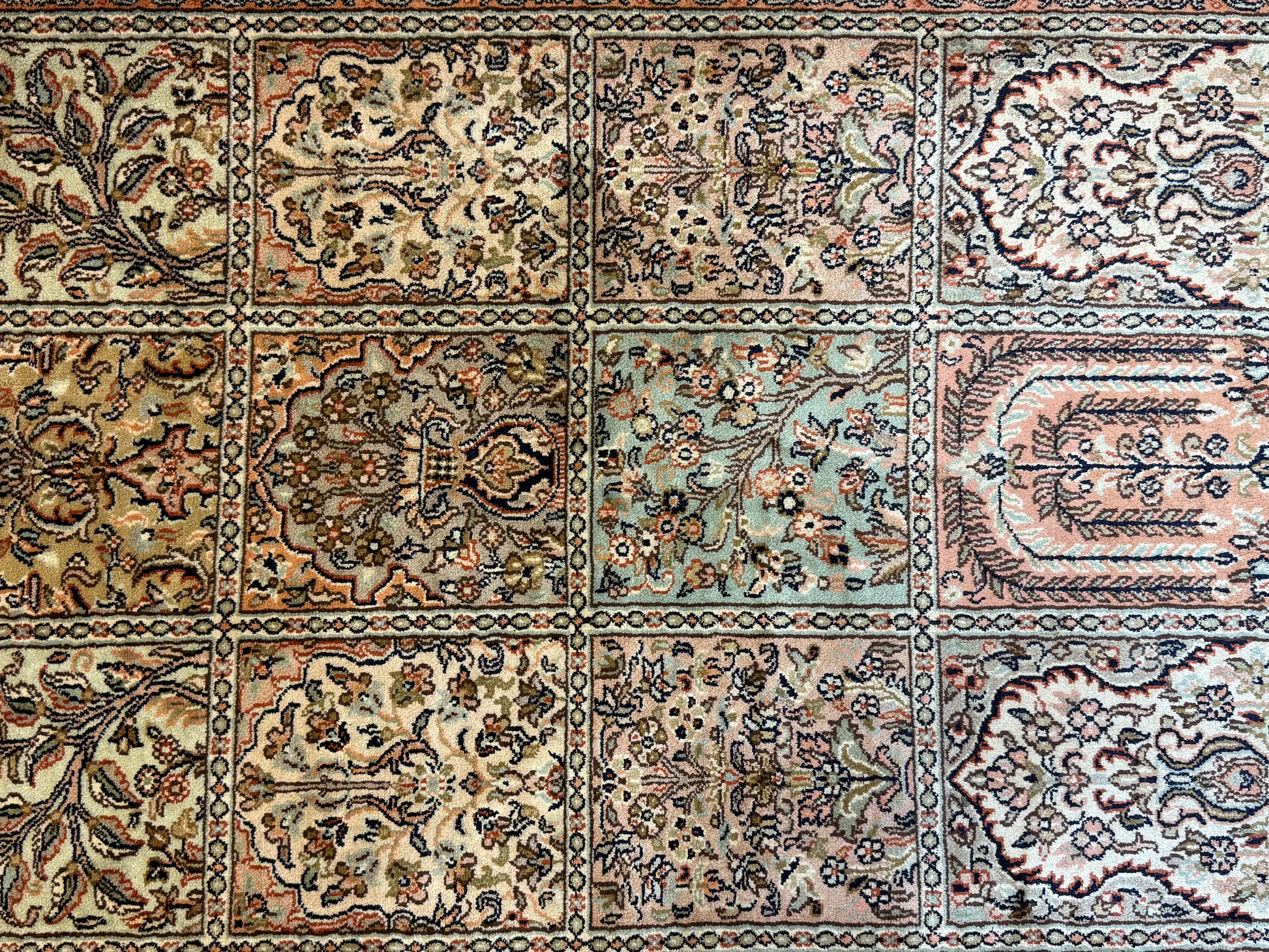 Ein kunstvoller und hochwertiger Orientteppich mit klassischem Feldermotiv, handgeknüpft aus feinster Naturseide. Dieses edle Stück stammt aus der Region Kaschmir, die für ihre meisterhafte Knüpftradition und detailreichen Muster weltbekannt ist.