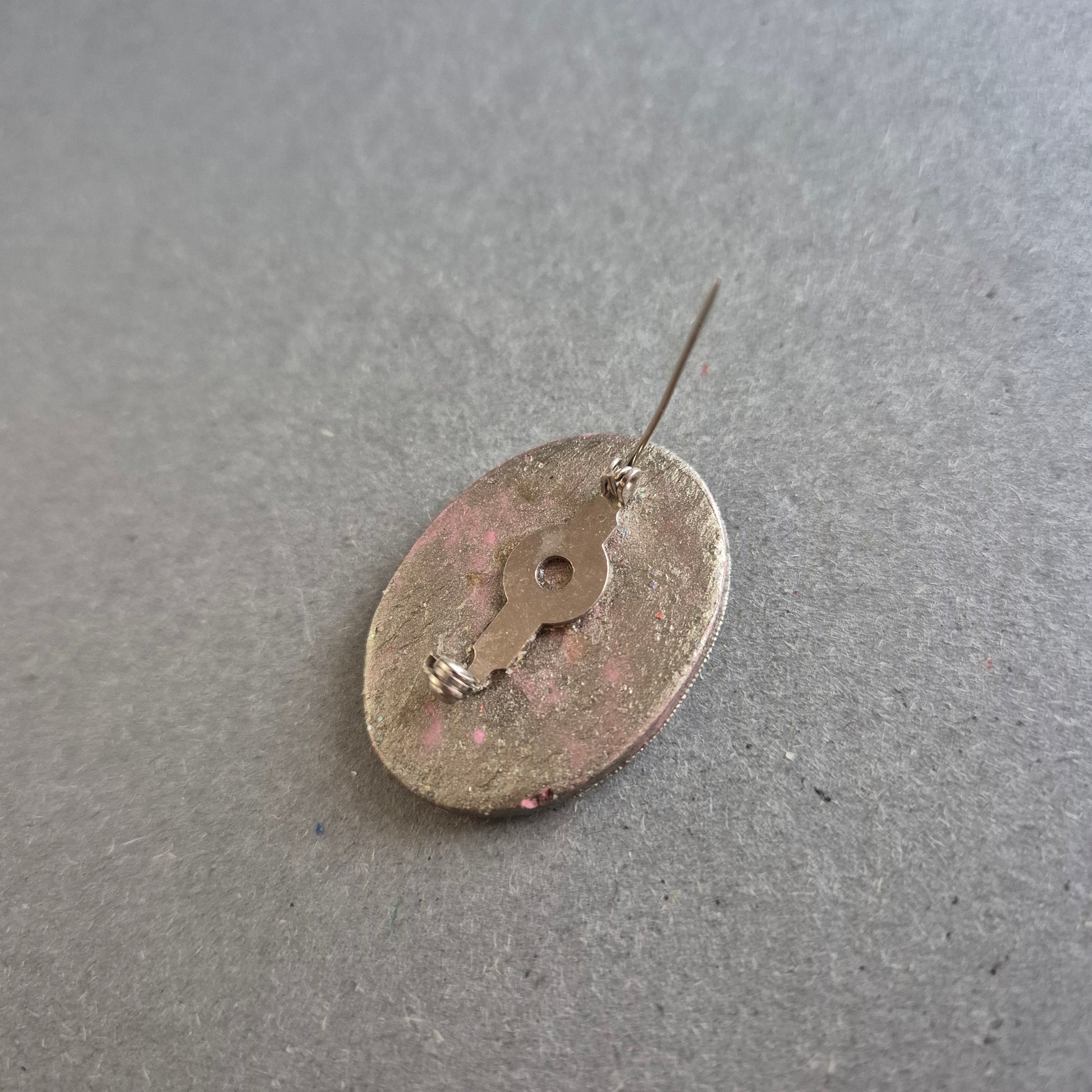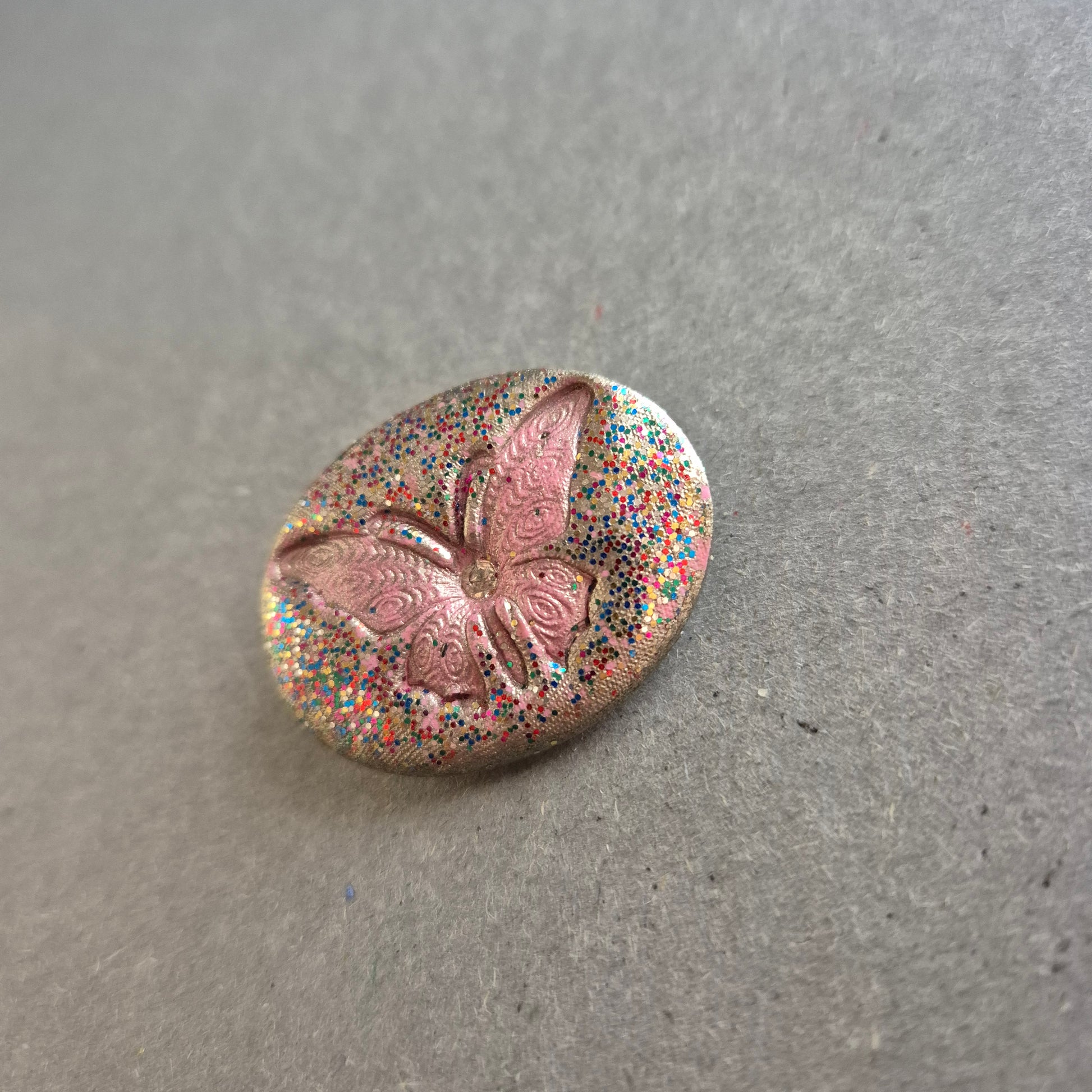 Diese auffällige Vintage-Brosche setzt ein farbenfrohes Statement: Ein rosa Schmetterling ziert das Zentrum des ovalen Motivs, eingebettet in eine glitzernde Oberfläche mit bunten Partikeln. Das verspielte Design ist ideal für individuelle Looks, nostalgische Outfits oder als funkelndes Highlight an Jacke, Bluse oder Hut.