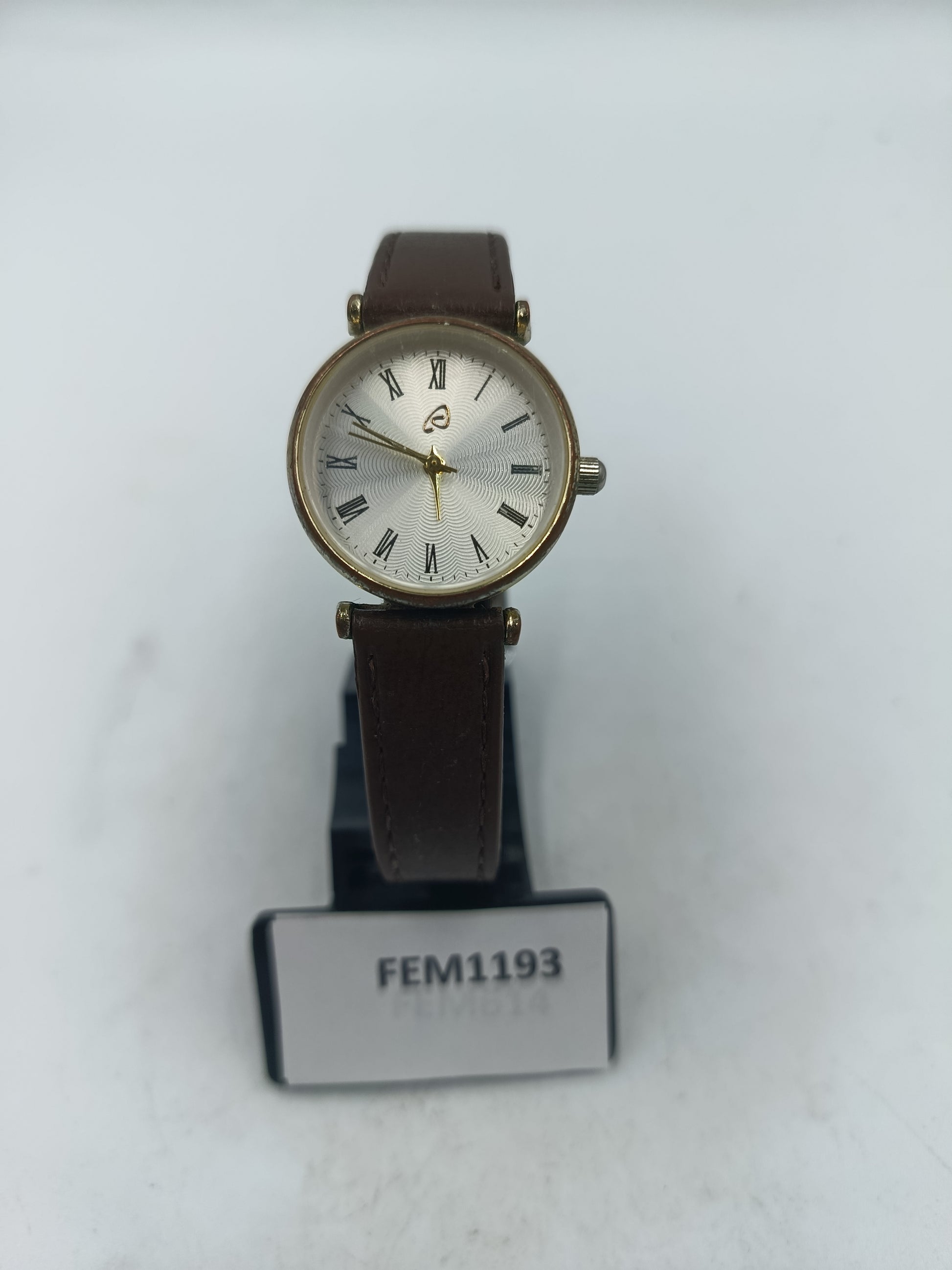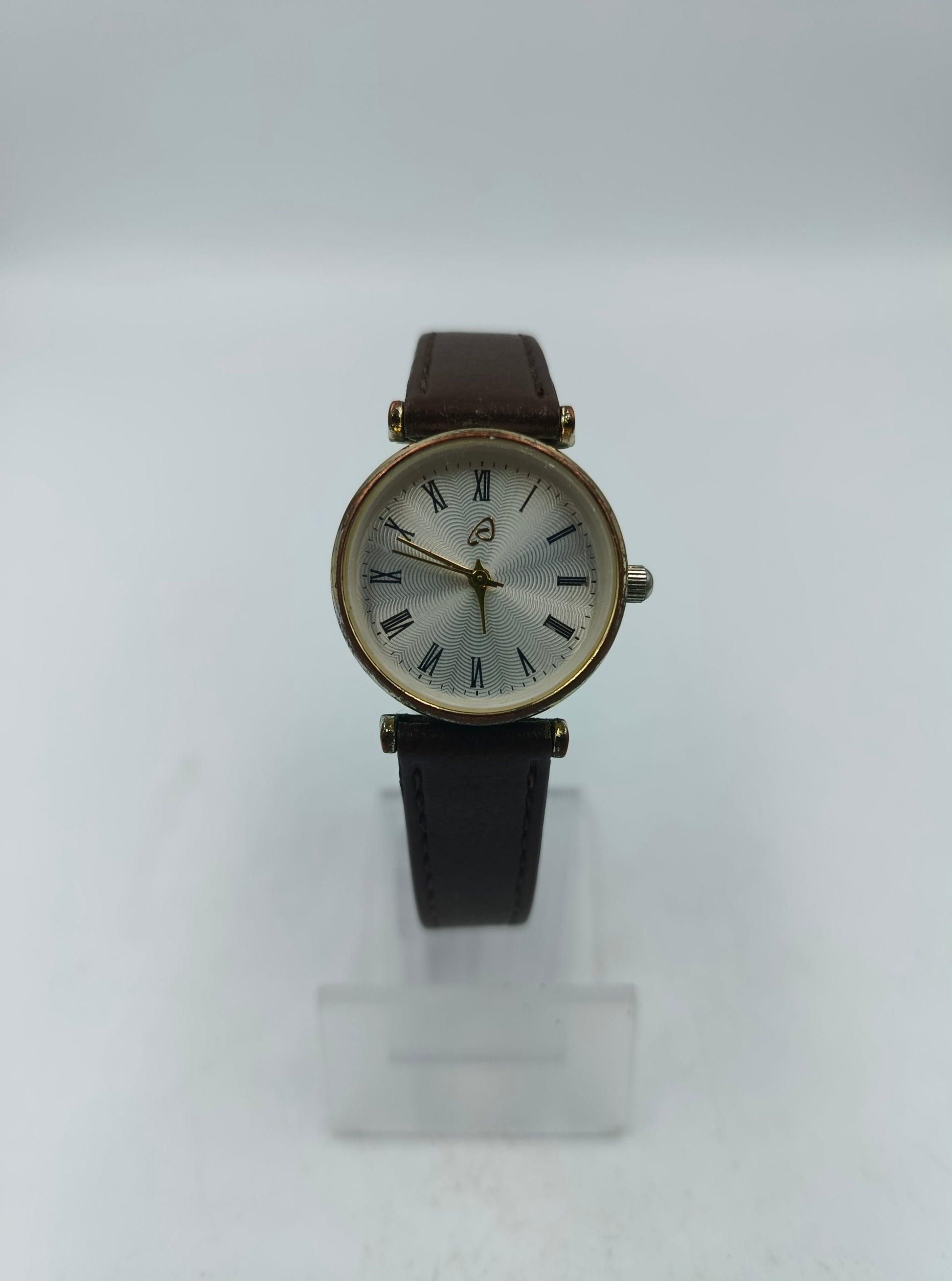 • Material: Metallgehäuse (goldfarben), Kunst- oder Echtlederarmband (braun)