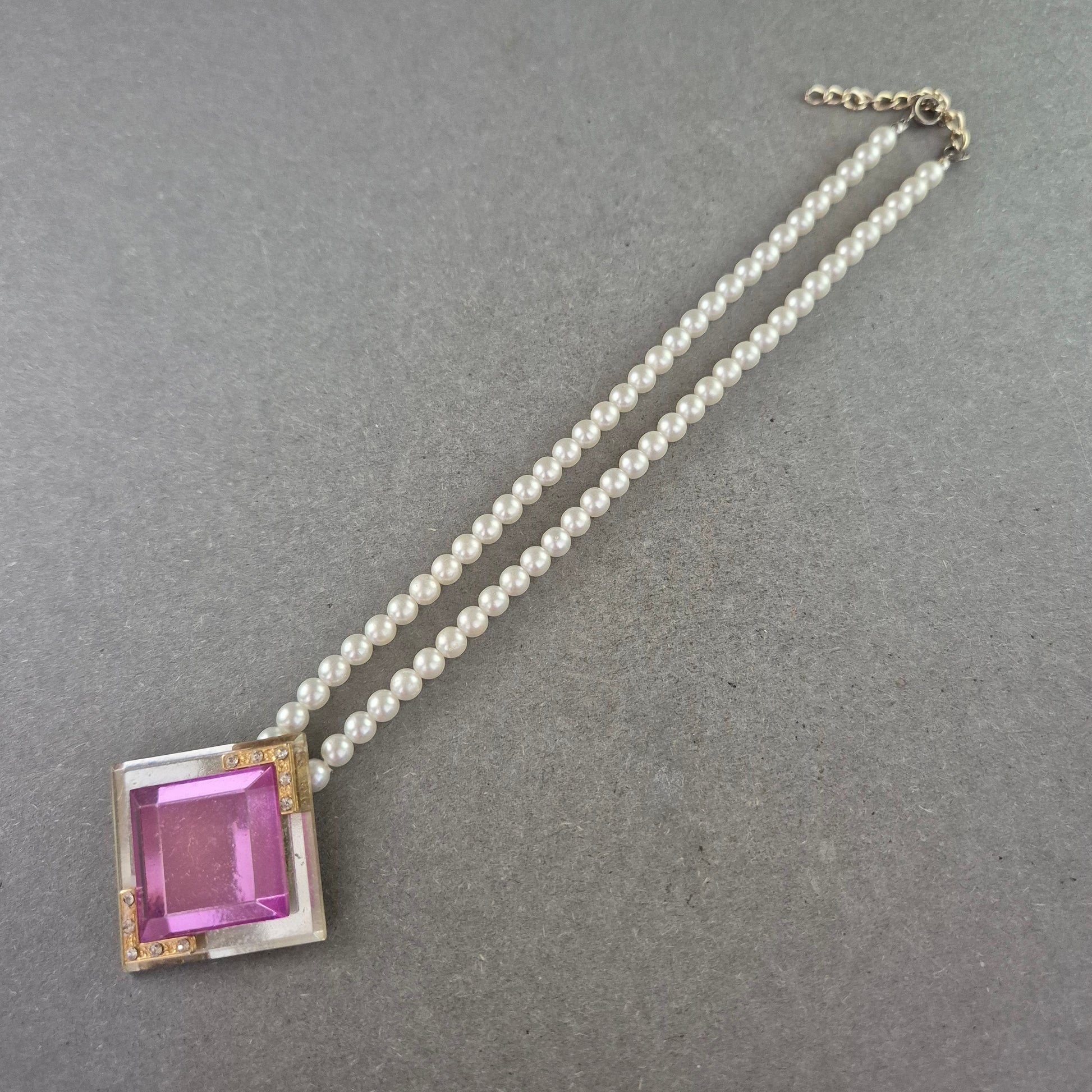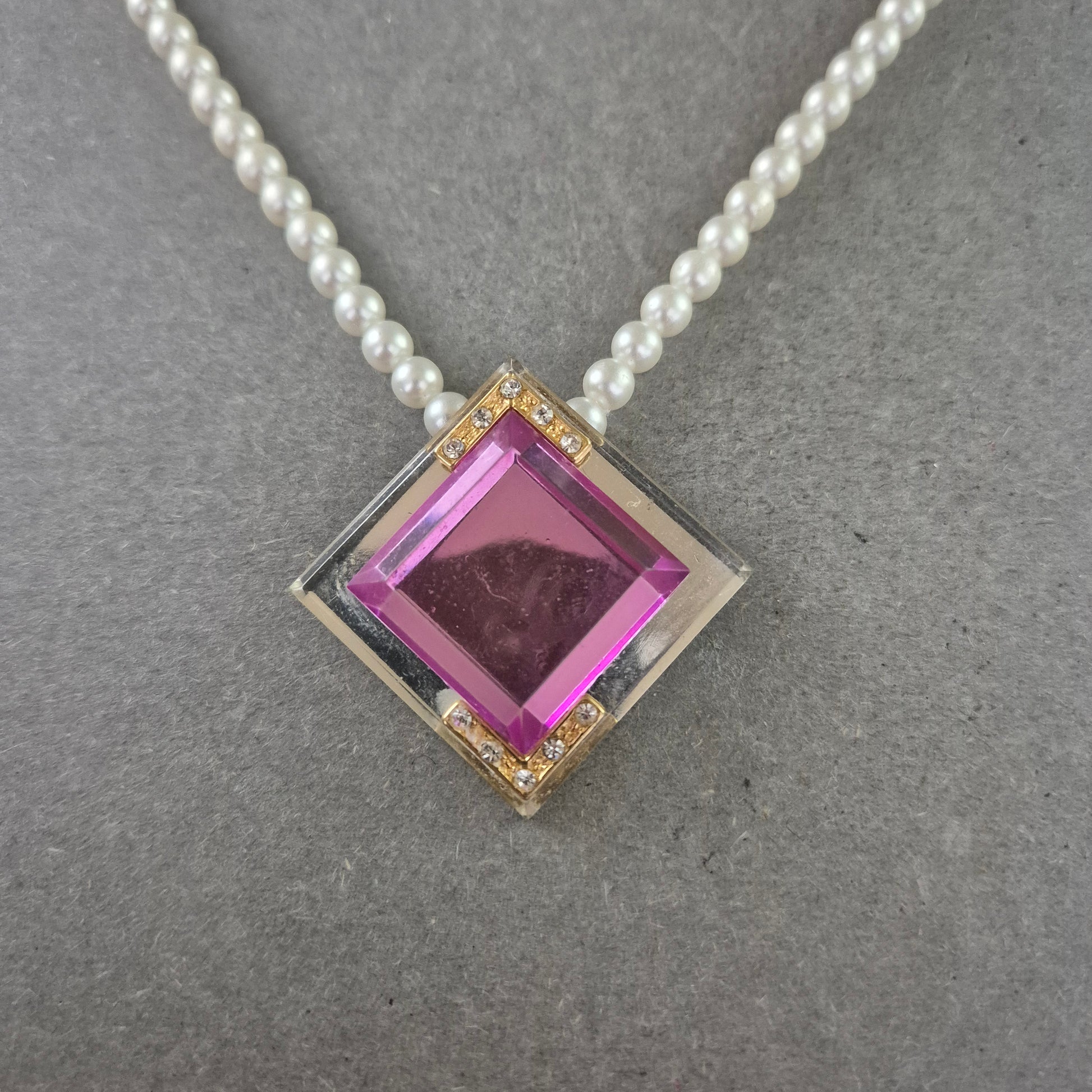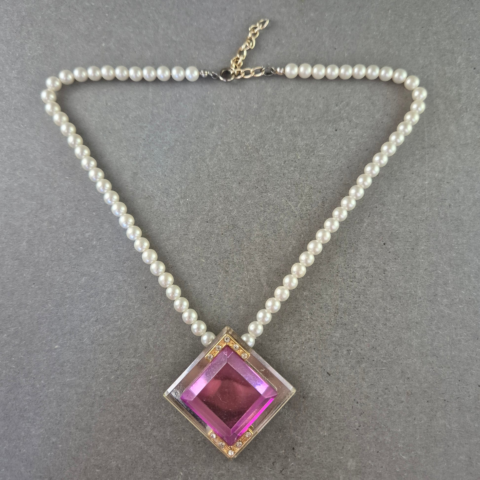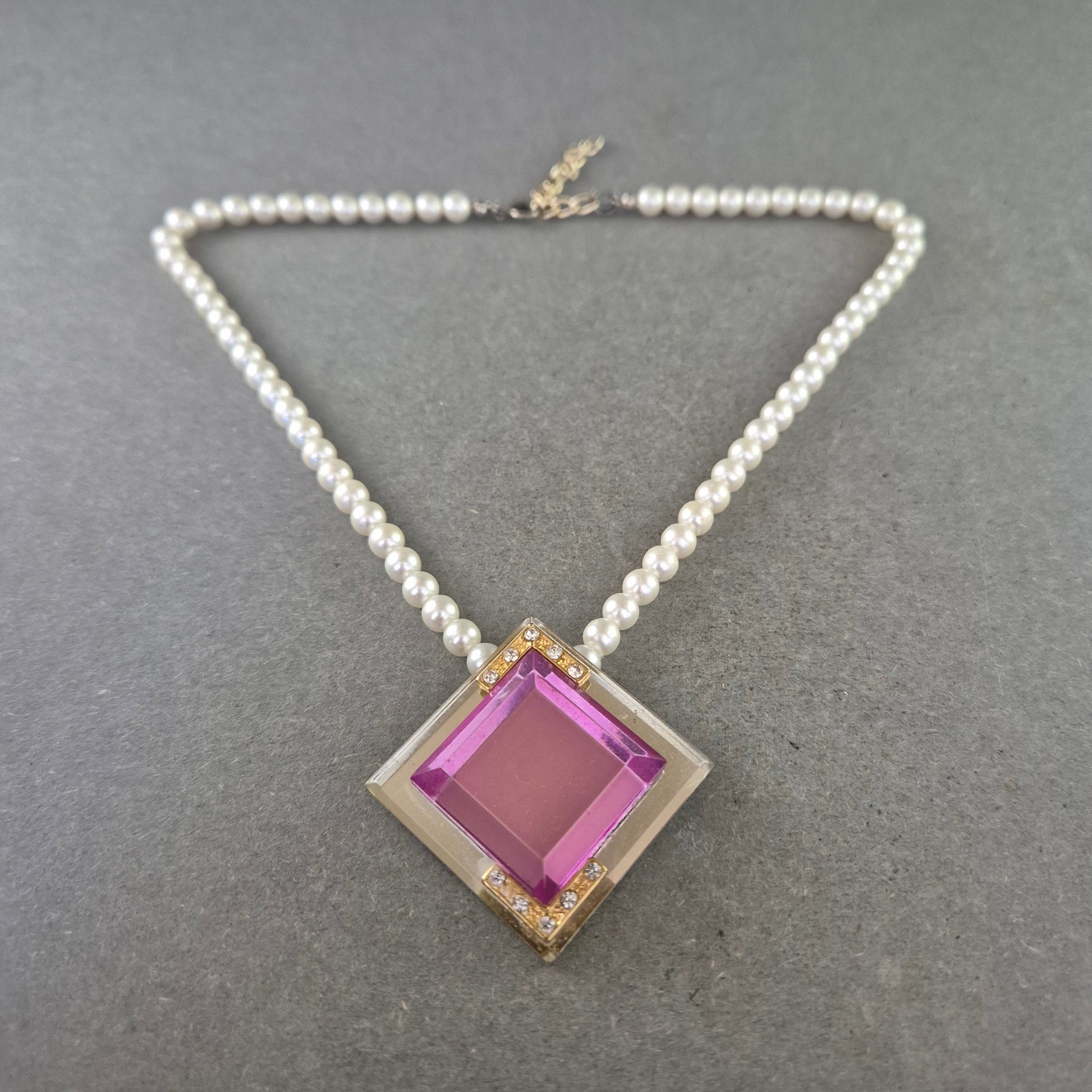 Diese stilvolle Halskette vereint klassische Eleganz mit einem modernen Touch. Die feinen Kunstperlen verleihen dem Schmuckstück einen zeitlosen Look, während der große quadratische Anhänger mit pinkem Glasstein in geometrischer Fassung ein echtes Statement setzt. Goldfarbene Details mit kleinen Ziersteinen sorgen für zusätzlichen Glanz. Ideal für besondere Anlässe oder als auffälliger Akzent im Alltag.