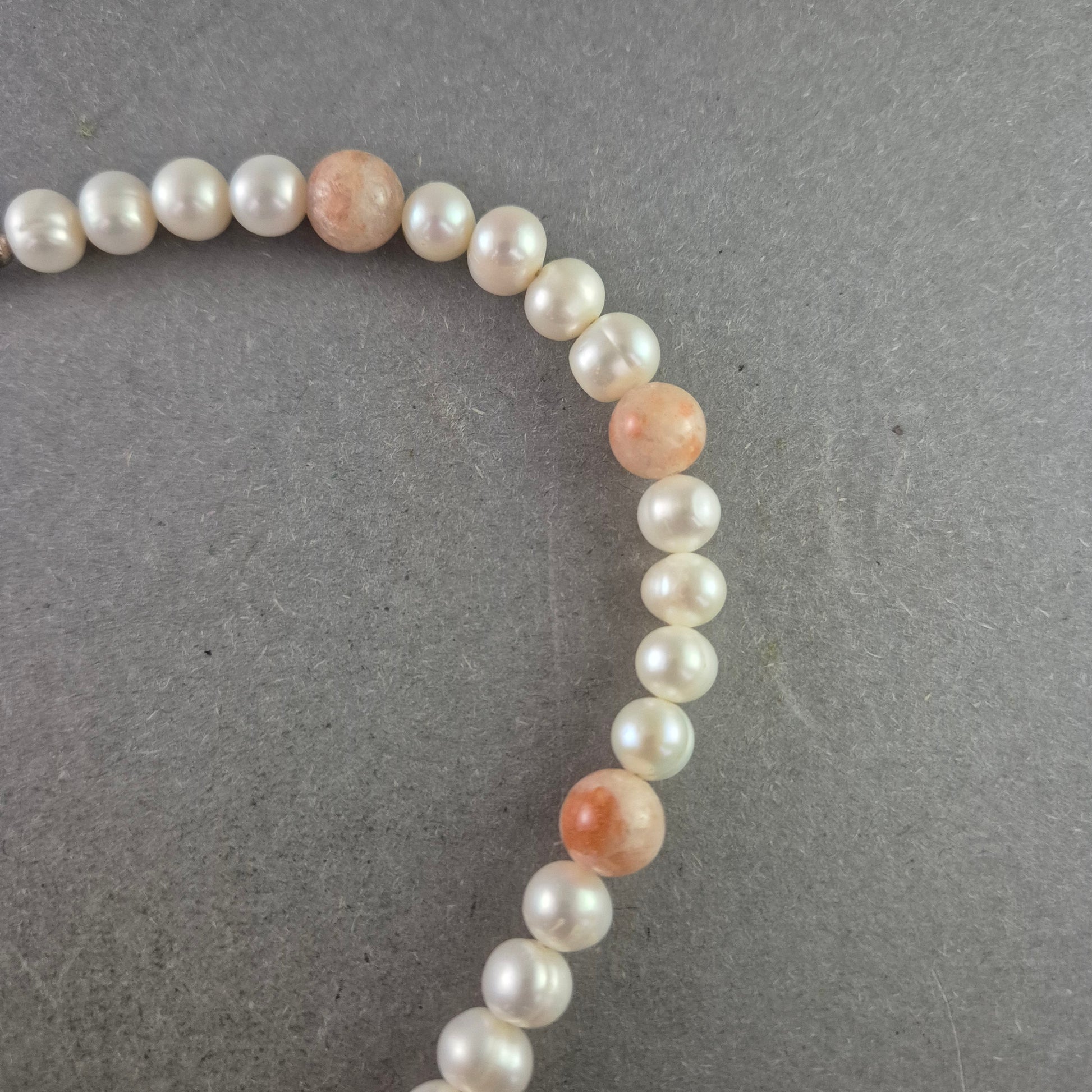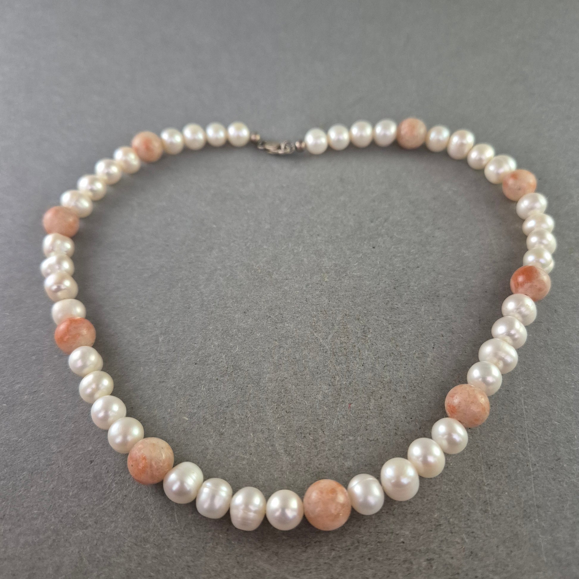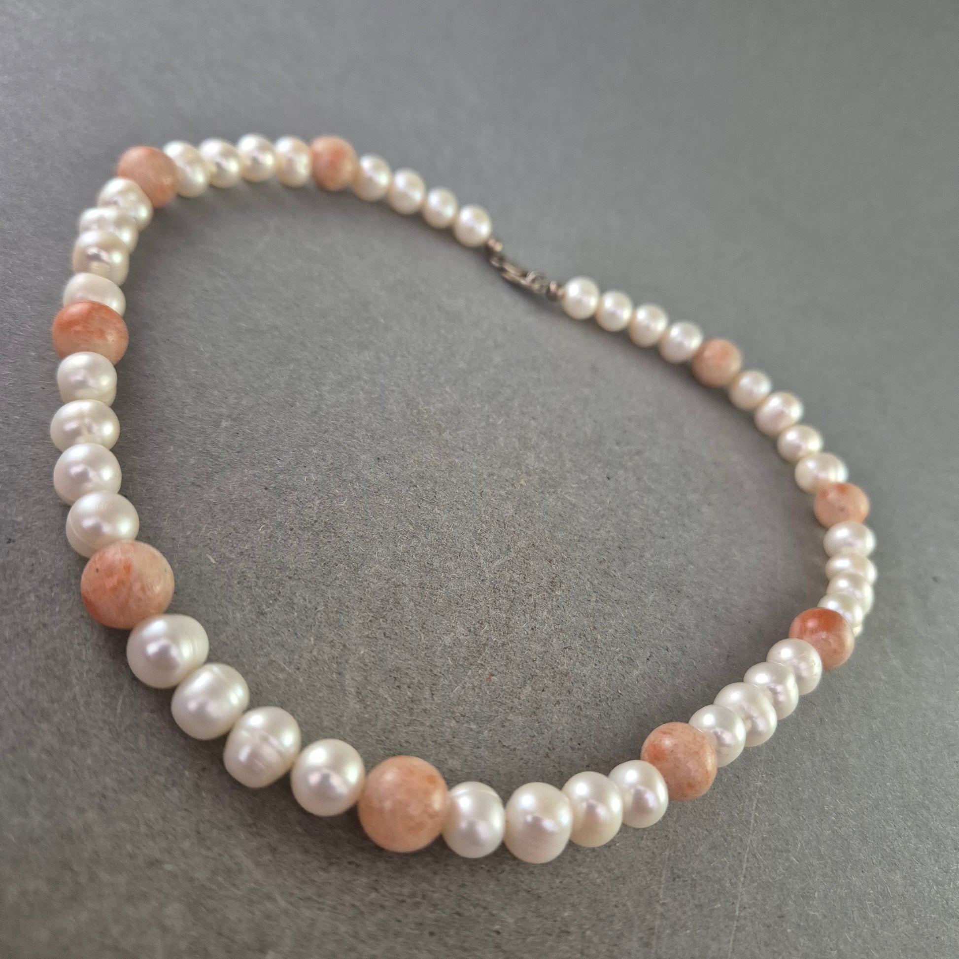 Diese elegante Halskette kombiniert klassische weiße Perlen mit warmen Sonnenstein-Kugeln in zartem Orange. Die harmonische Farbzusammenstellung verleiht dem Schmuckstück einen femininen und natürlichen Look. Der dezente Karabinerverschluss sorgt für sicheren Halt und rundet das edle Design ab – perfekt für festliche Anlässe oder stilvolle Alltagsoutfits.