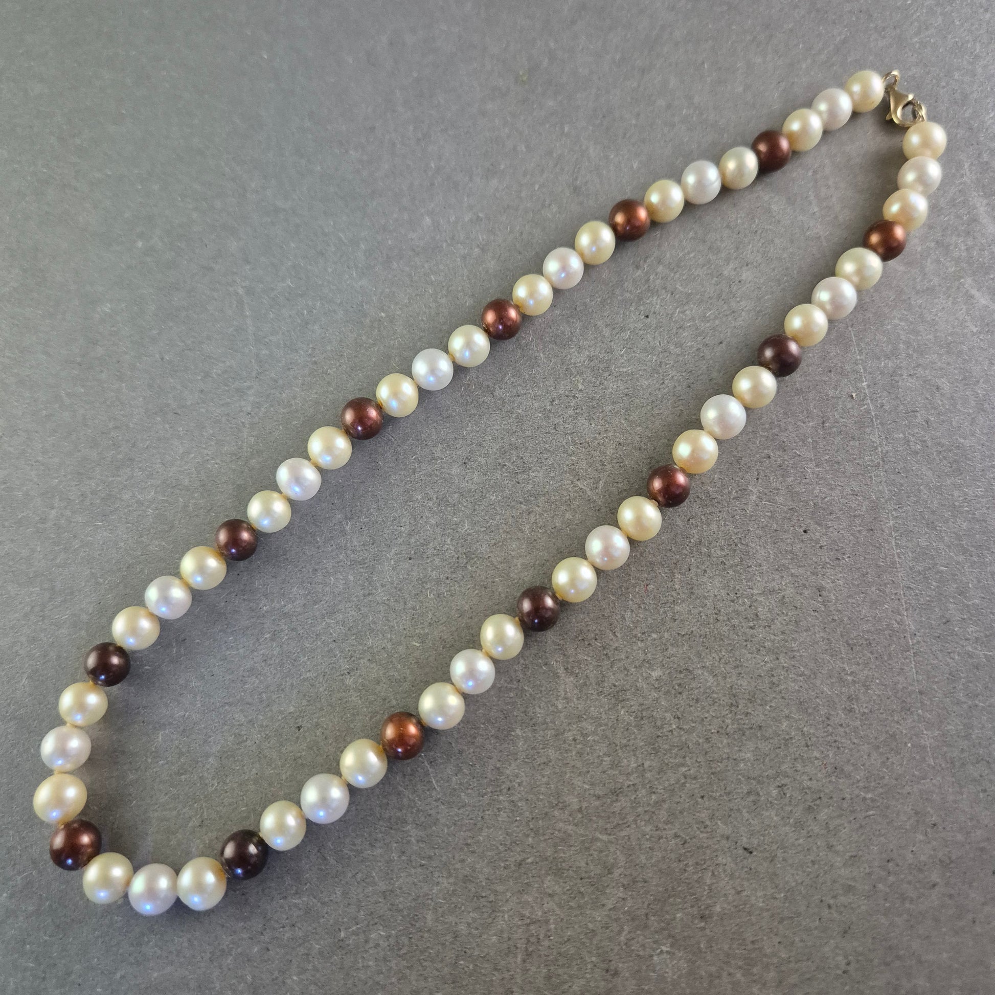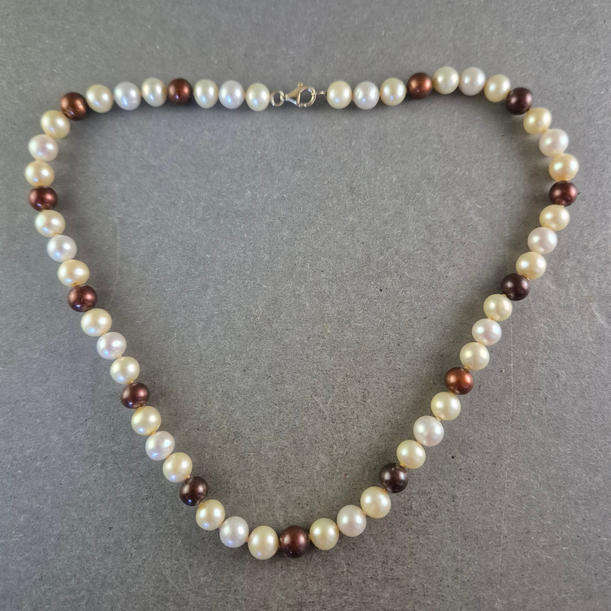 Diese elegante Perlenkette verbindet klassische weiße Zuchtperlen mit braunen Perlen, die dem Schmuckstück einen stilvollen Kontrast verleihen. Das harmonische Farbspiel sorgt für eine edle Ausstrahlung, die sowohl zu festlichen Anlässen als auch im Alltag getragen werden kann. Der Karabinerverschluss sorgt für sicheren Halt und rundet das Design ab.