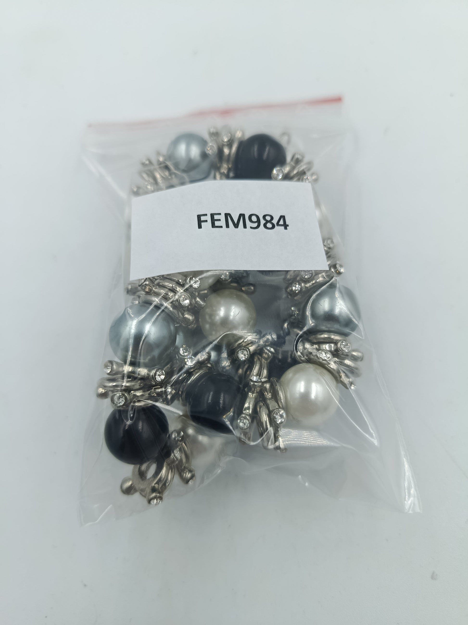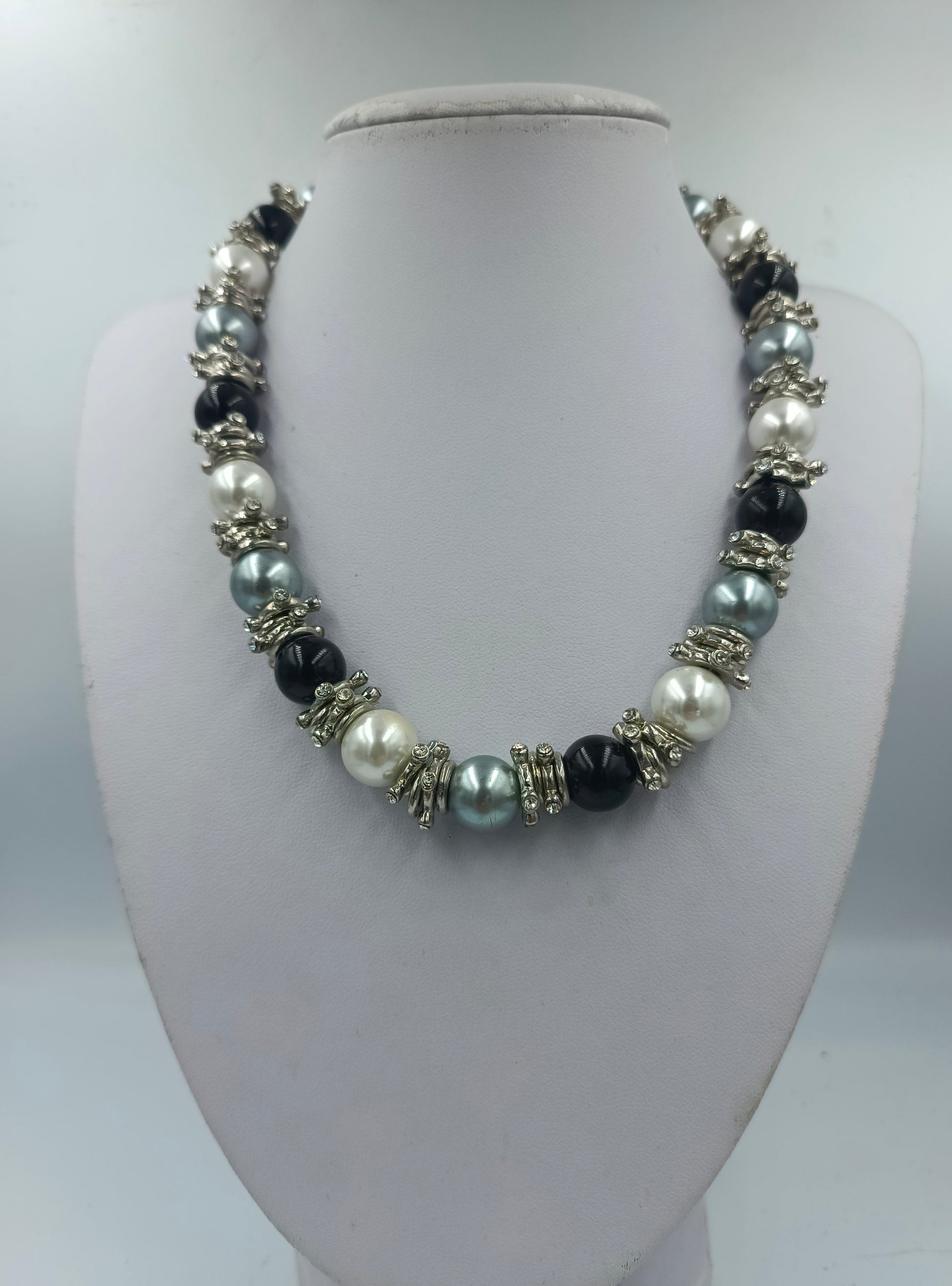 Wunderschöne Perlenkette in Schwarz, Grau und Weiß, verziert mit funkelnden Strass-Elementen in silberner Fassung. Die abwechslungsreiche Farbgebung kombiniert mit glänzenden Zierelementen sorgt für einen eleganten und luxuriösen Look – perfekt für Abendgarderobe oder festliche Anlässe.