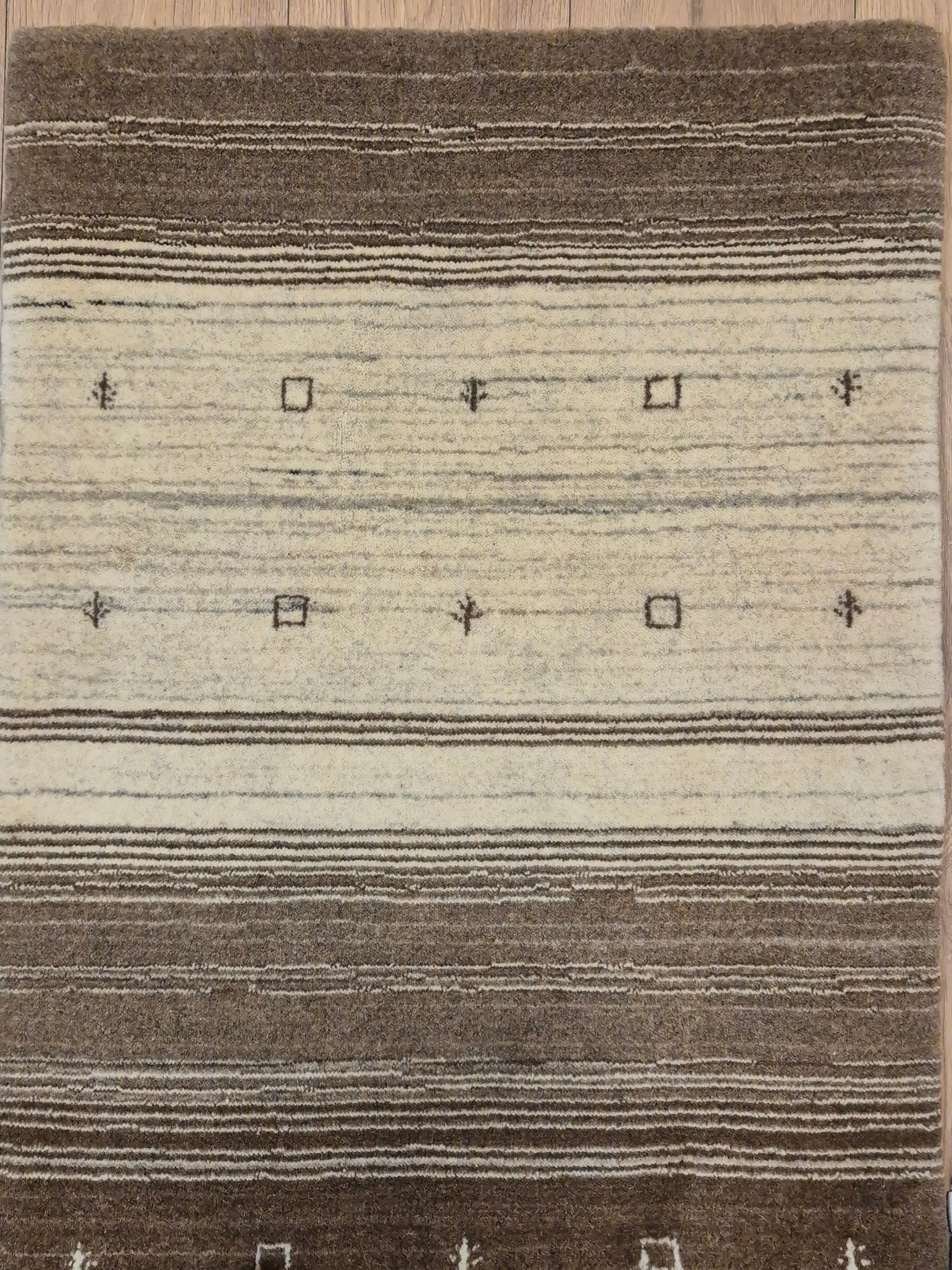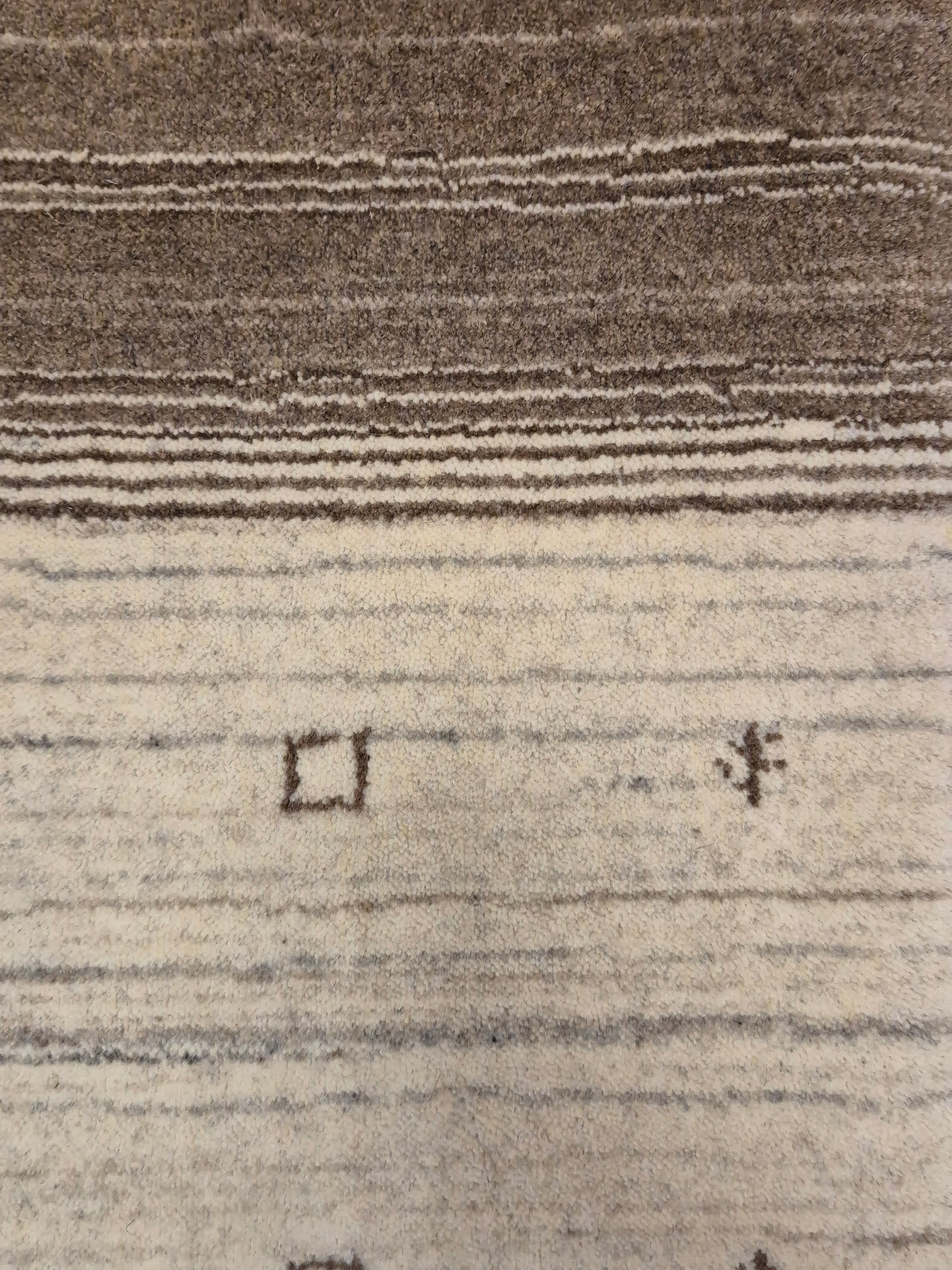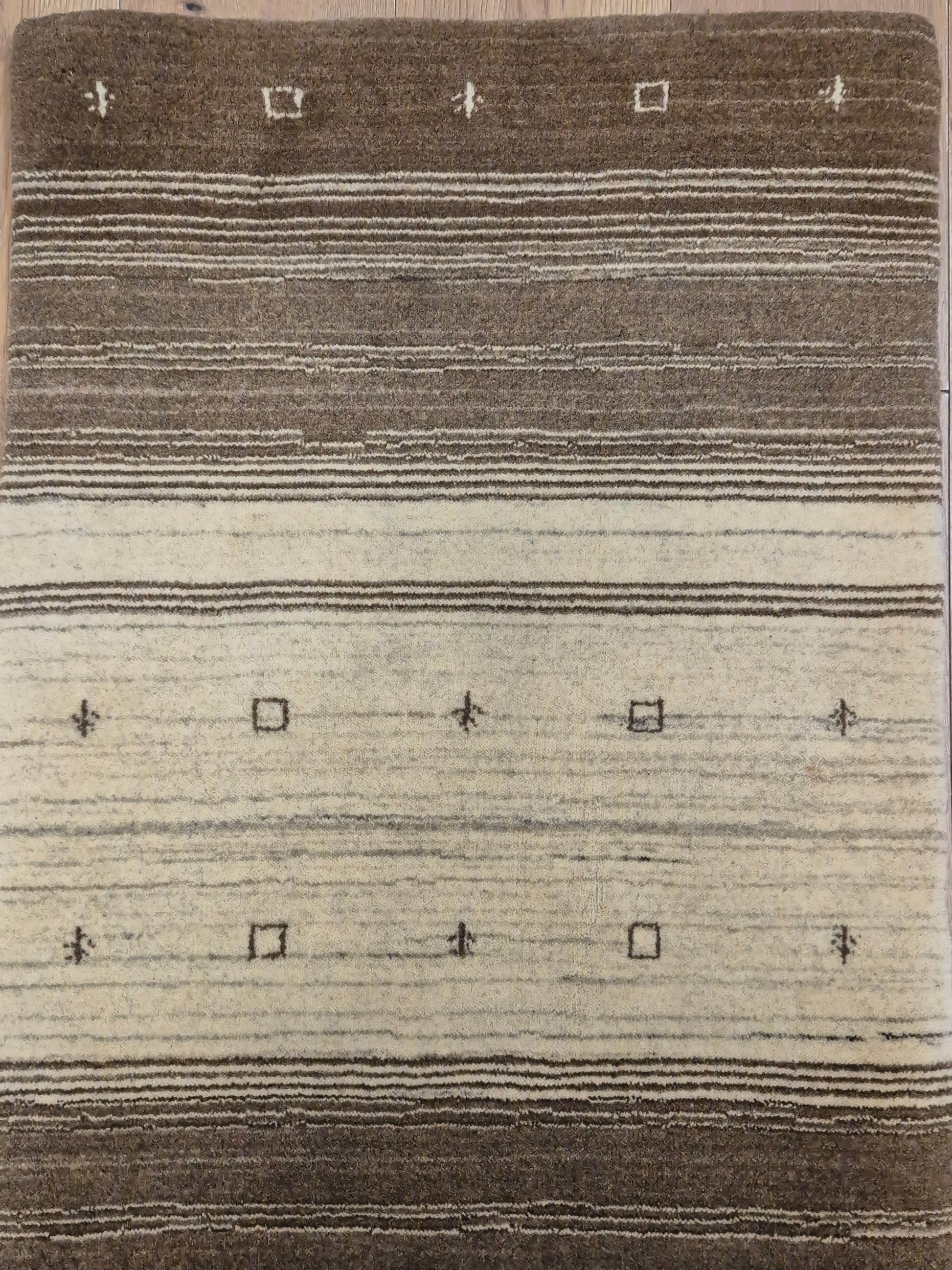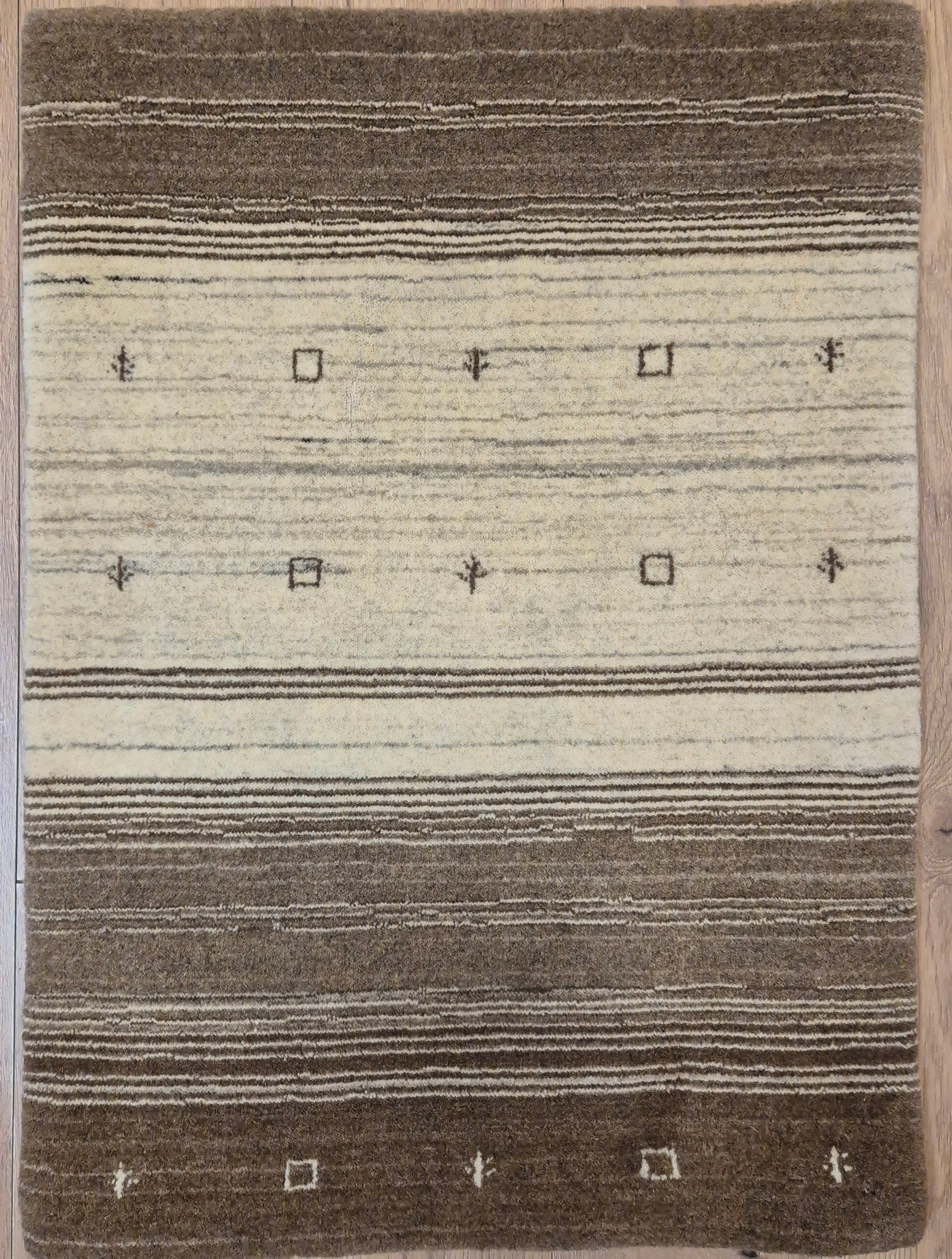 angeboten wird ein handgeknüpfter Perser Gabbeh Teppich aus reiner Schurwolle. Dieser Teppich besticht durch sein naturbelassenes Streifenmuster in warmen Brauntönen, kombiniert mit einer hellen Mittelpartie. Dezente geometrische Symbole und kleine abstrahierte Motive lockern die schlichte Gestaltung auf und verleihen dem Stück einen unverwechselbaren Charakter.