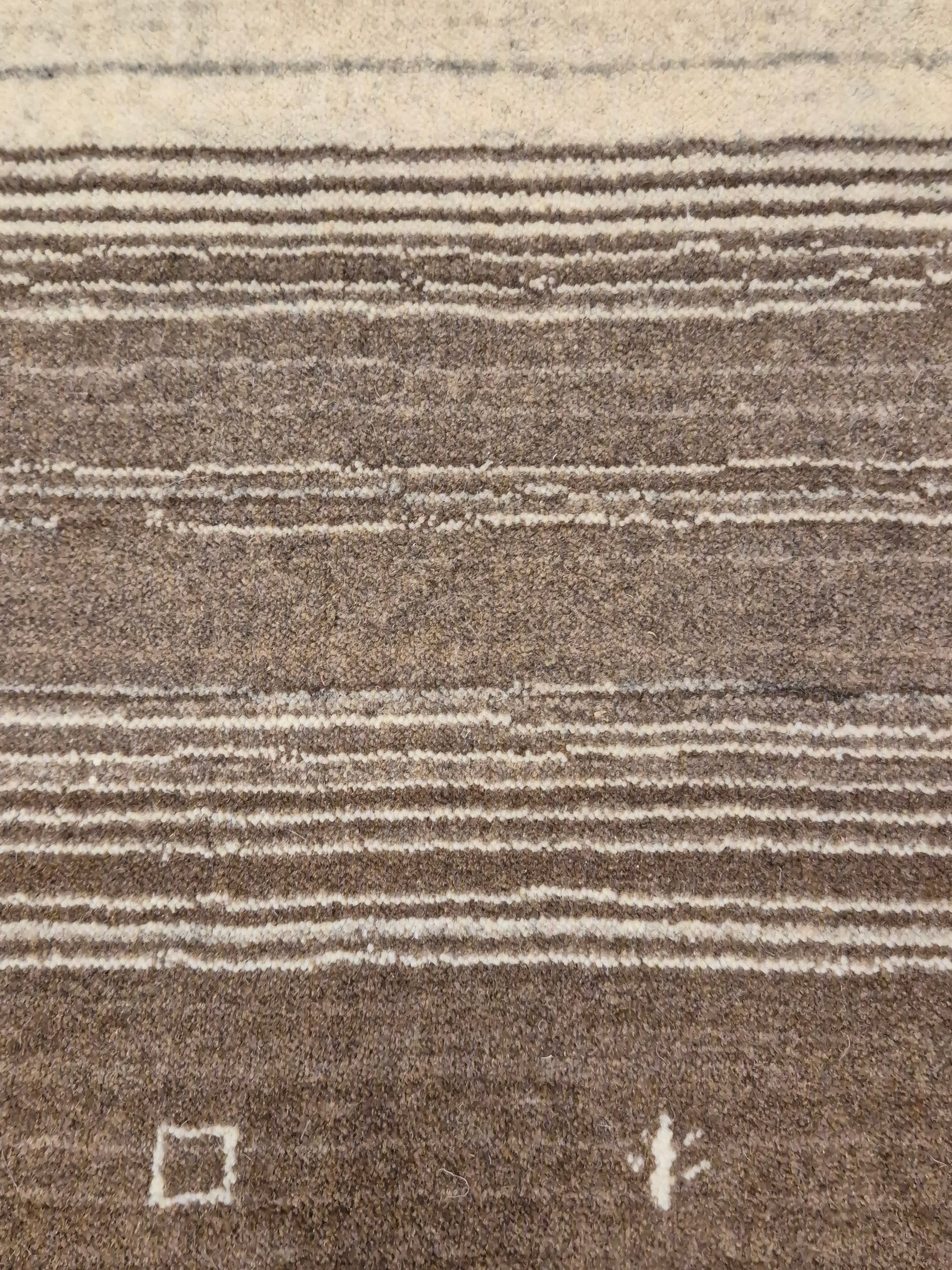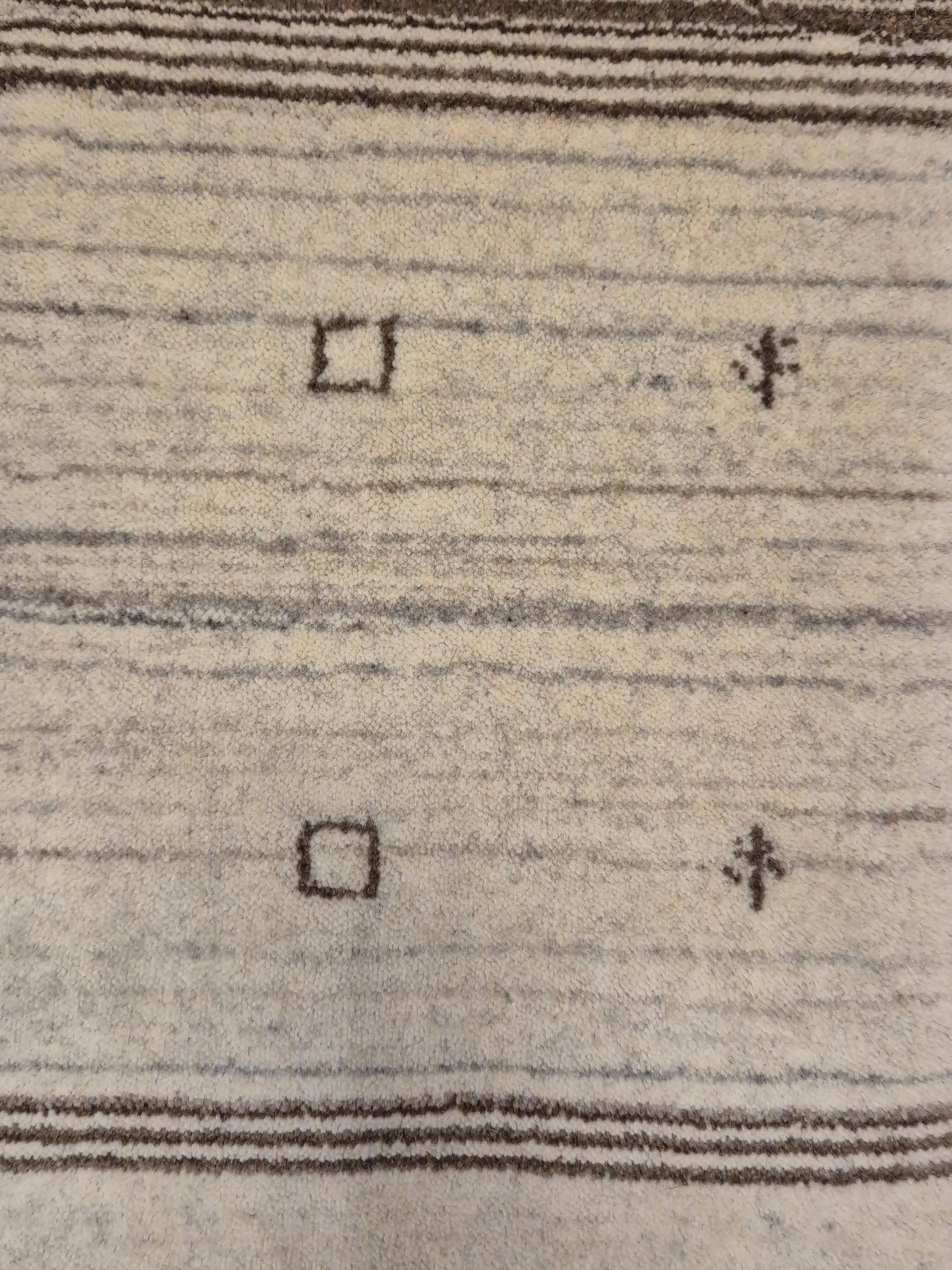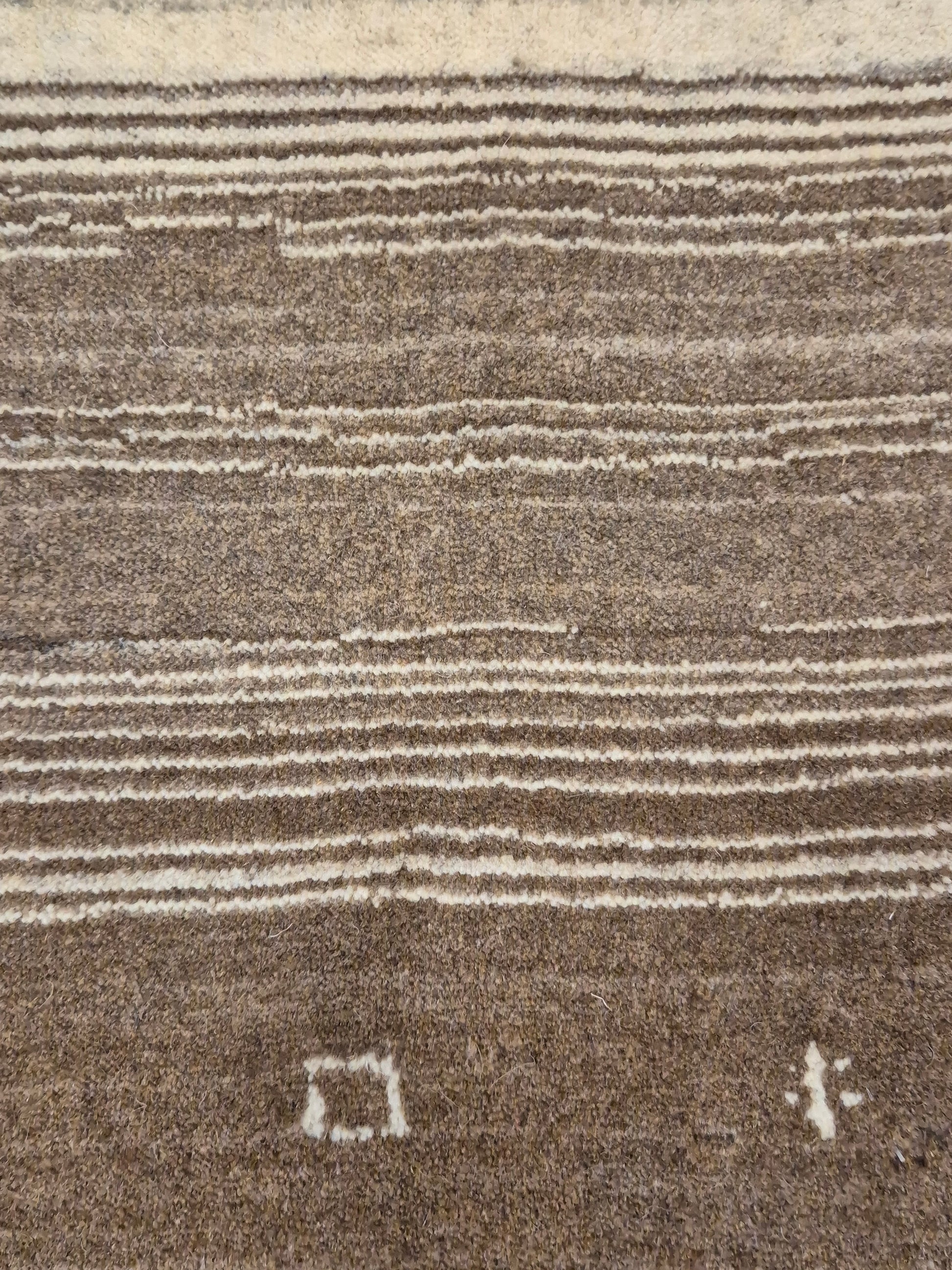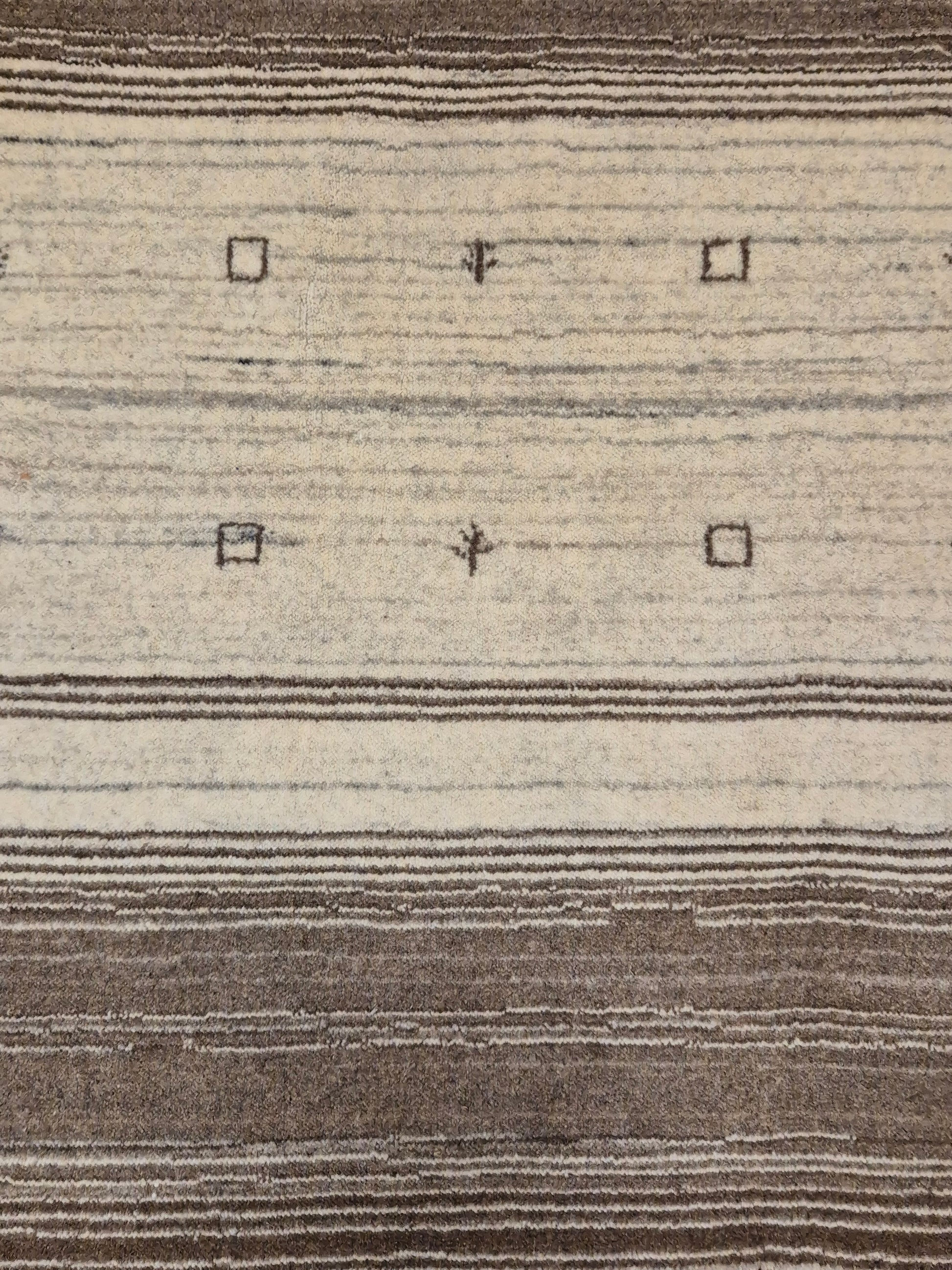 angeboten wird ein handgeknüpfter Perser Gabbeh Teppich aus reiner Schurwolle. Dieser Teppich besticht durch sein naturbelassenes Streifenmuster in warmen Brauntönen, kombiniert mit einer hellen Mittelpartie. Dezente geometrische Symbole und kleine abstrahierte Motive lockern die schlichte Gestaltung auf und verleihen dem Stück einen unverwechselbaren Charakter.