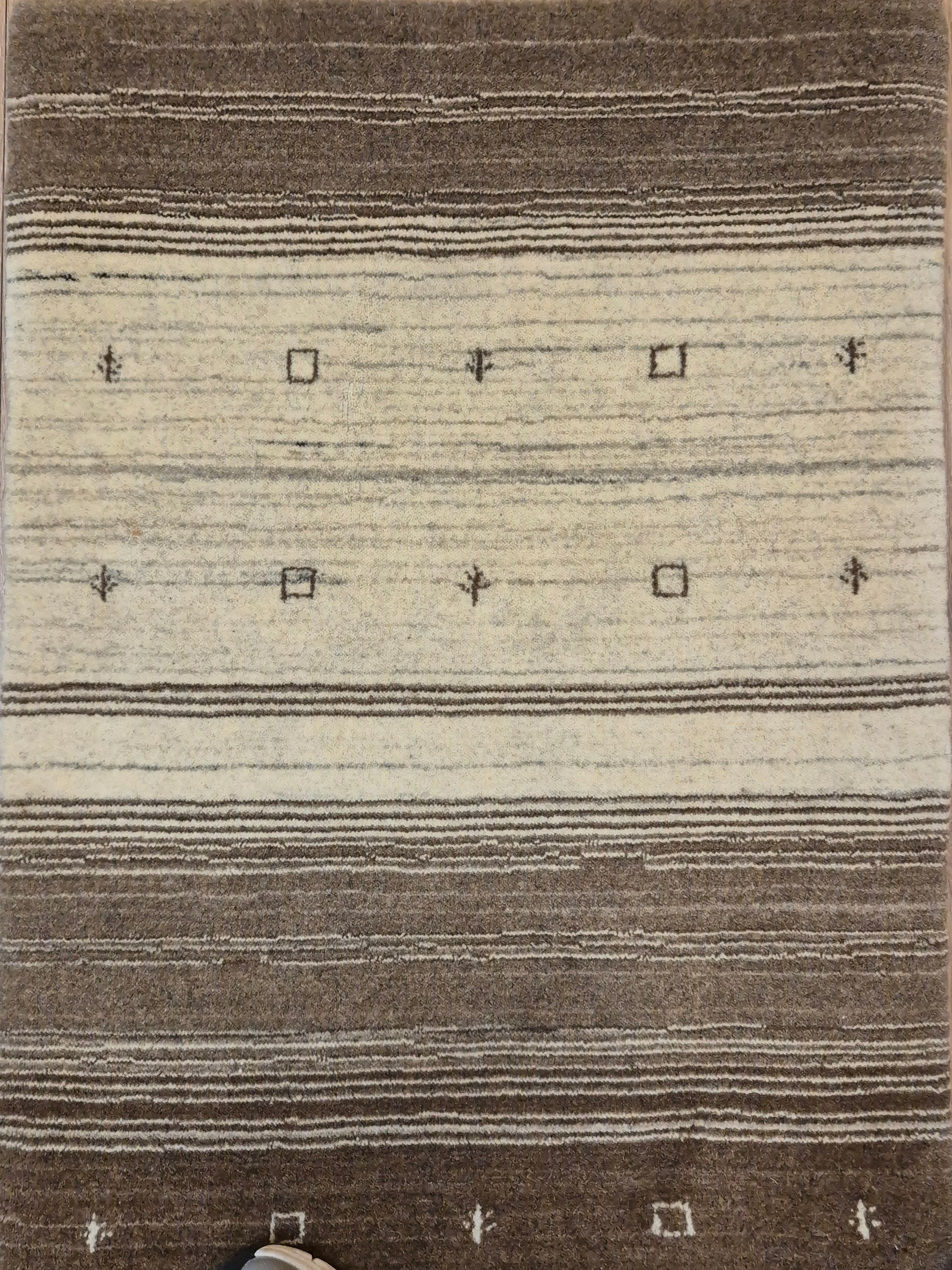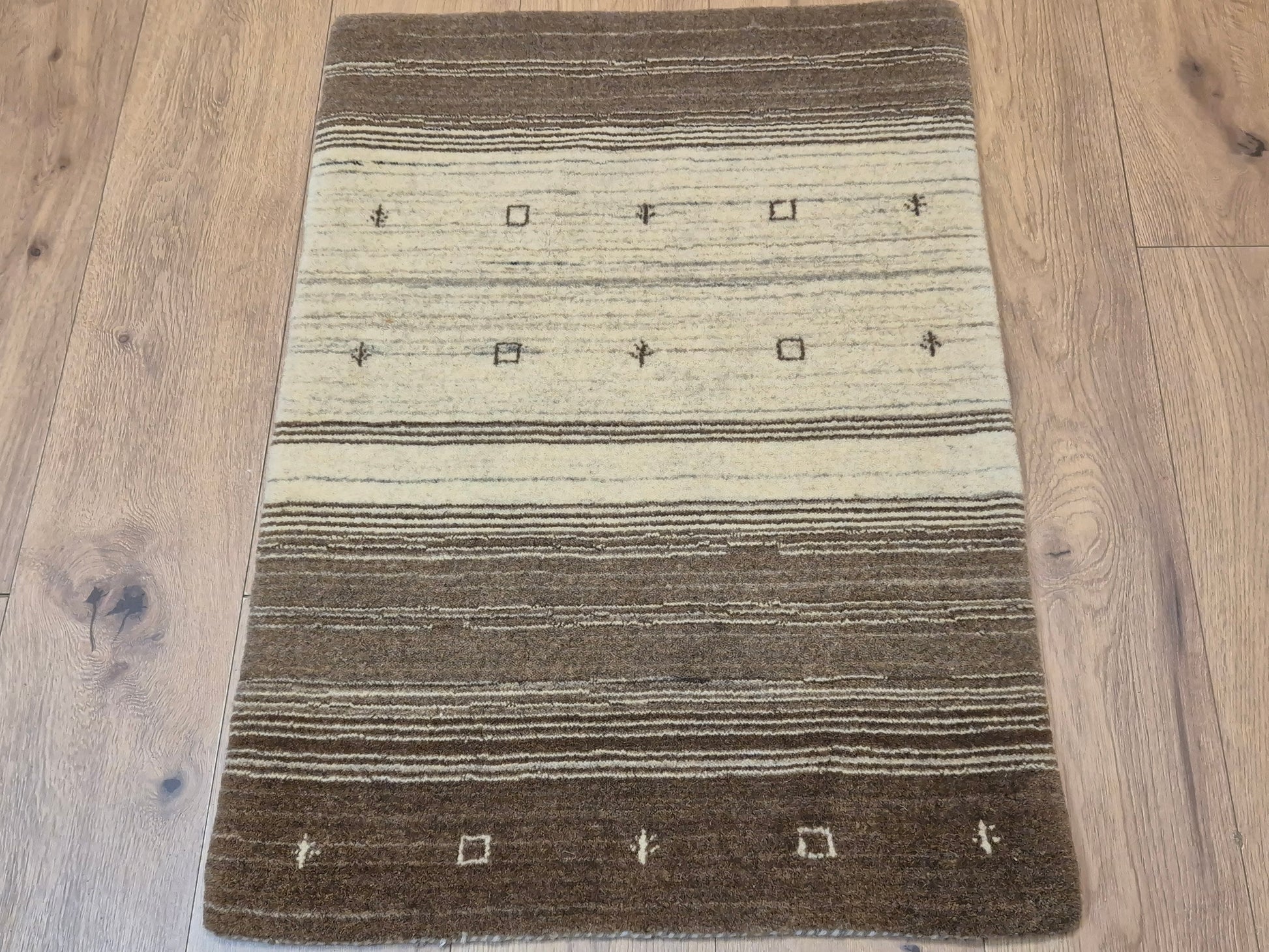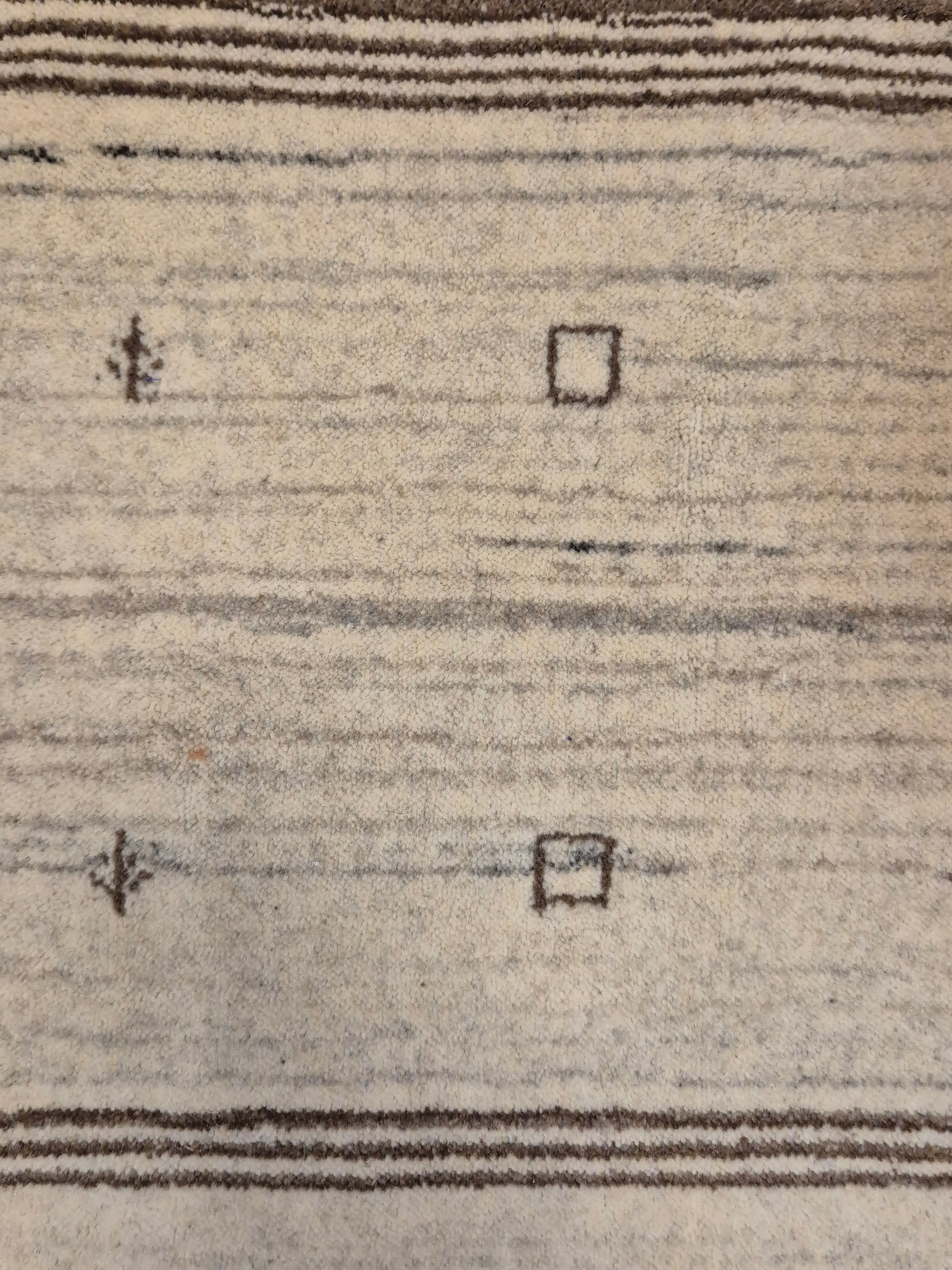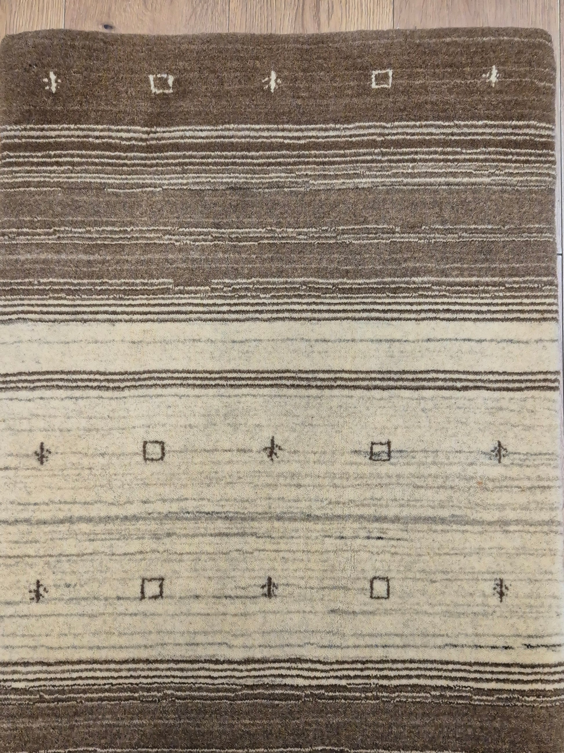 angeboten wird ein handgeknüpfter Perser Gabbeh Teppich aus reiner Schurwolle. Dieser Teppich besticht durch sein naturbelassenes Streifenmuster in warmen Brauntönen, kombiniert mit einer hellen Mittelpartie. Dezente geometrische Symbole und kleine abstrahierte Motive lockern die schlichte Gestaltung auf und verleihen dem Stück einen unverwechselbaren Charakter.