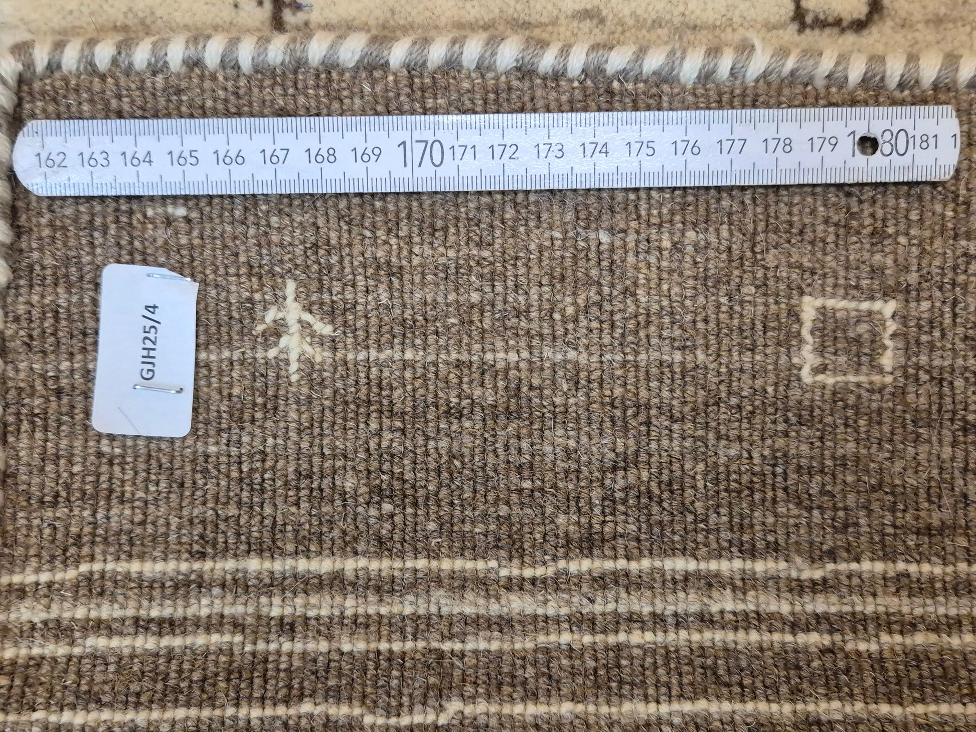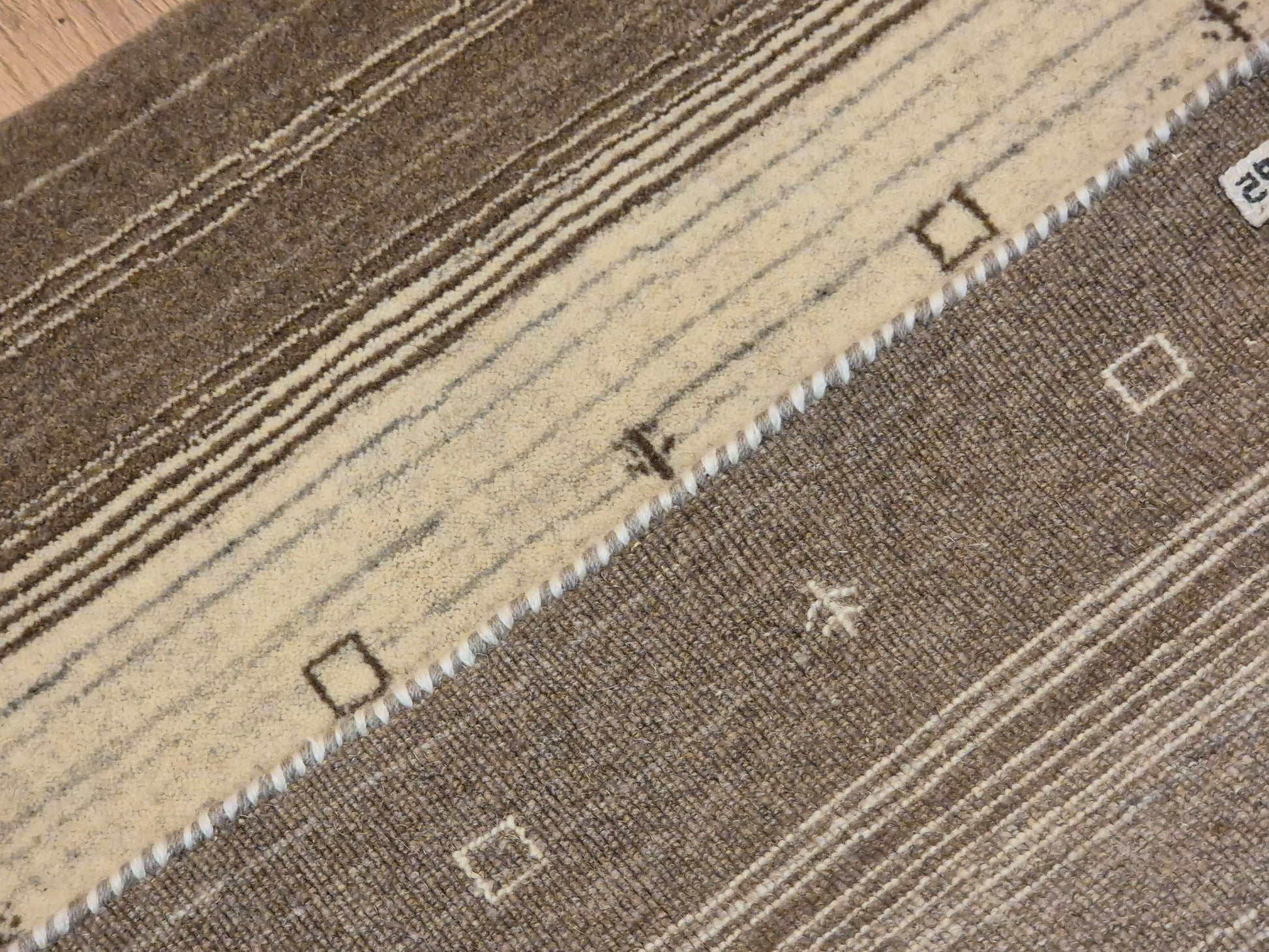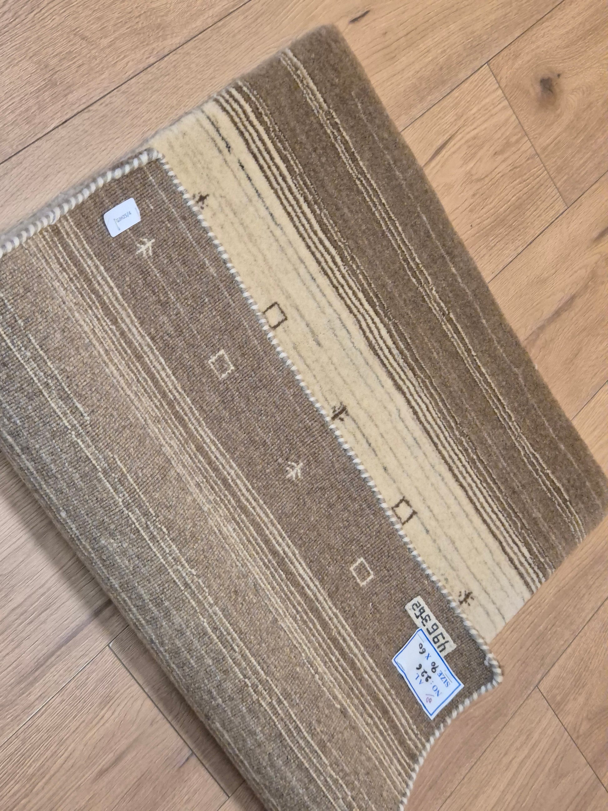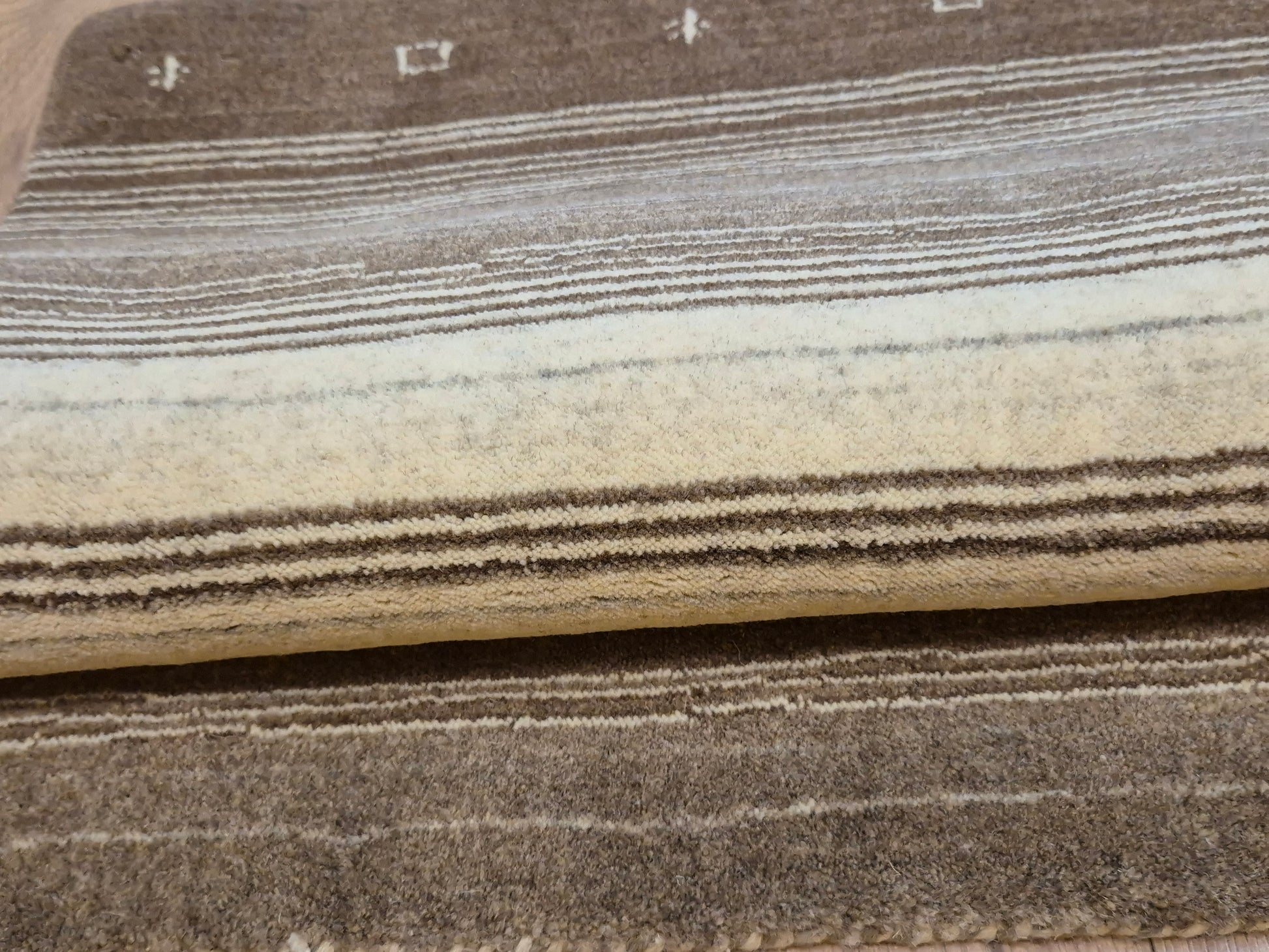 angeboten wird ein handgeknüpfter Perser Gabbeh Teppich aus reiner Schurwolle. Dieser Teppich besticht durch sein naturbelassenes Streifenmuster in warmen Brauntönen, kombiniert mit einer hellen Mittelpartie. Dezente geometrische Symbole und kleine abstrahierte Motive lockern die schlichte Gestaltung auf und verleihen dem Stück einen unverwechselbaren Charakter.