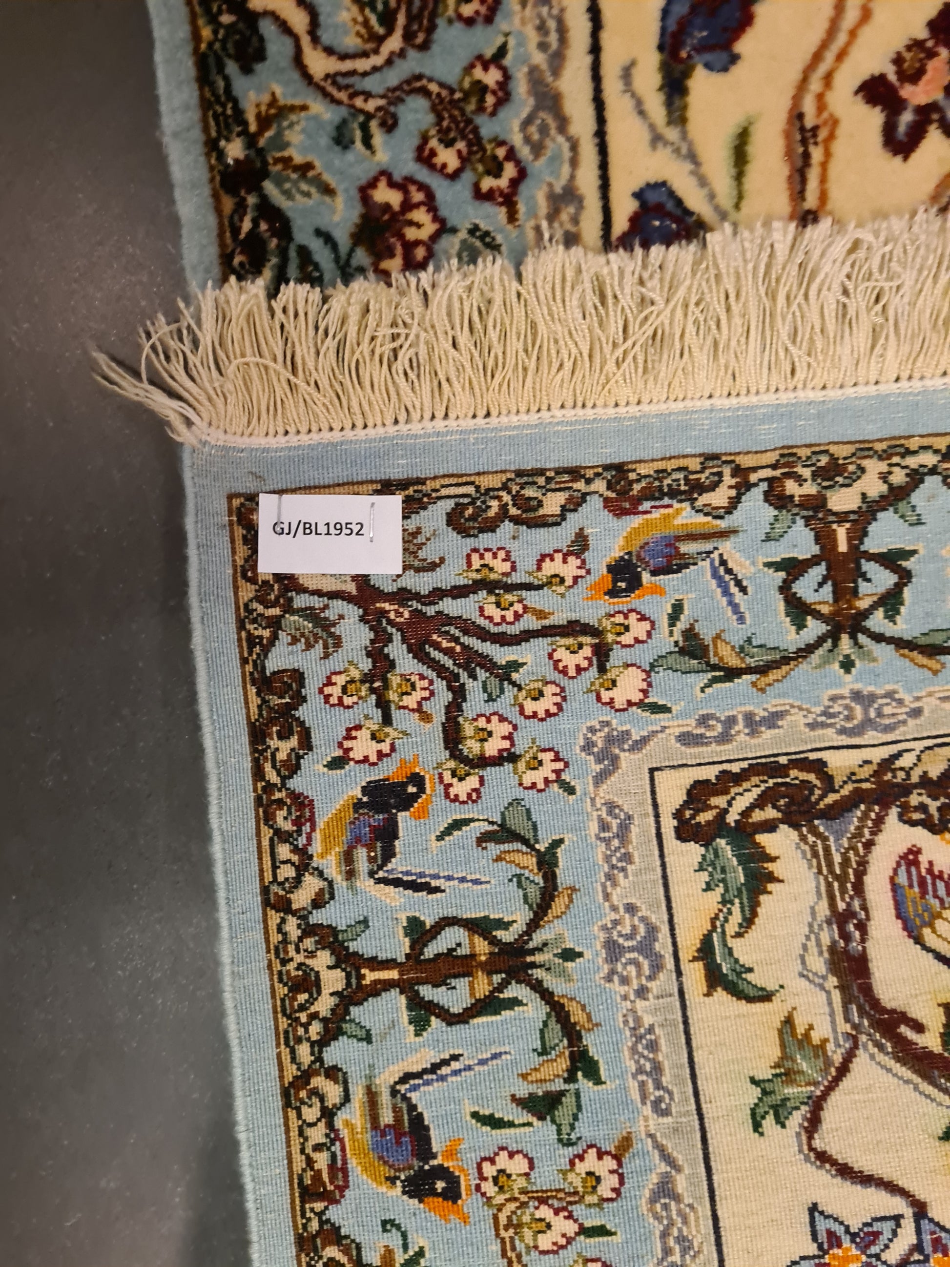 Beschreibung: Dieser königliche Isfahan Palast Teppich ist ein Symbol von Luxus und Eleganz. Die Kombination aus feinster Korkwolle und edler Seide auf Seide, gepaart mit einer beeindruckenden Knotendichte von 1.000.000 Knoten pro Quadratmeter, macht diesen Teppich zu einem unvergleichlichen Kunstwerk. Das detailreiche Blumenmuster und die leuchtenden Farben verleihen jedem Raum eine erhabene Atmosphäre.