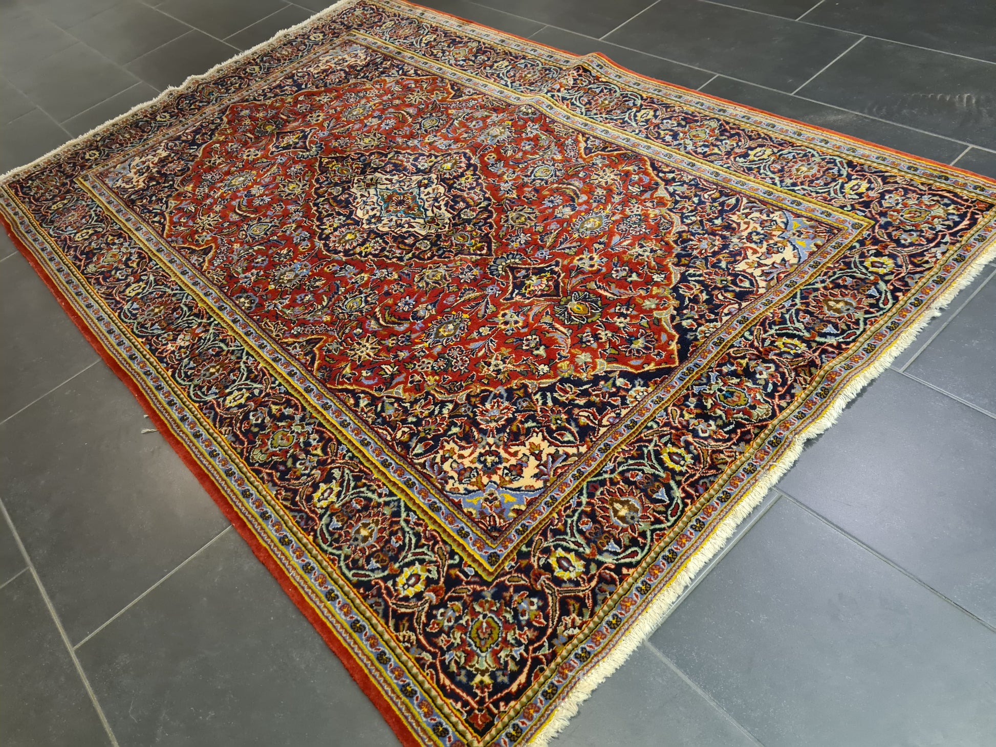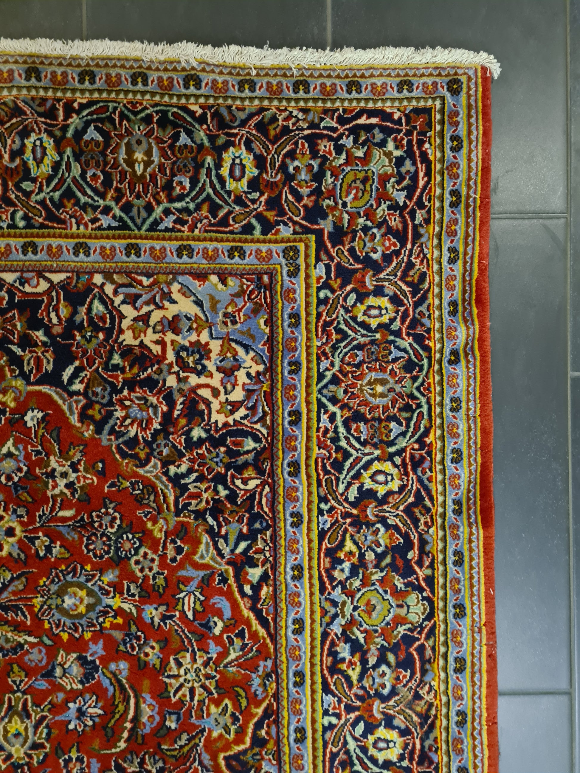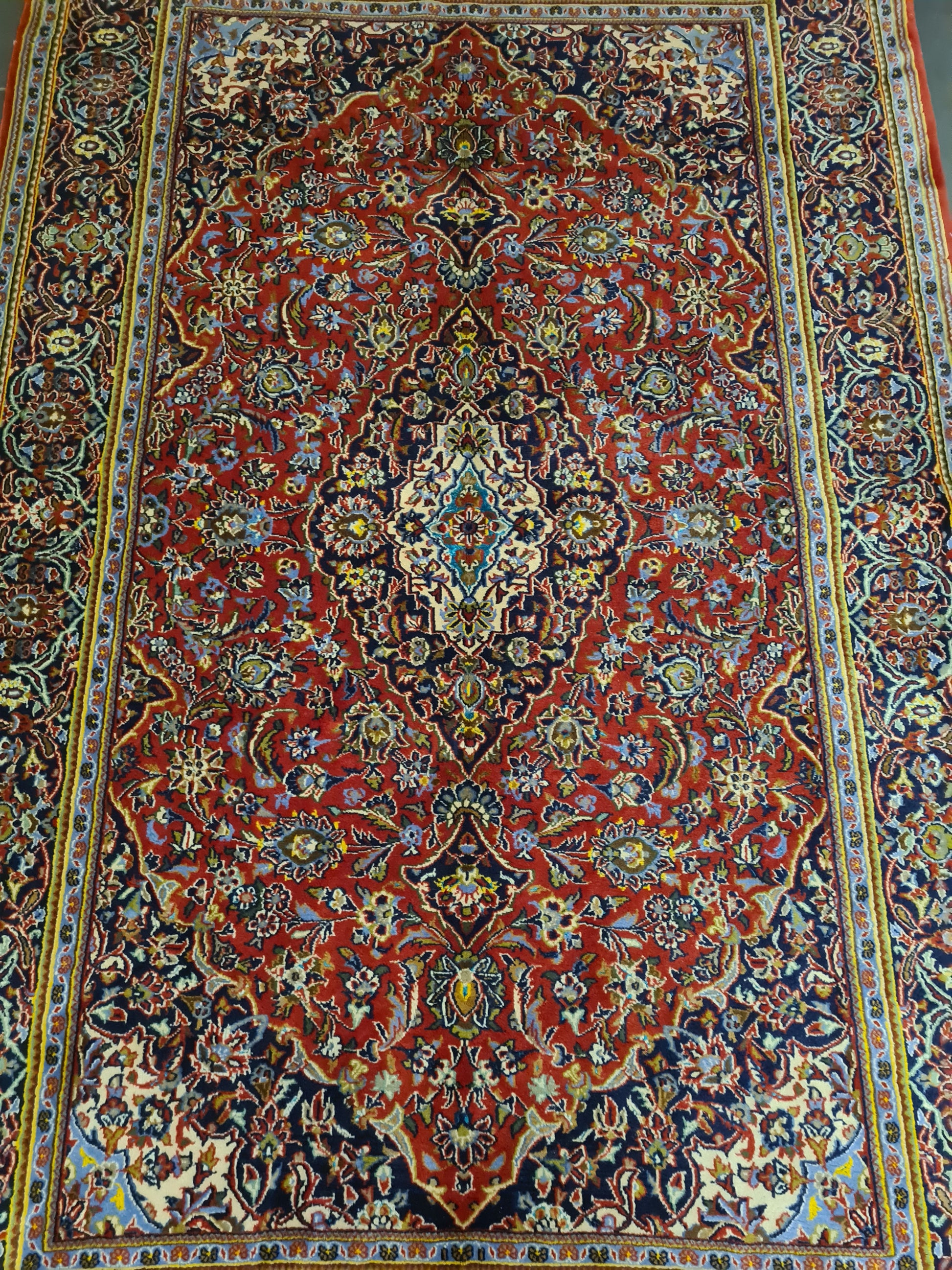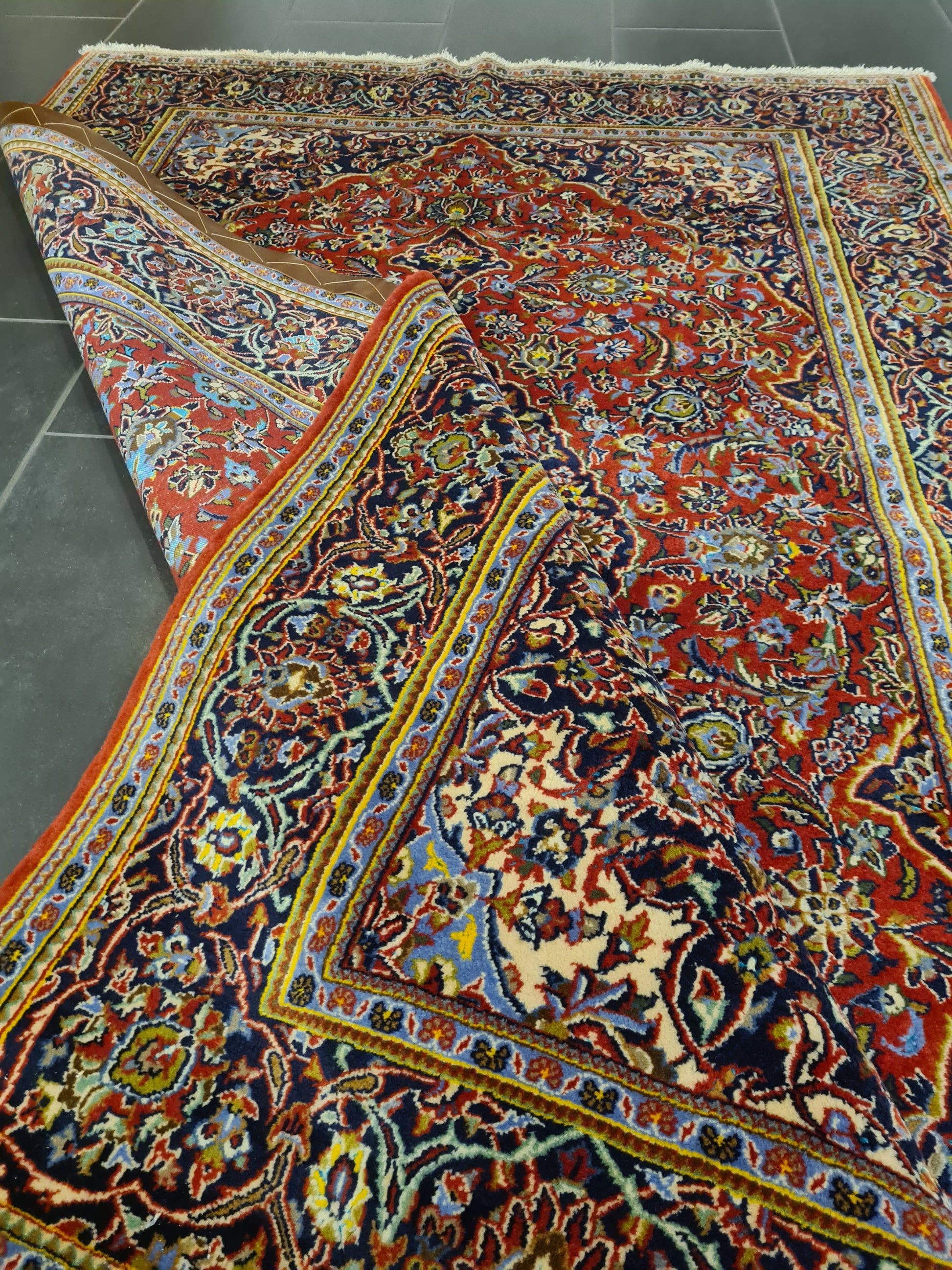 Ein einzigartiger persischer Keshan-Teppich, der traditionelle Handwerkskunst und edle Materialien vereint.