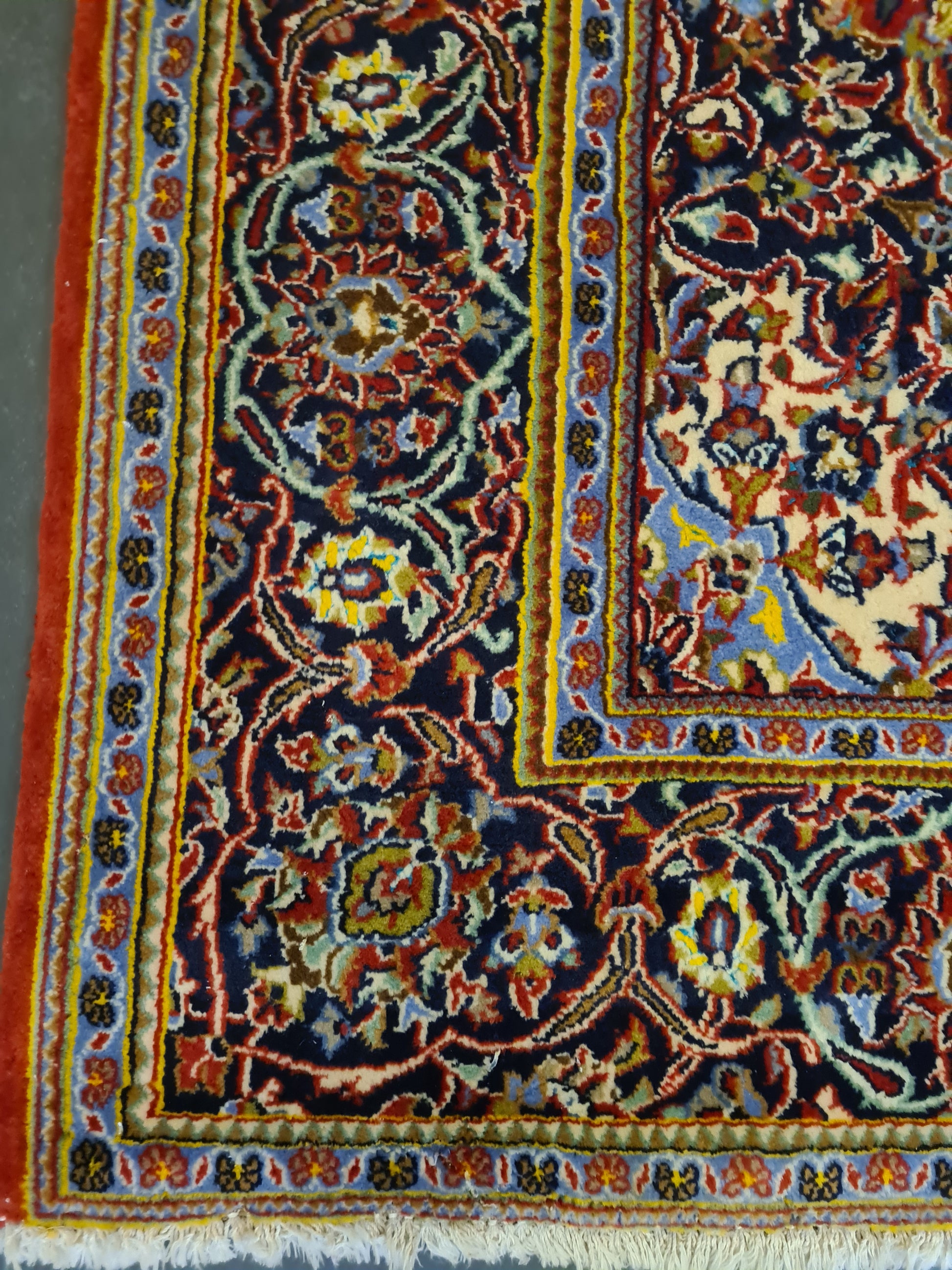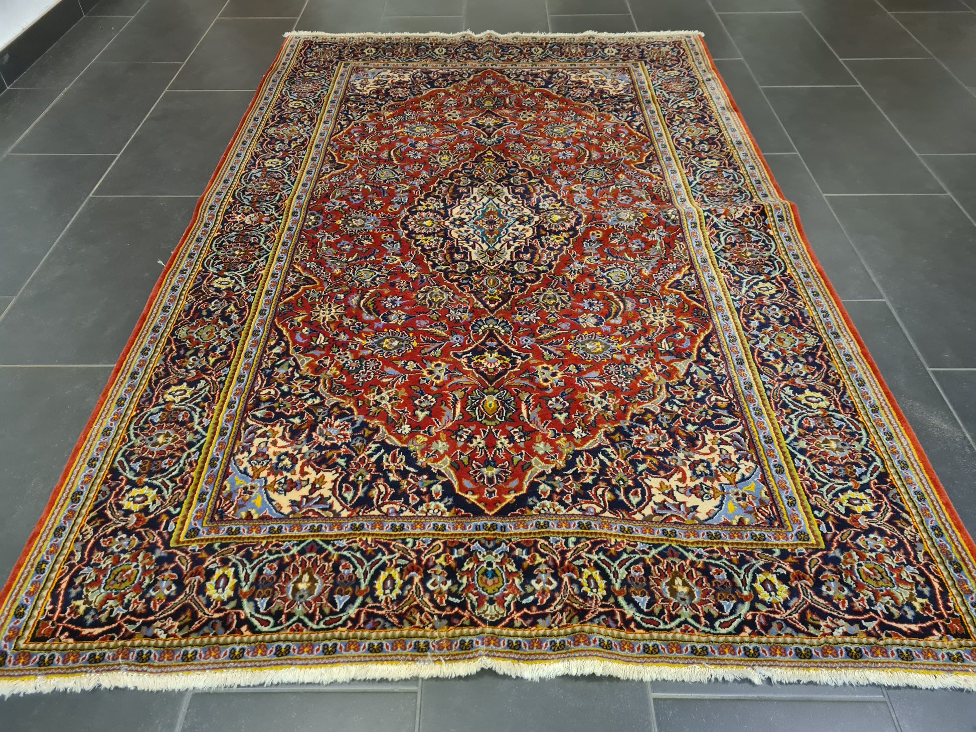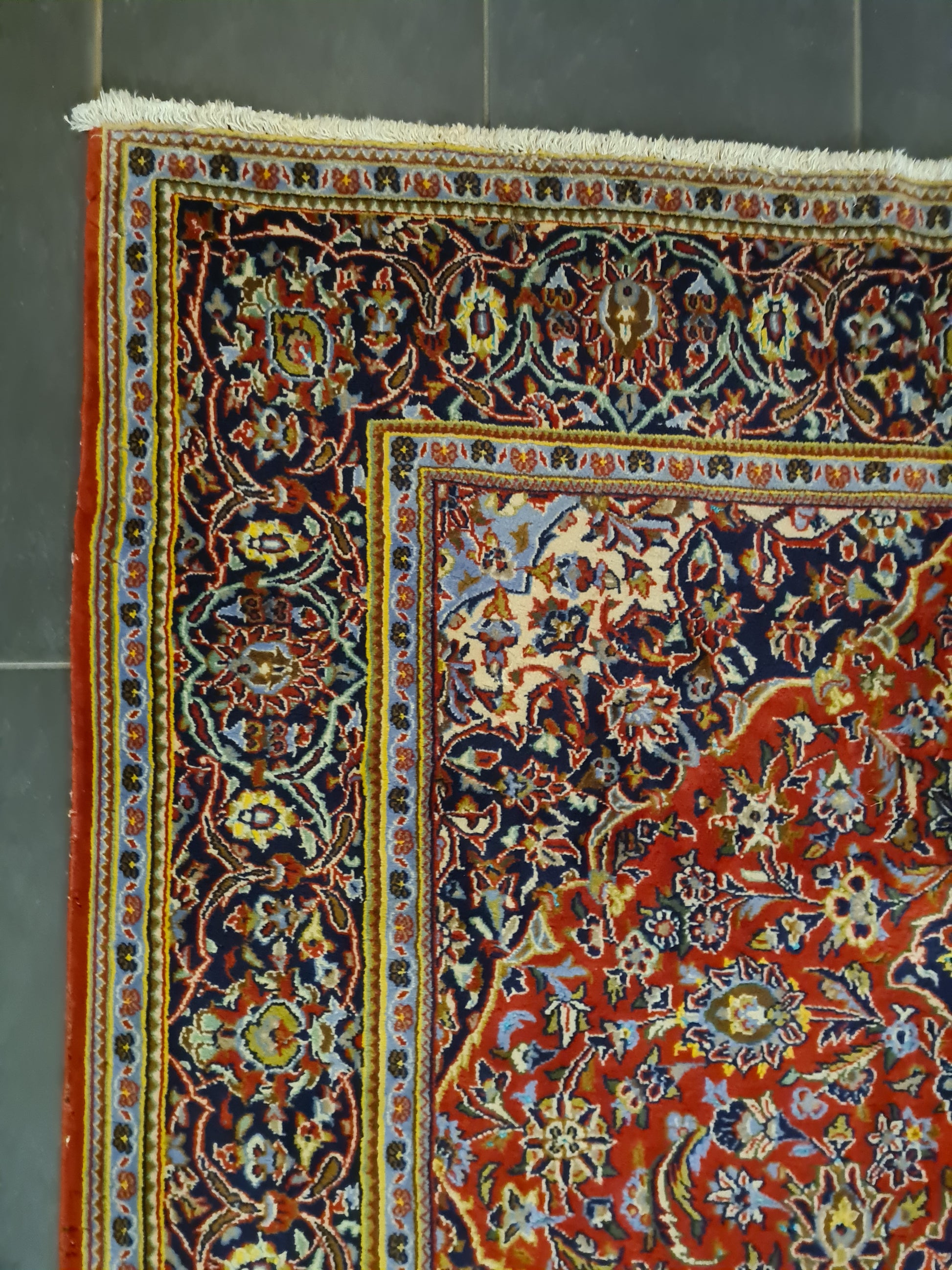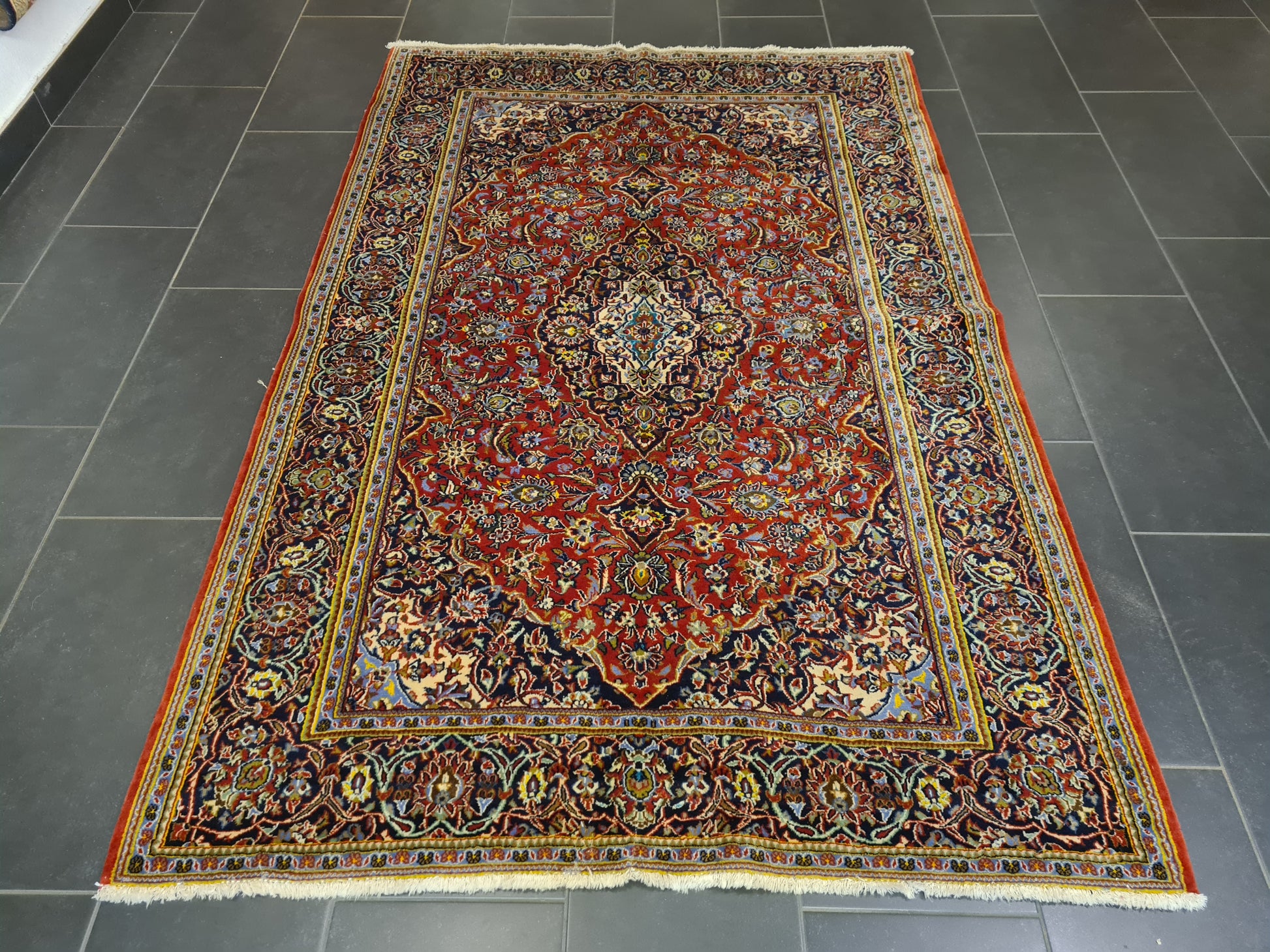 Ein einzigartiger persischer Keshan-Teppich, der traditionelle Handwerkskunst und edle Materialien vereint.