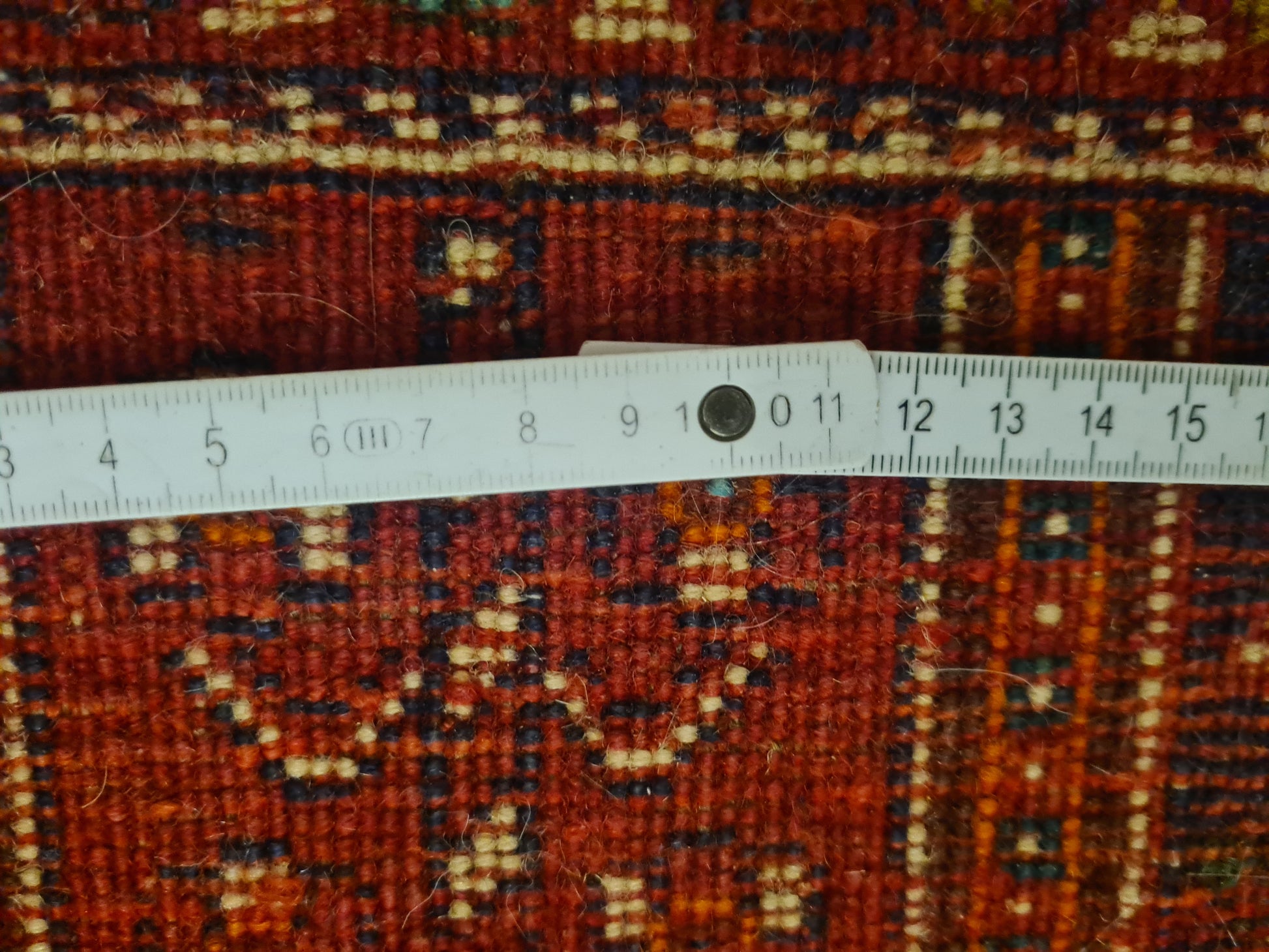 Guter, antiker Zustand mit schöner Patina. Leichte altersbedingte Gebrauchsspuren, die den authentischen Charakter des Teppichs unterstreichen. Die Bilder sind Teil der Zustandsbeschreibung.