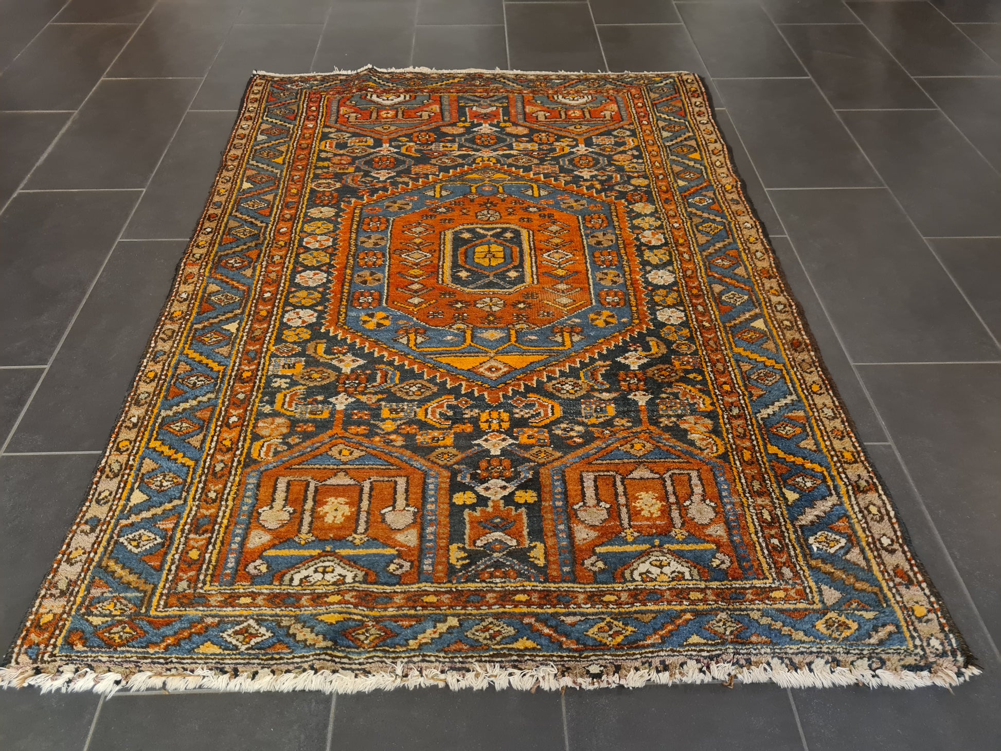 angeboten wird ein antiker Perserteppich aus der Region Malaya. Der Orientteppich ist handgeknüpft, zeichnet sich durch seine fein gearbeitete Knüpfung und die typische traditionelle Musterung aus und besticht durch warme, harmonisch aufeinander abgestimmte Farben. Ein echtes Sammlerstück mit dekorativem Charakter.