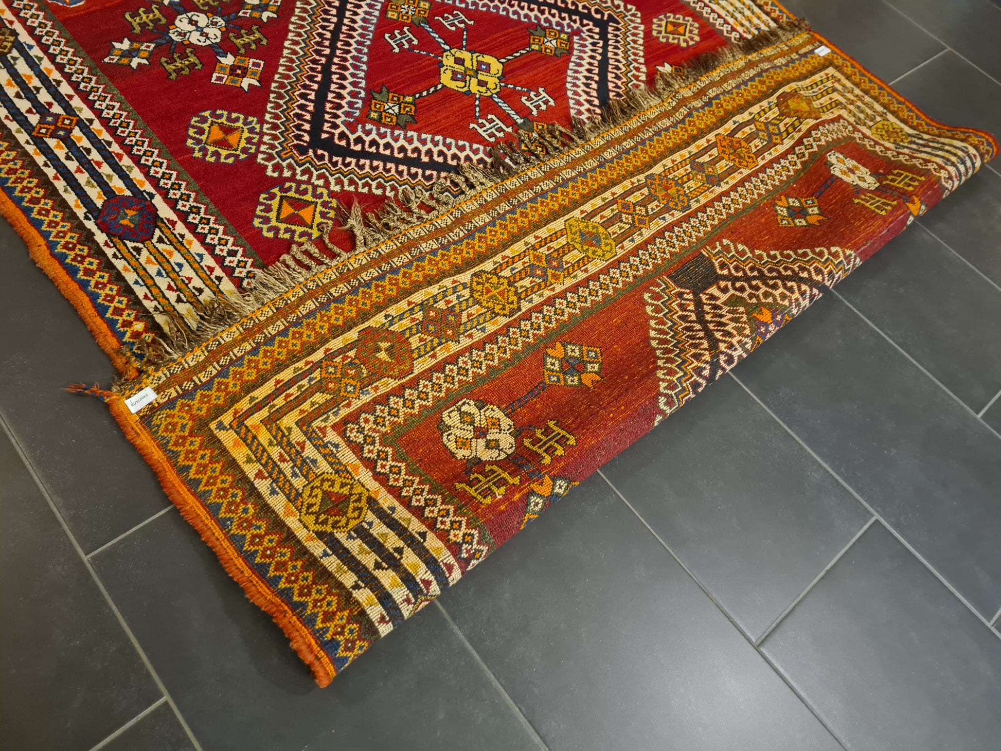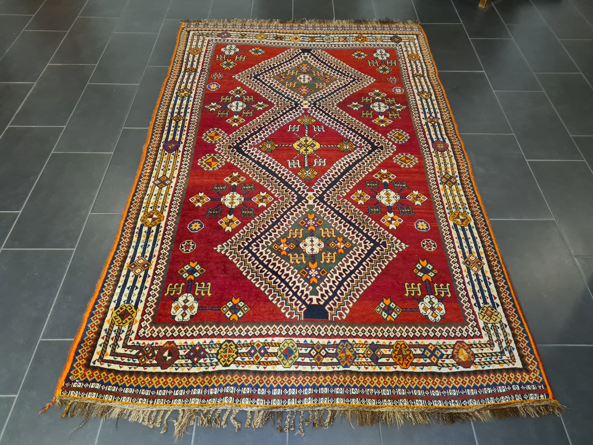 angeboten wird ein handgeknüpfter antiker Perserteppich aus der Region Shiraz. Das Stück besticht durch seine traditionelle Knüpfkunst, feine Muster und eine warme, authentische Farbgebung. Ein Sammlerteppich mit Charakter, der sich sowohl als Bodenbelag wie auch als dekoratives Kunstwerk eignet.